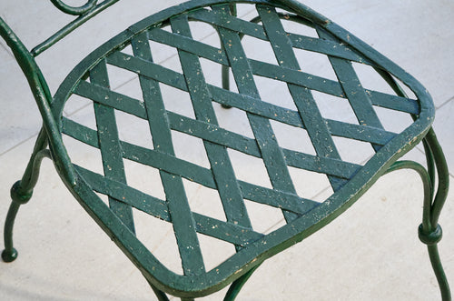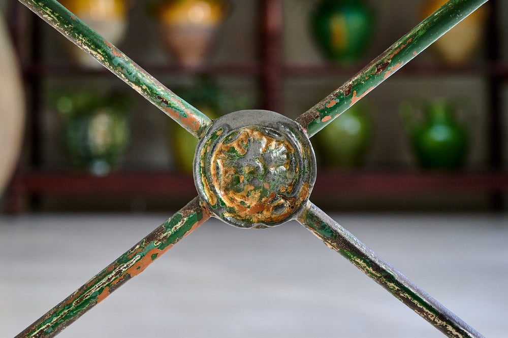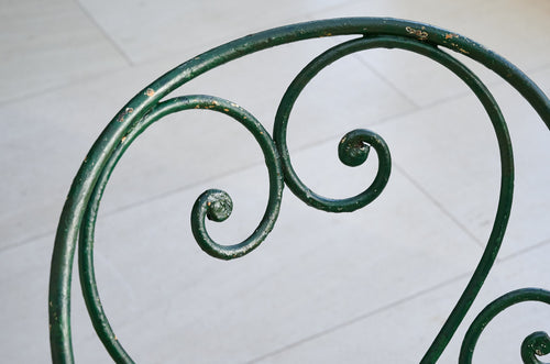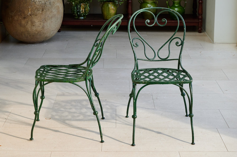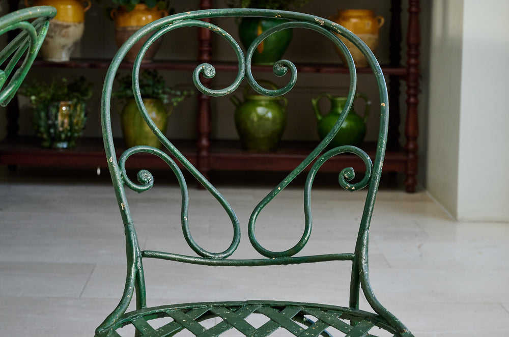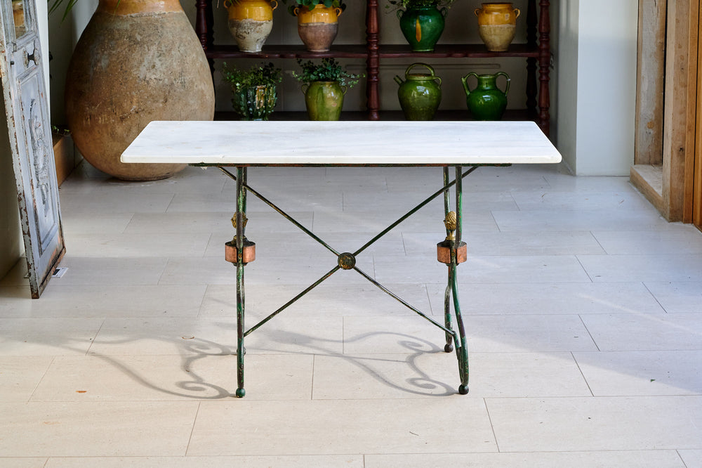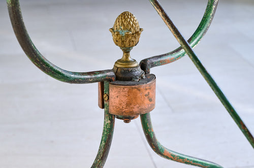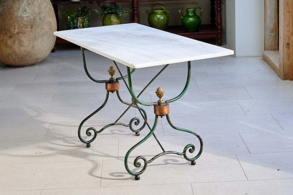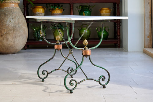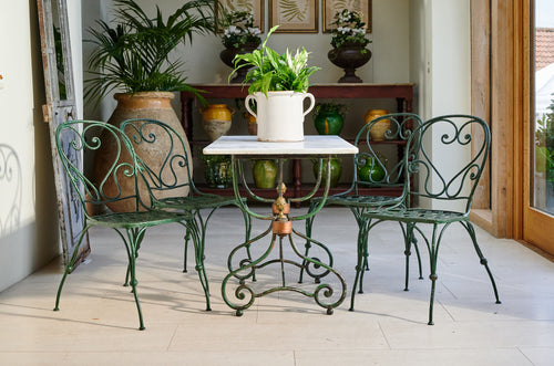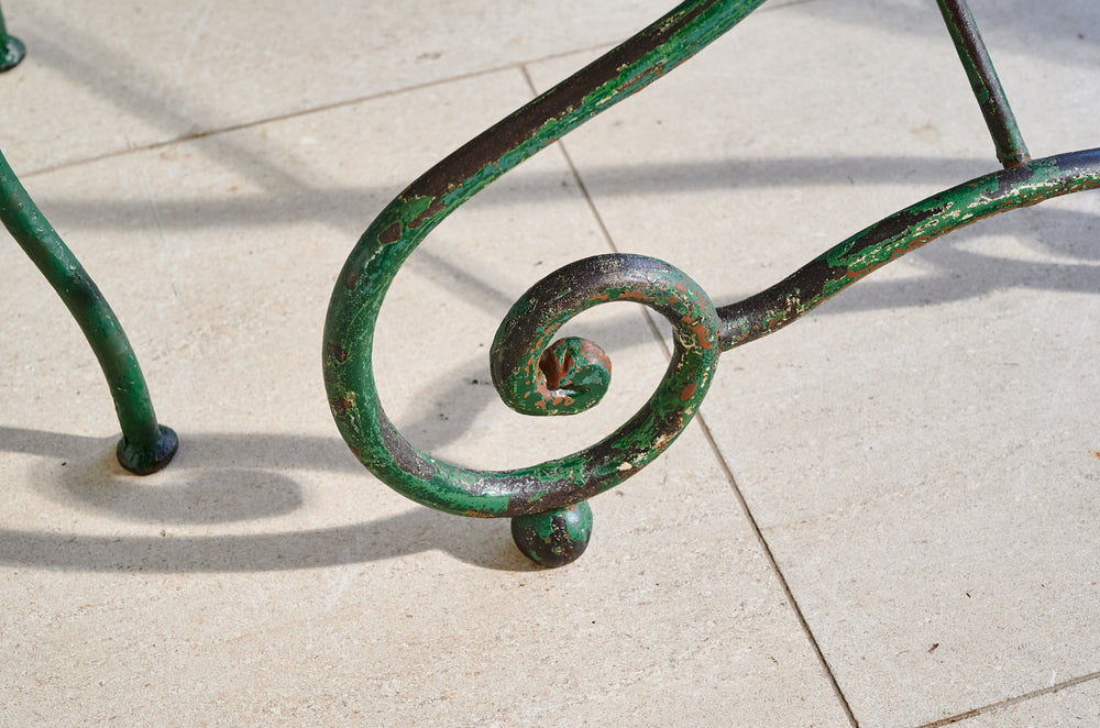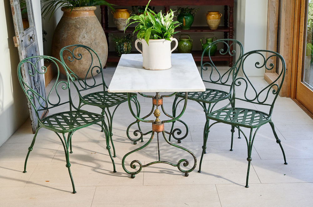 An attractive 19th-century garden set hand-forged in wrought iron with original paint and marble tabletop. A pair of bronze pineapple finials add interest to the set that could be used inside or out.