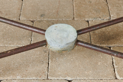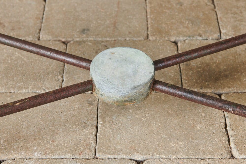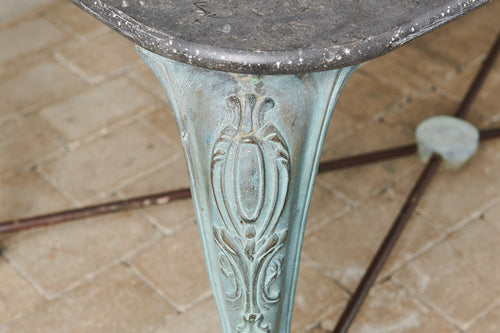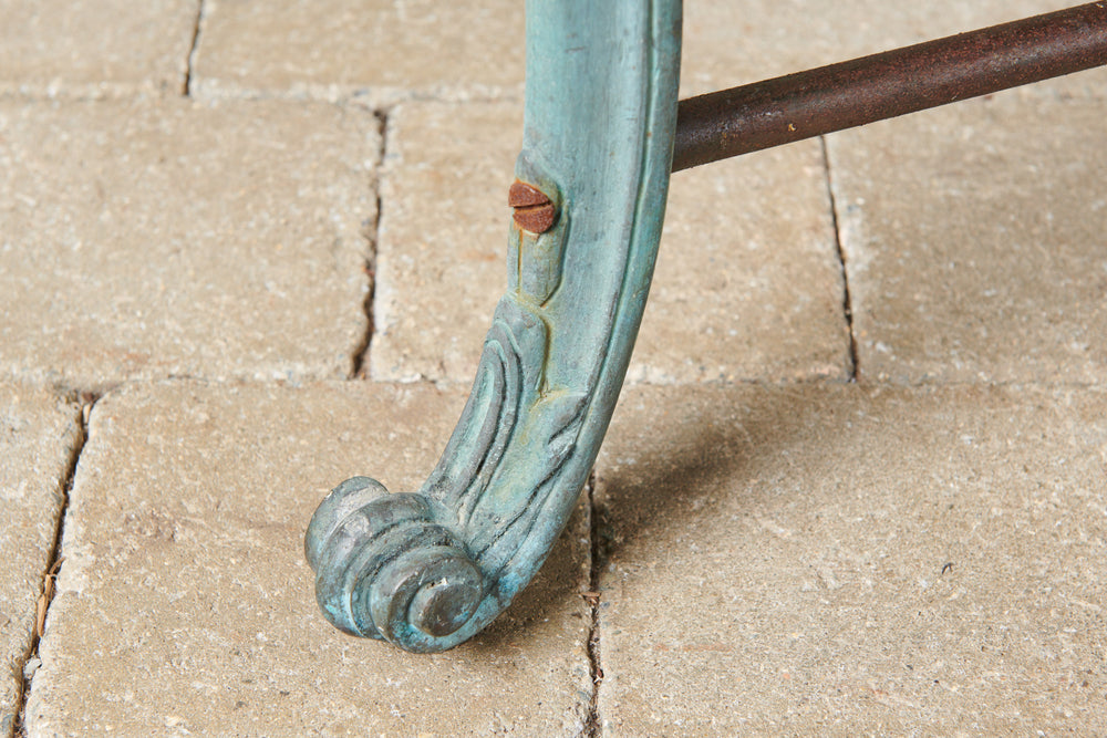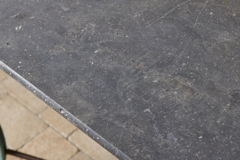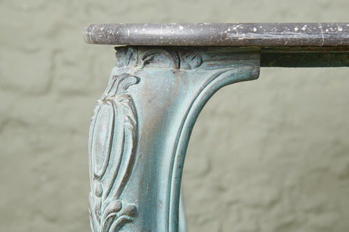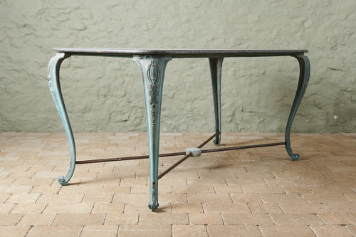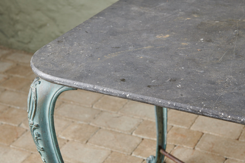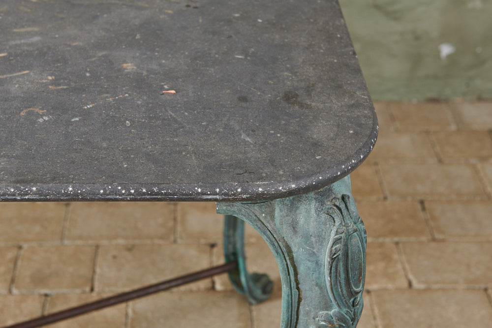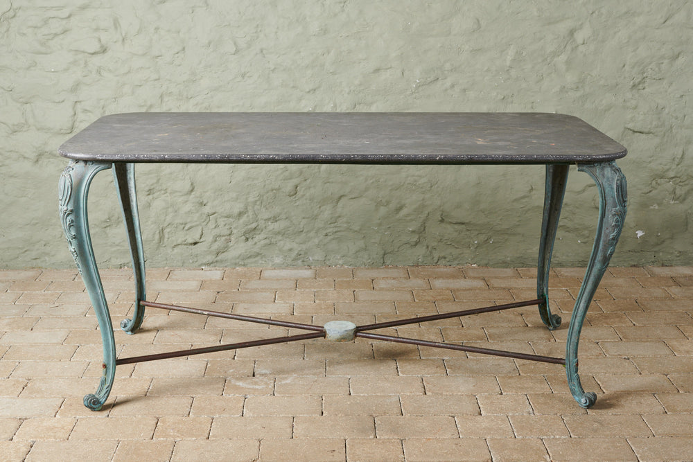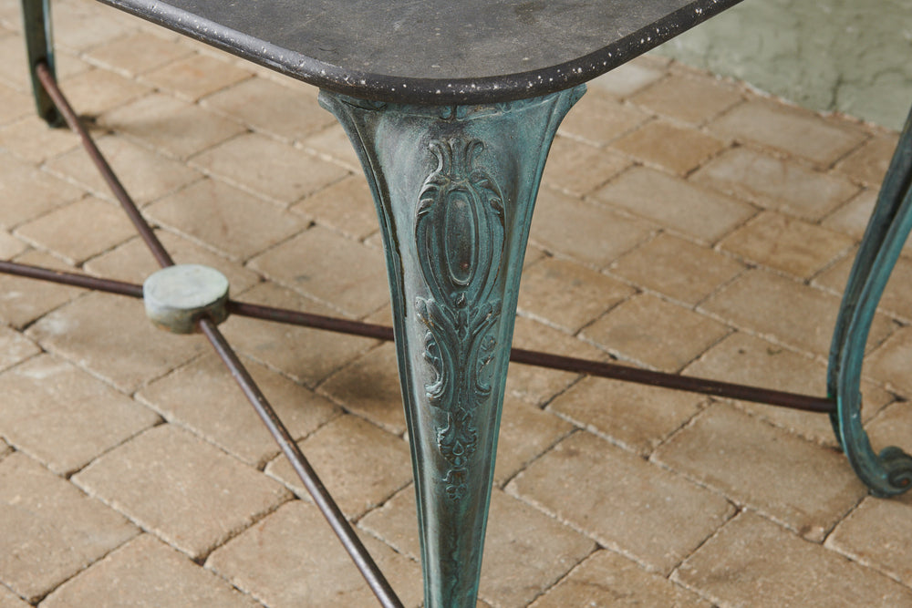A stunning Italian dining table with bronze legs and a natural stone top in very good condition. The legs have developed a natural blue patina and are attached to a well built wrought iron frame. Made in the early 20th century this lovely table would easily seat 8 people.