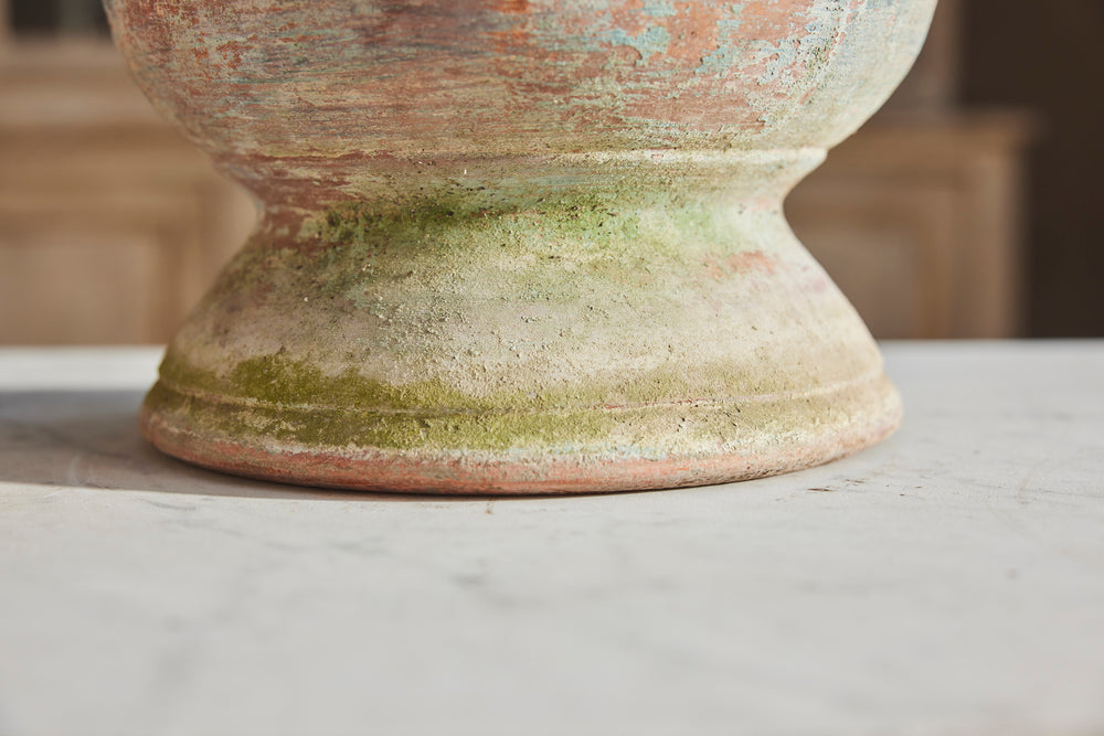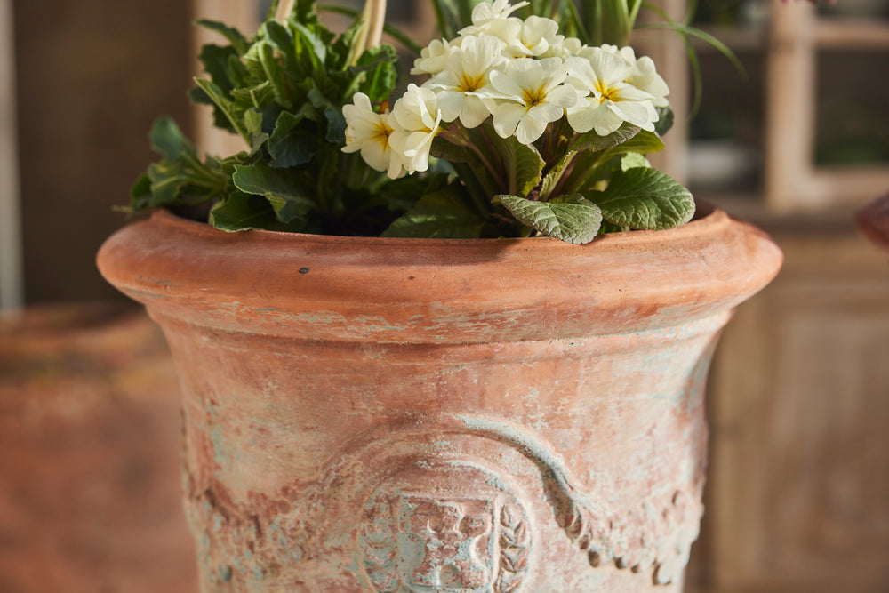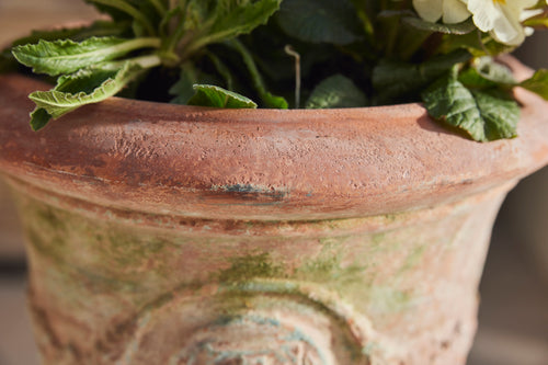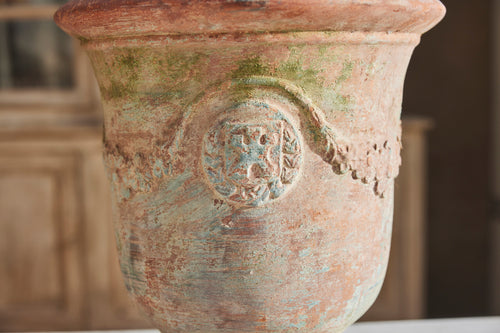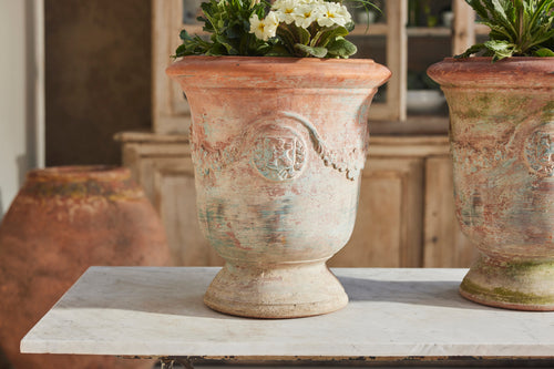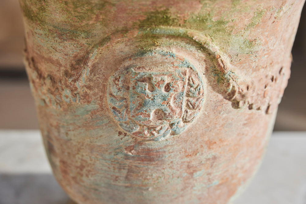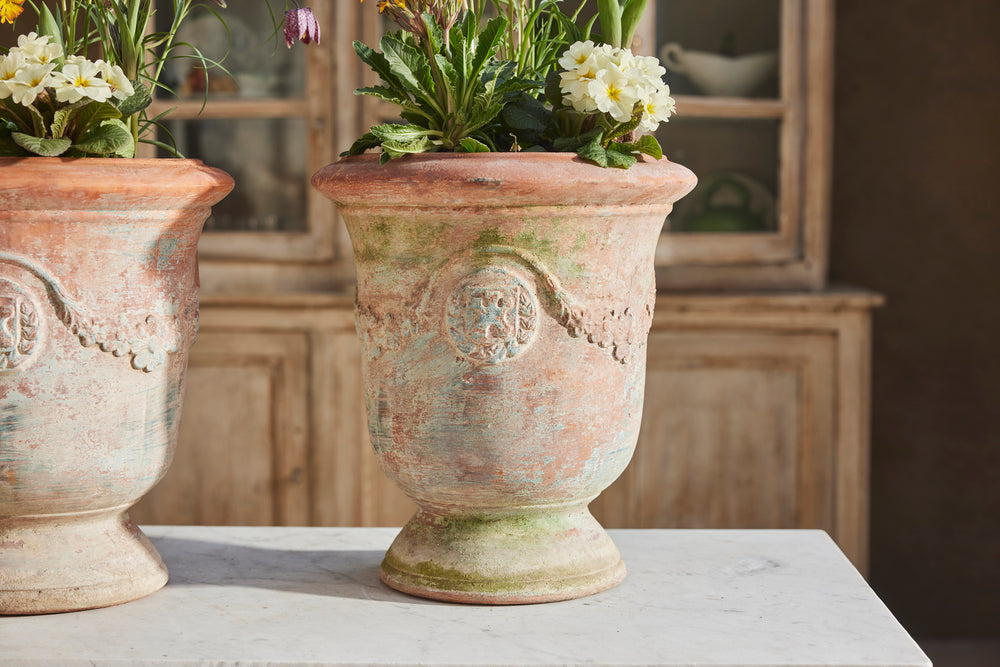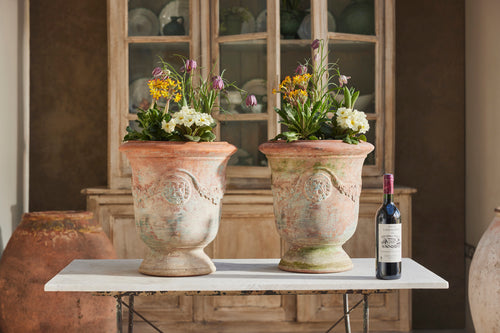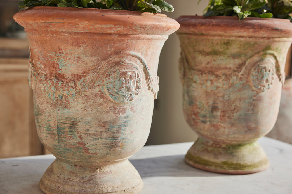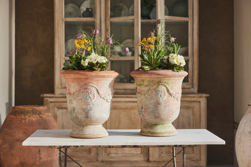 A perfectly proportioned pair of Italian terracotta planters with an elegant shape, adorned with decorative floral garlands and a distinctive motif marking the potter’s atelier. Handcrafted with traces of original paint, they remain in excellent condition. Sold per pair, with three pairs available.