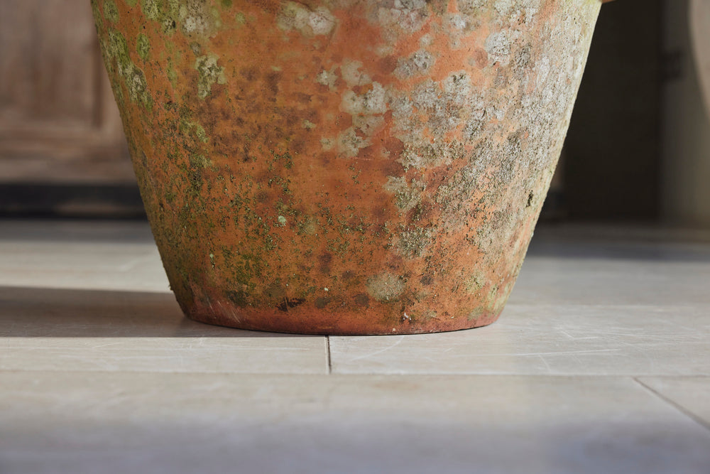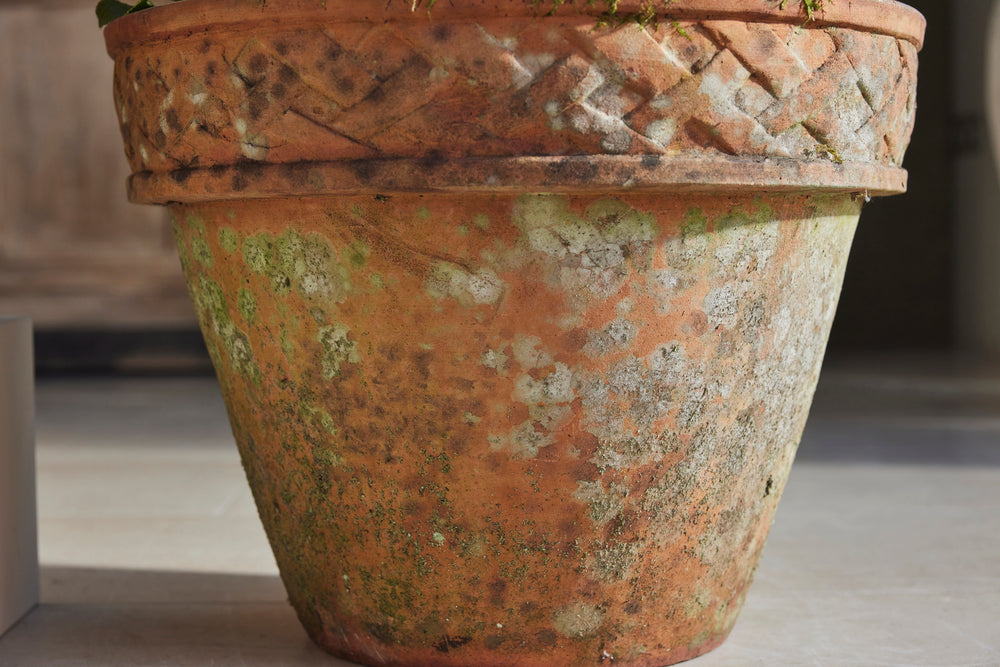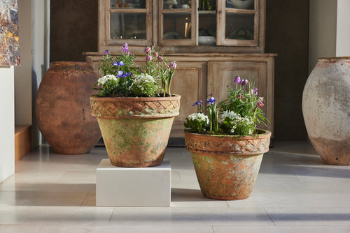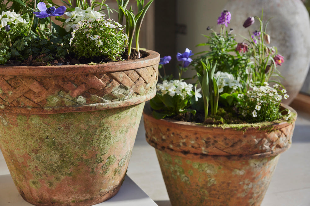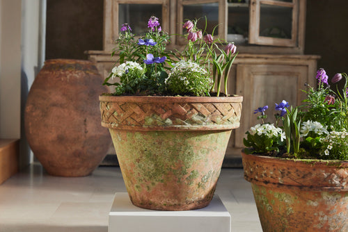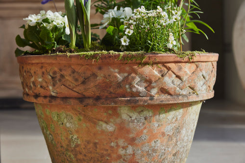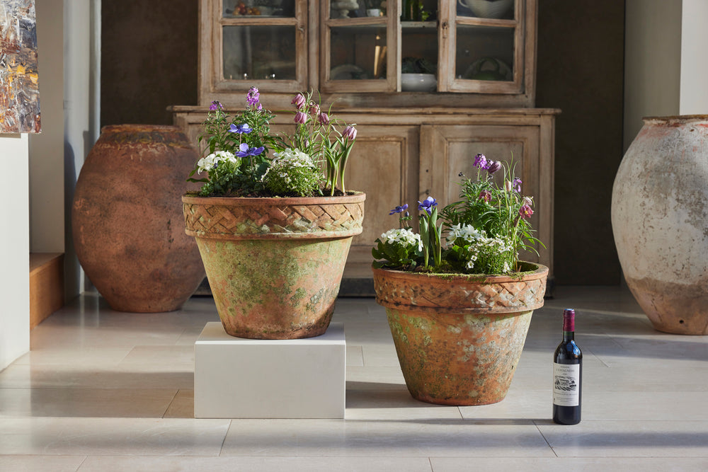 These Italian terracotta flower pots feature unusual lattice-style rims and are naturally weathering so they would blend effortlessly into any mature gardens.
