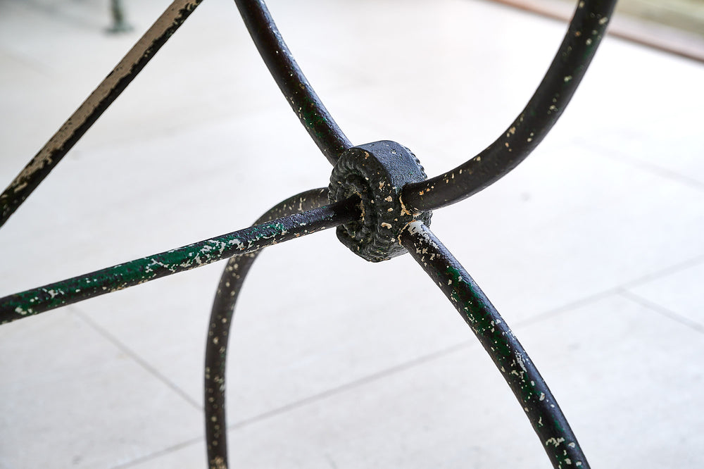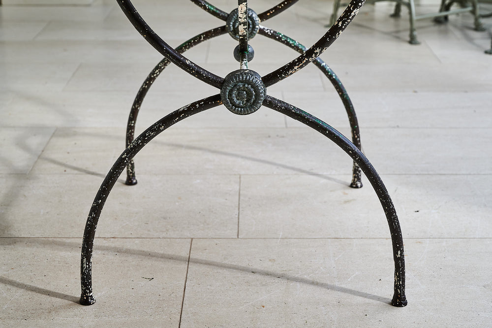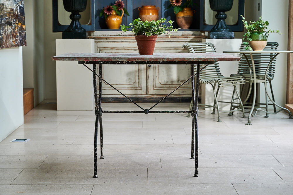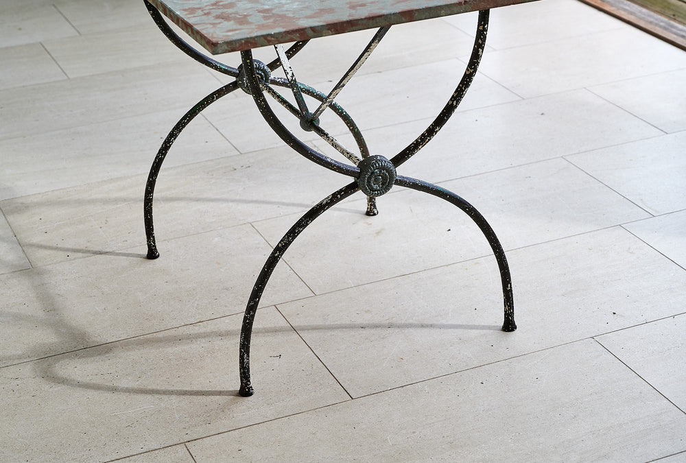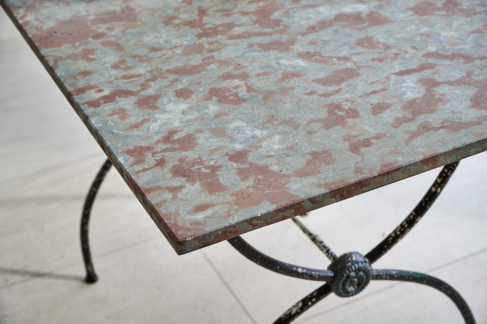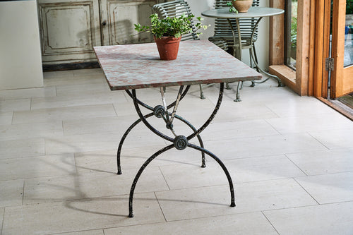 A very attractive 19th century wrought iron table with a marble top. With a curved frame joined with lead macrons this table could be used both inside and in the garden. The attractive top is typical of marble found only in the Languedoc region of France.