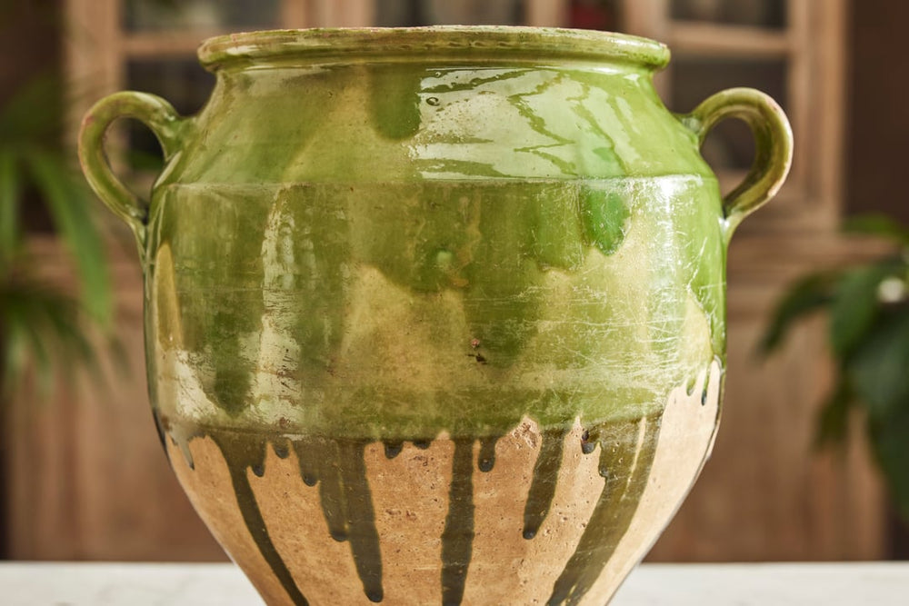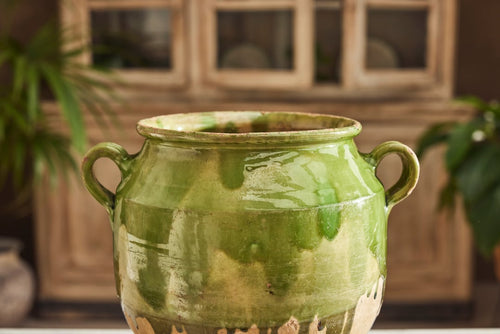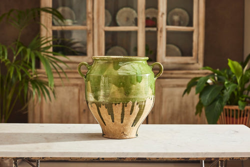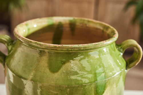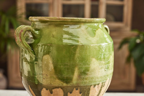 A lovely and increasingly rare example of a large 19th-century French confit pot, finished in a vibrant green drip glaze with beautiful natural ageing.