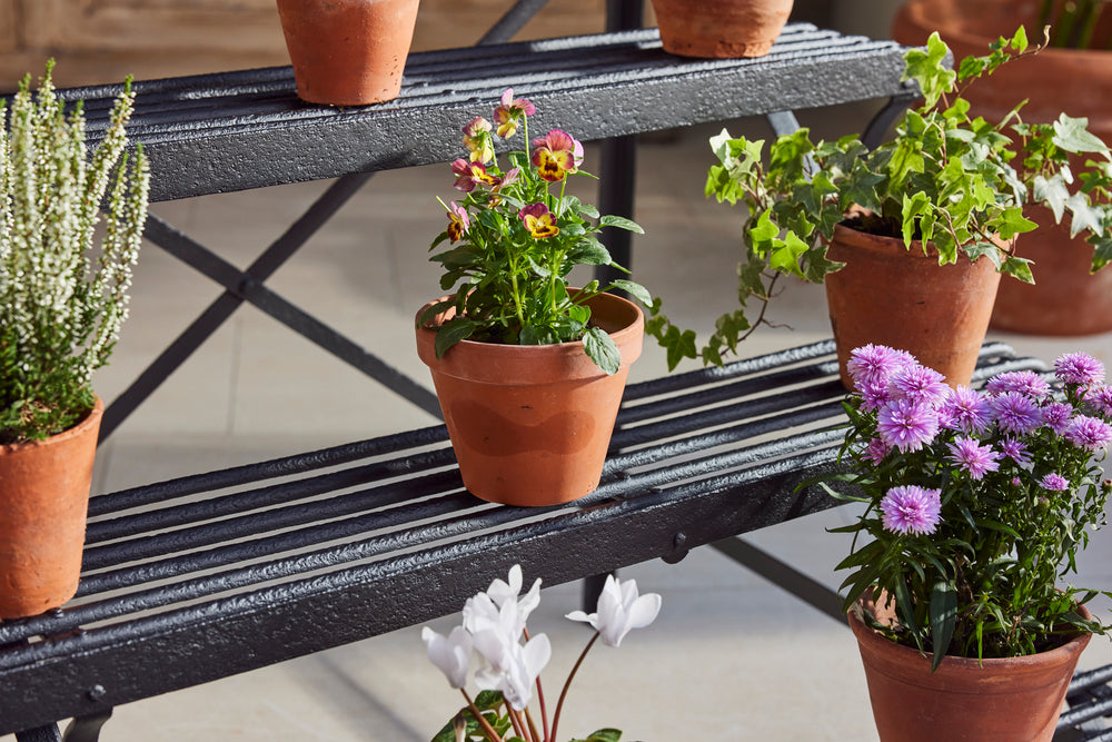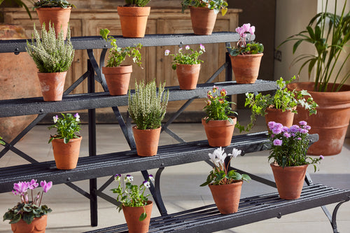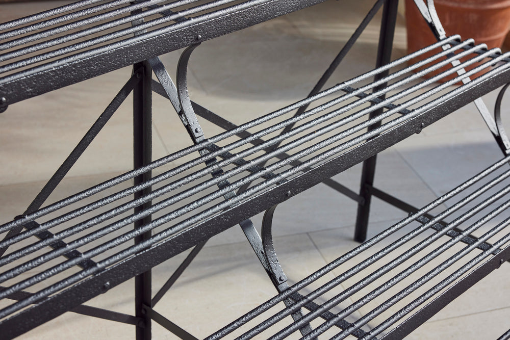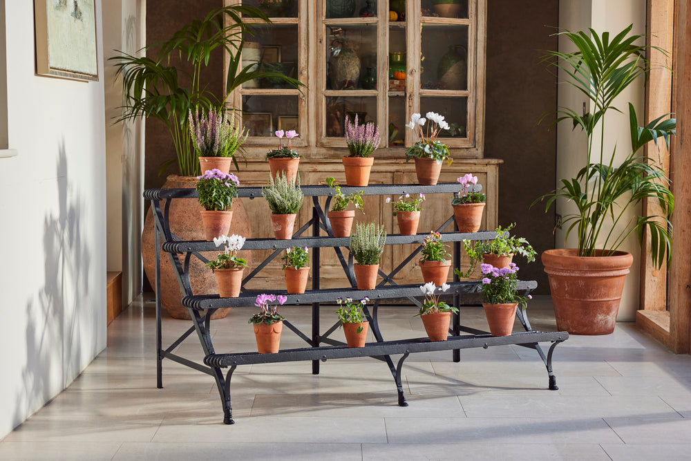 A large Arras plant stand with four tiers. This one was originally designed for displying plants in an orangery. This model by Grassin Baledans was made in the early 20th century using wrought iron semi-hollow tubes and is in very good condition having been fully restored by us. It is a real character item for creating imaginative floral displays.