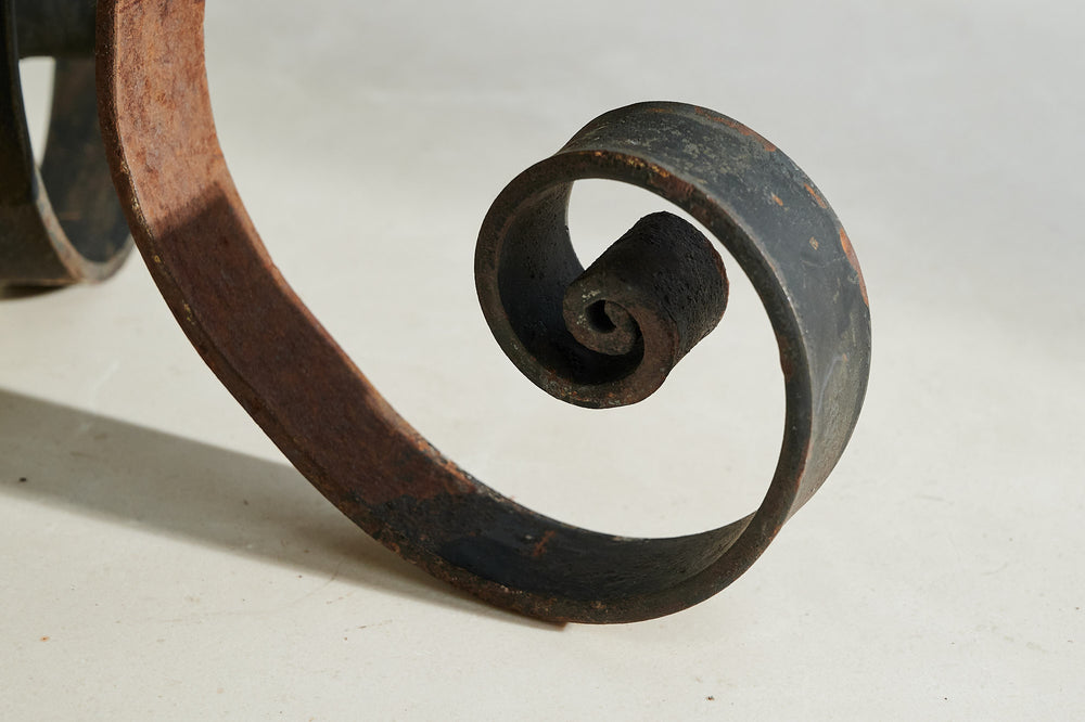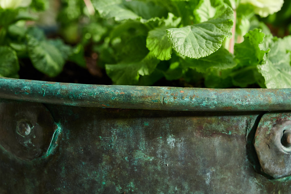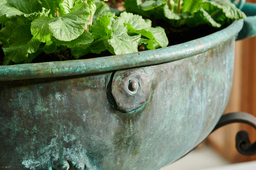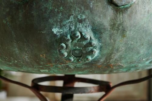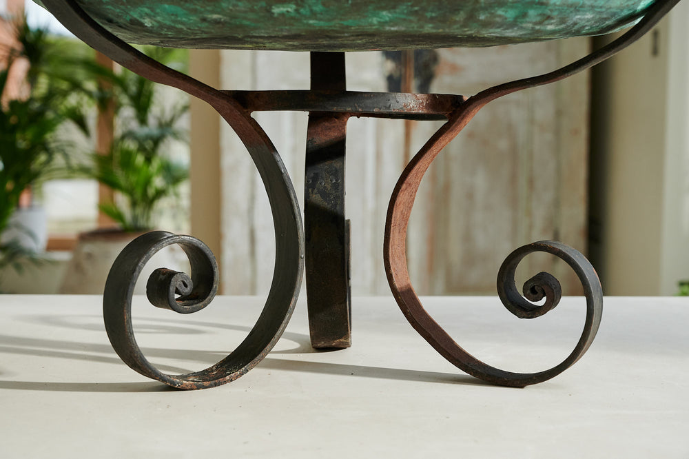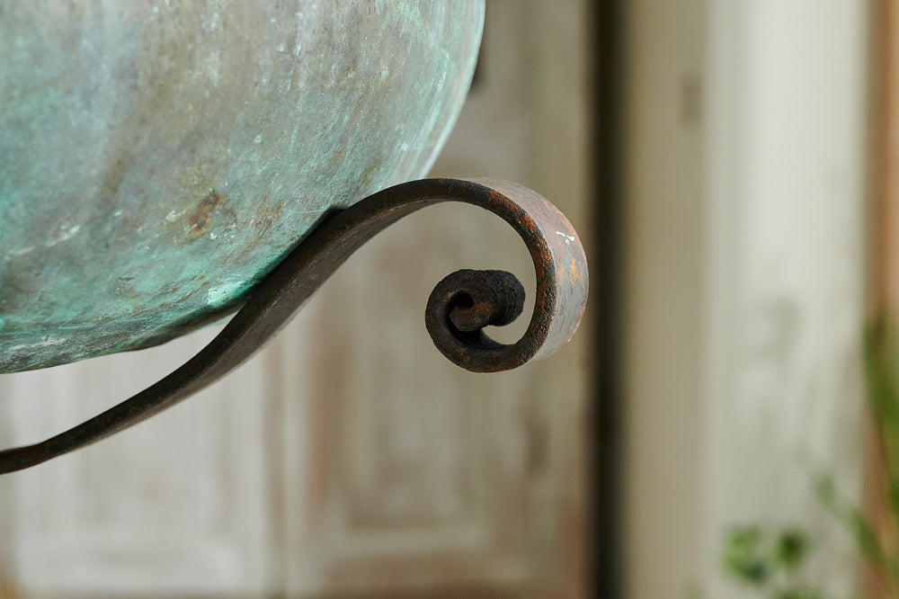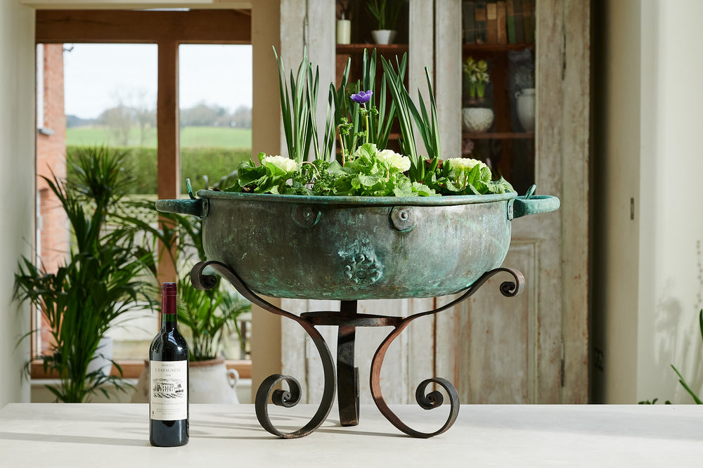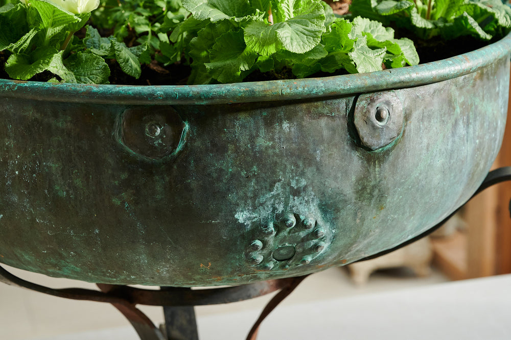 A large copper planter complete with verdigris and drainage holes sitting on a hand forged wrought iron frame. Perfect for seasonal planting.