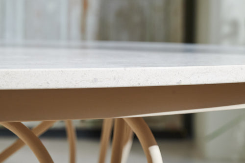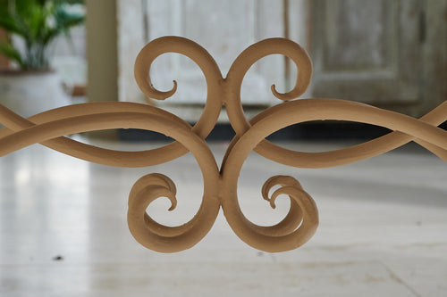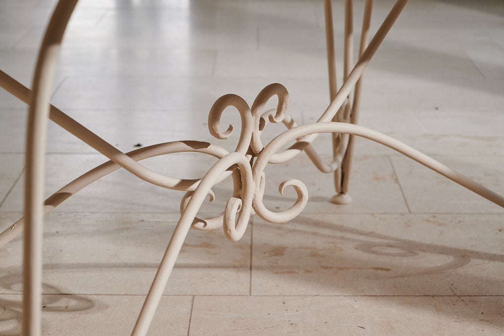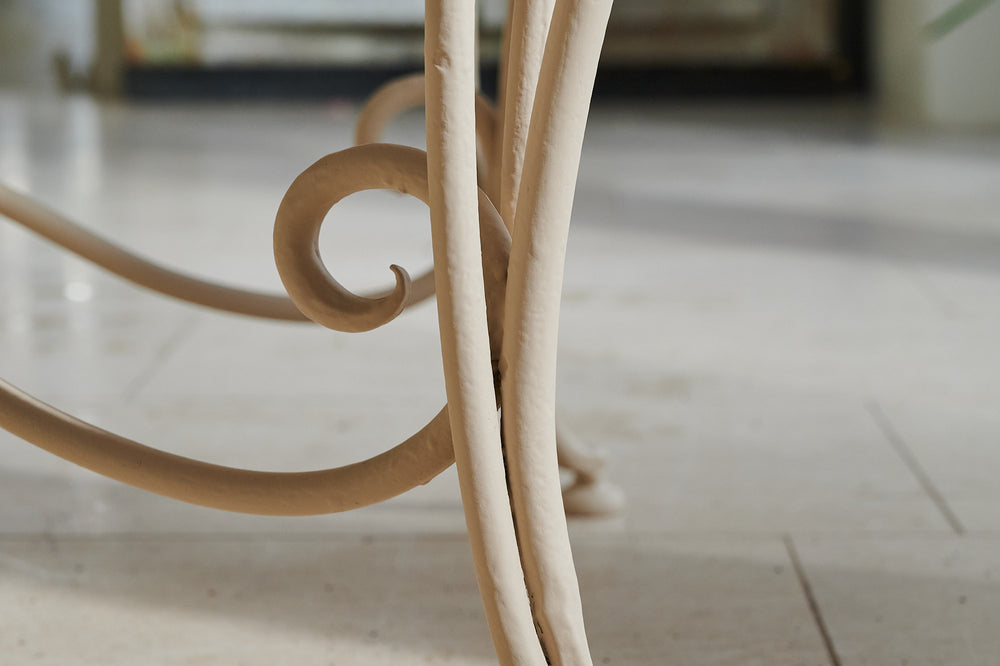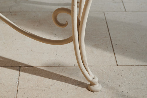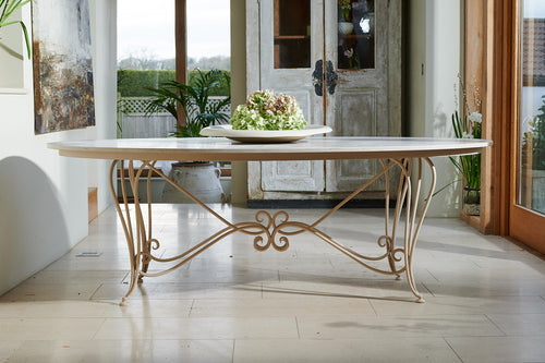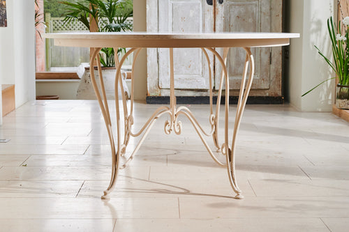 A really lovely mid-20th-century garden table. With a new oval marble top sitting on a hand-forged and very attractive wrought iron base this table would easily seat eight adults.