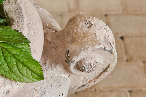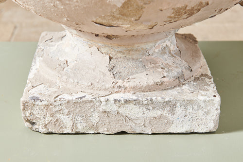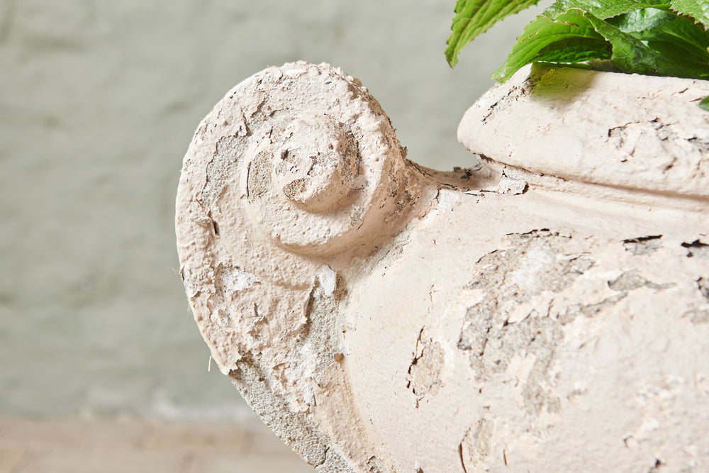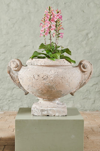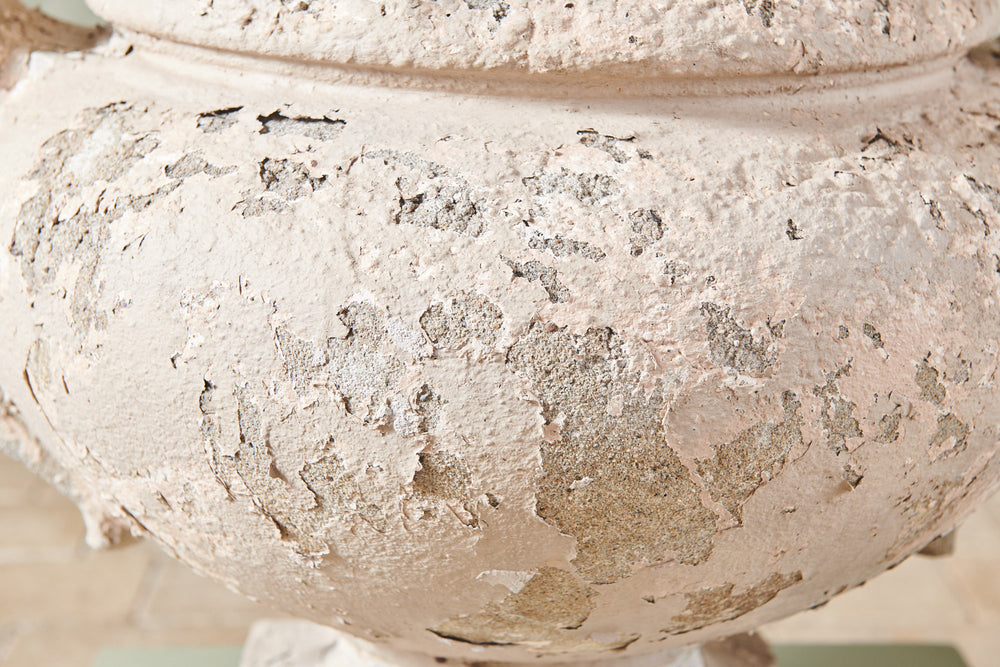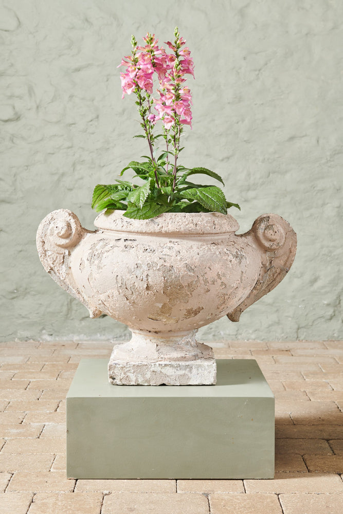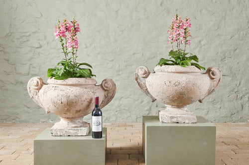 We bought this substantial pair of composite stone planters because we thought the minimalistic design gave them an interesting contemporary look. The design is clearly based on a classic urn and the painted patina is untouched. They are large and impressive enough to stand alone and planted.