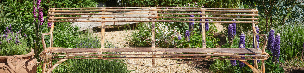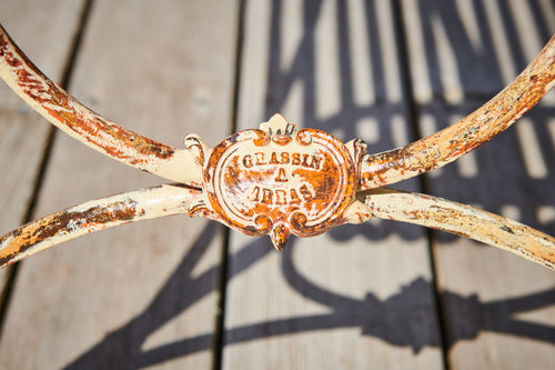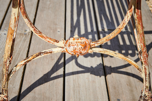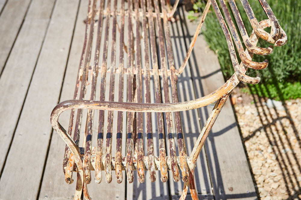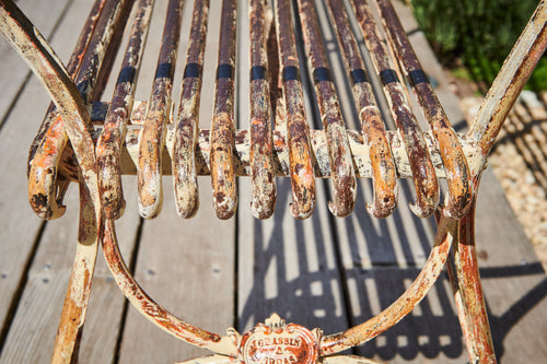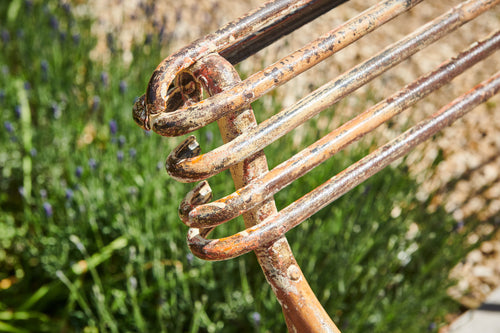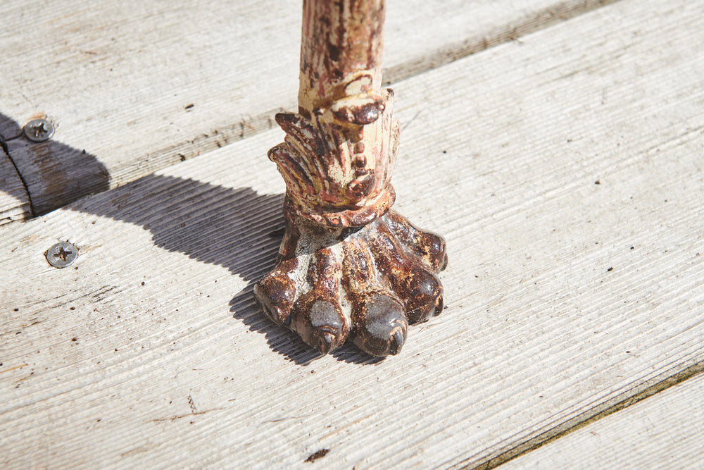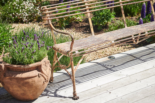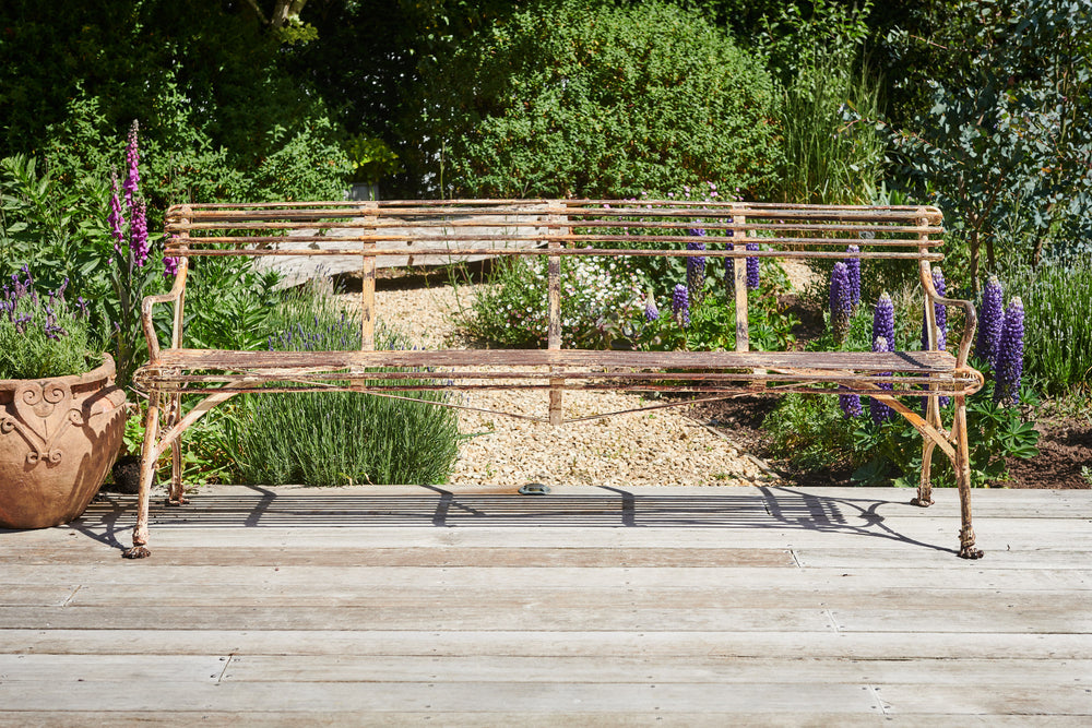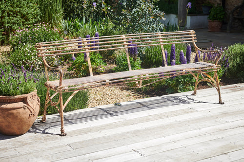 This attractive four-seater Arras bench was manufactured in France in about 1875. The bench is made of half-round hollow wrought iron that characterises the Arras and makes it much lighter than cast iron and easier to move around. It has the larger lion's claw feet which are typical of early Arras furniture.