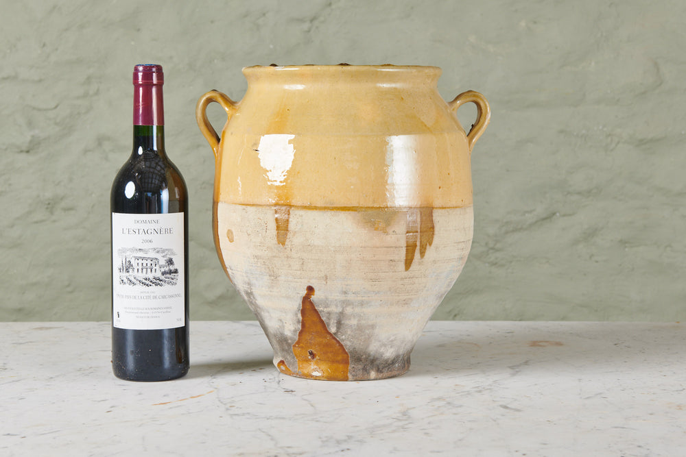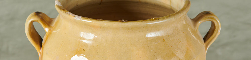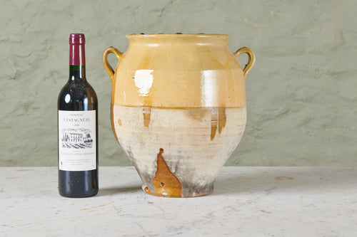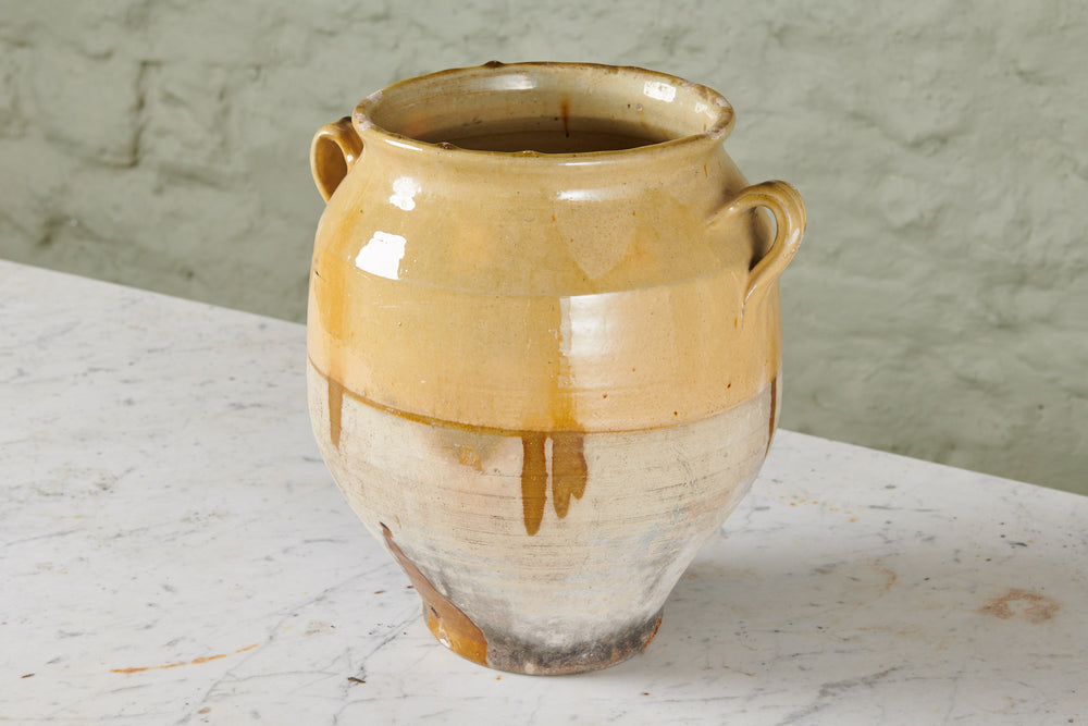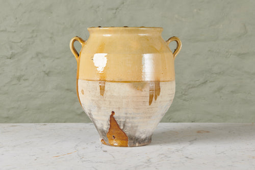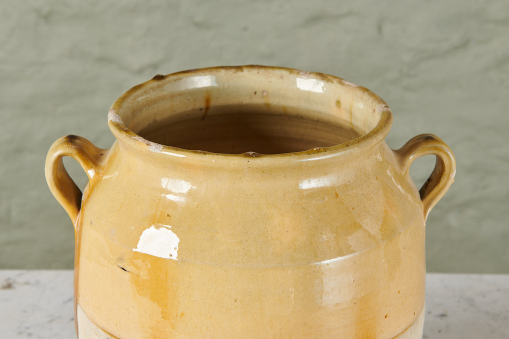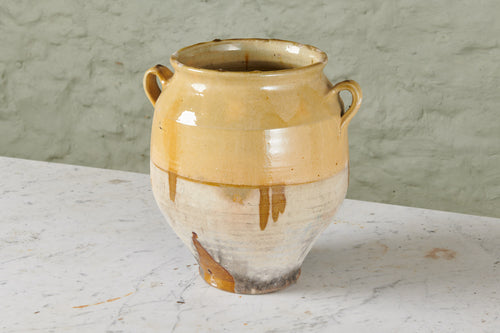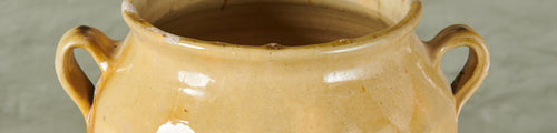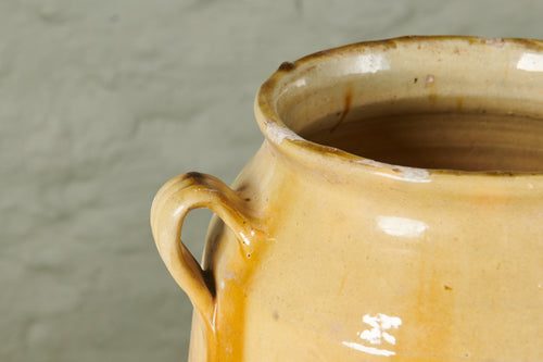 A very attractive confit pot. "Confit" is French for "to preserve" and neat little pots like this one were used for preserving food over the winter. They have a very pleasing shape, with two small handles and a plump round body and make lovely ornaments or small planters.