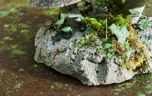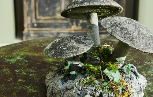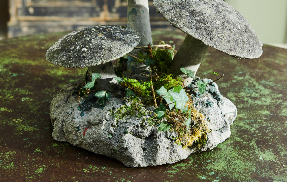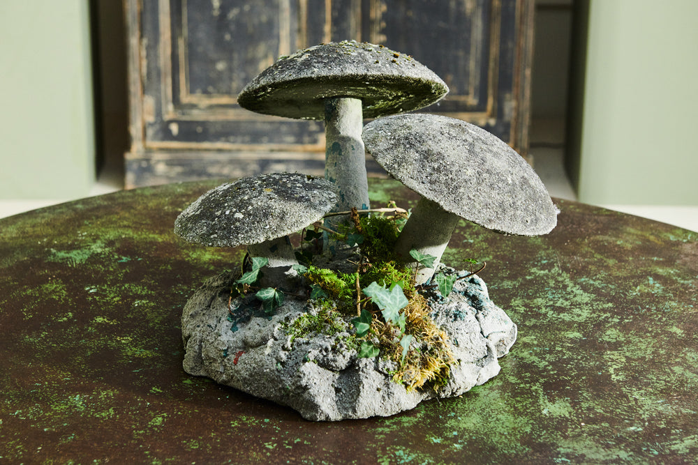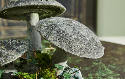 A charming decorative garden mushroom on a composite stone base. With a lovely mossy patina and in very good condition it will add character to any garden.