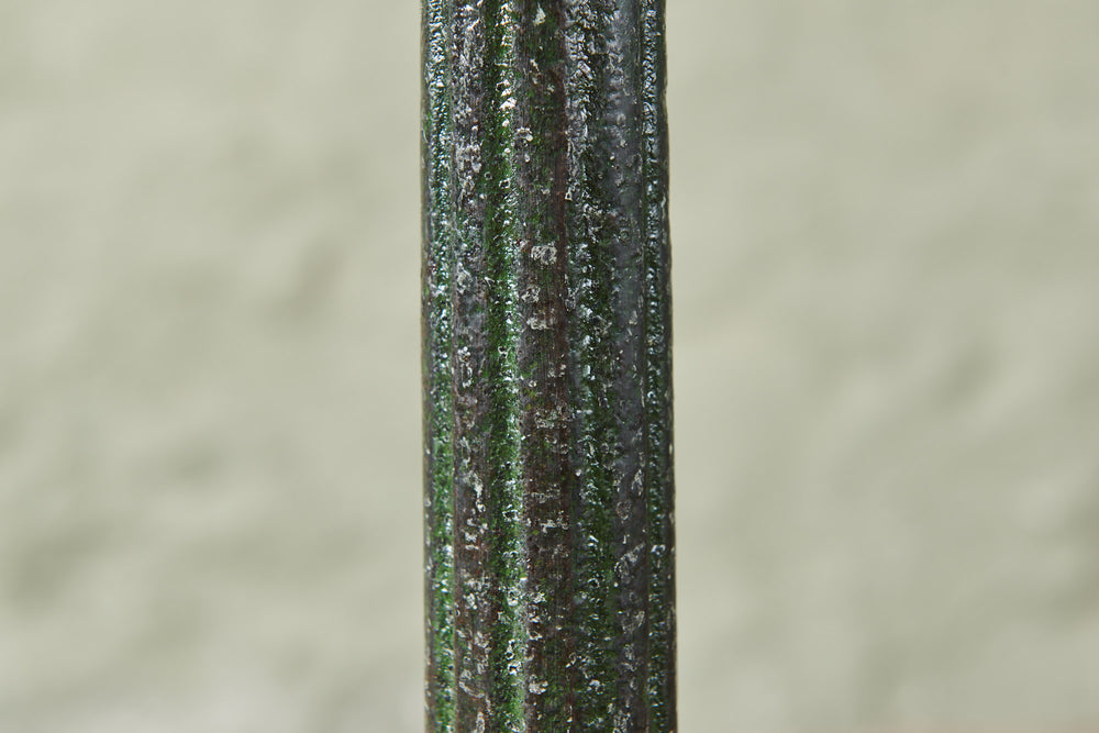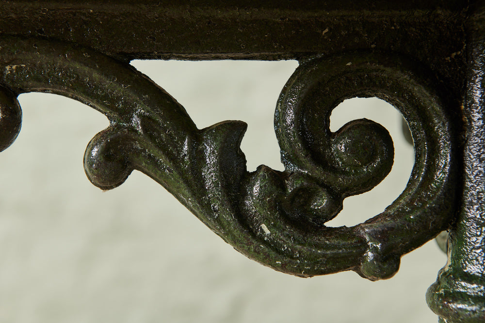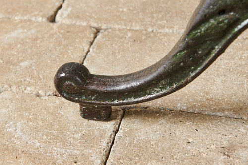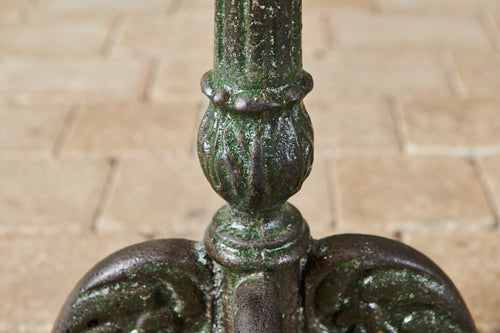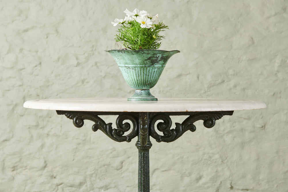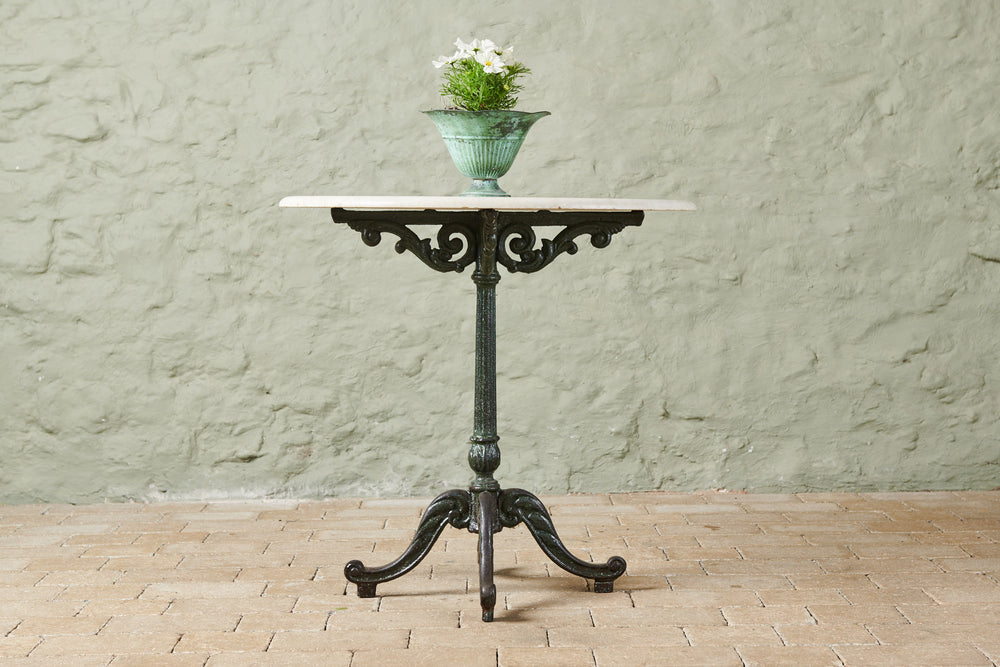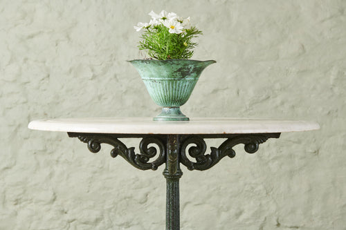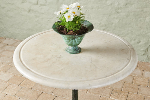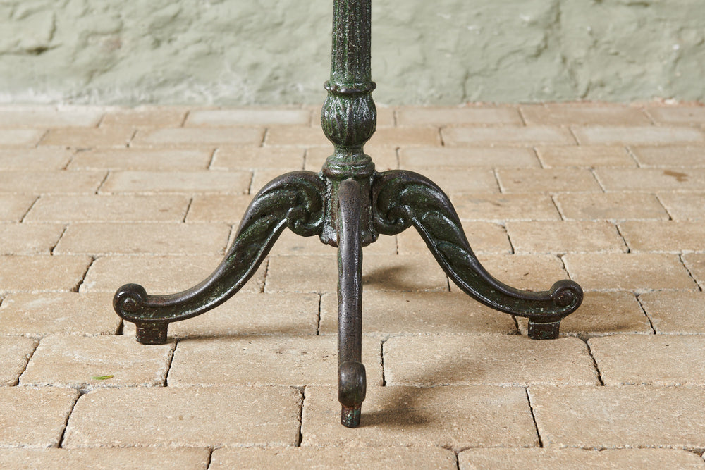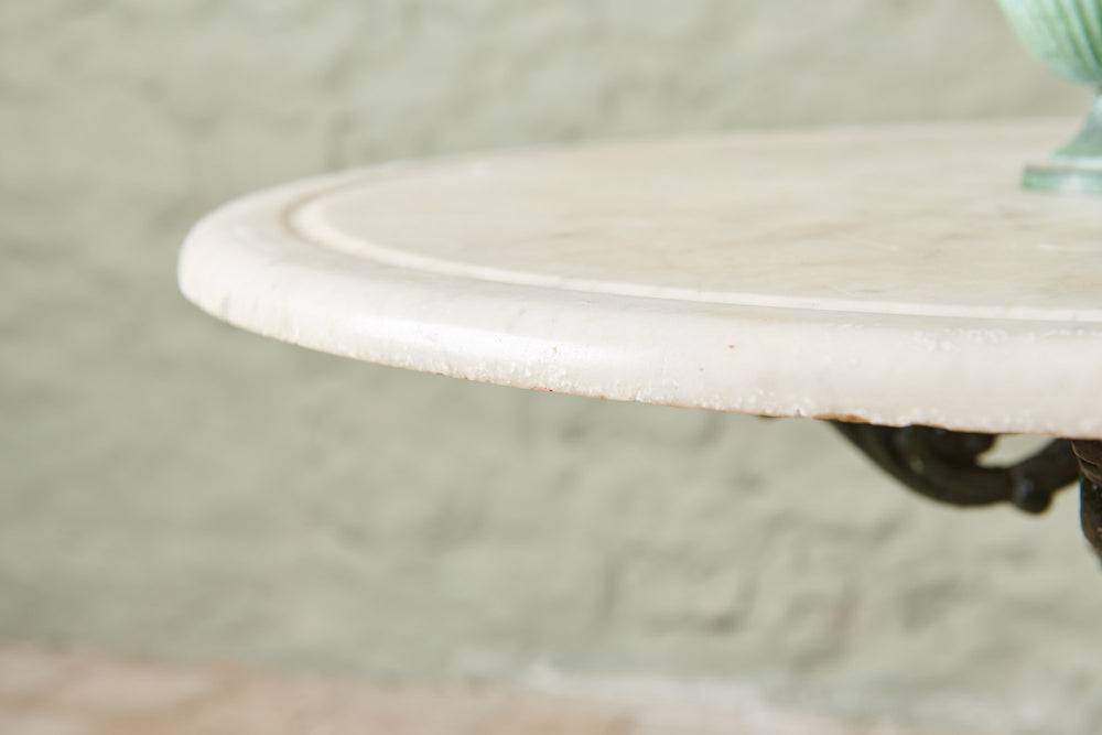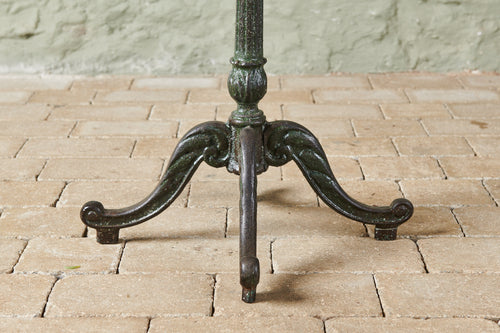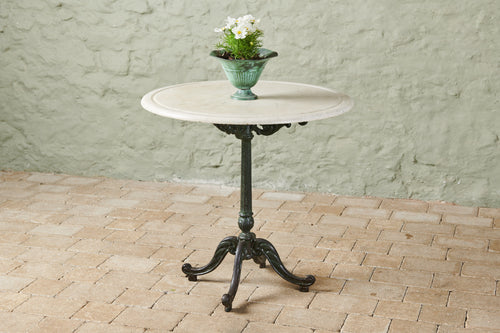 This 19th-century table has its original marble top that sits on a cast iron pedestal base which has over the years developed an attractive green hue. The marble itself is in good condition and includes a circular indentation. The table could be used for dining for two or as an attractive side or corner table.