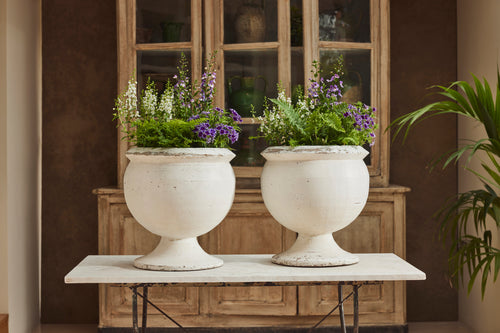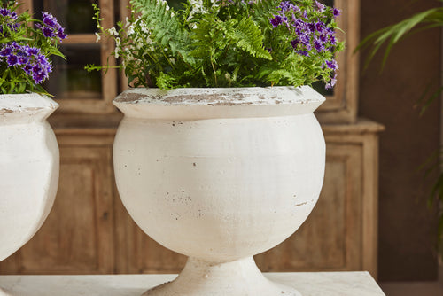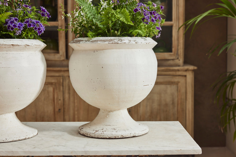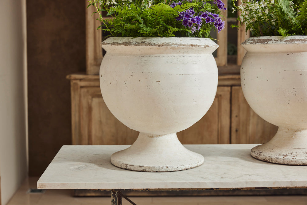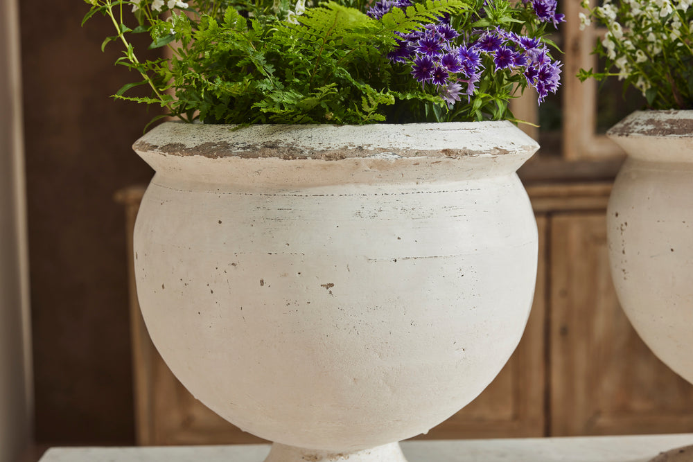 We bought this attractive pair of composite bowl planters for their clean simple lines. They sit on a round pedestal base and are in their original white paint. Substantial enough to withstand all weathers, they would be perfect filled with seasonal plants or small shrubs.