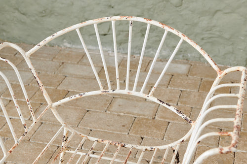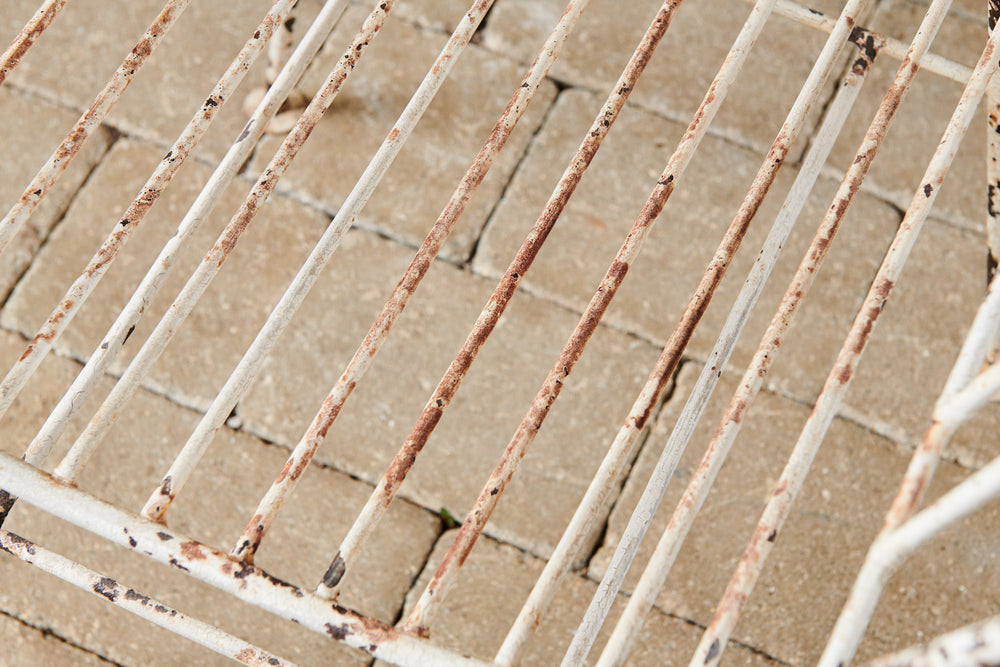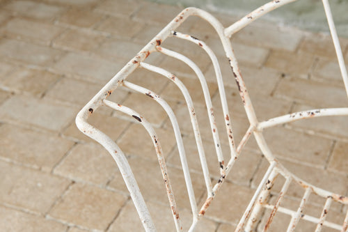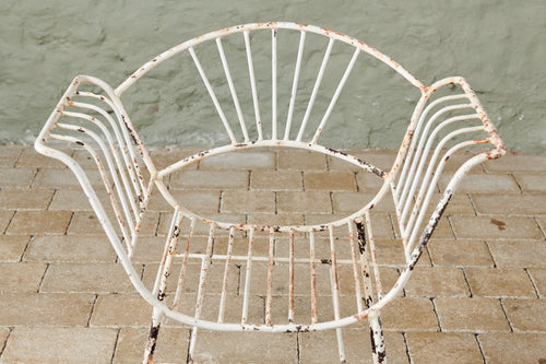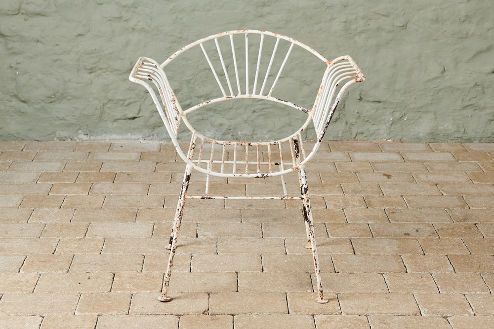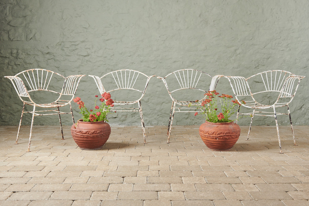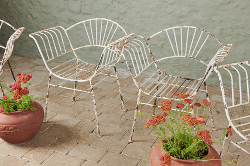 This unusual set of 4 chairs from the 1950s has both style and originality. Made of wrought iron and in original condition, they are comfortable in their own right and would be even more so with a contrasting cushion. They could be used both inside and out as dining chairs and would look great in a kitchen or on the patio.
