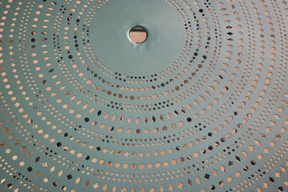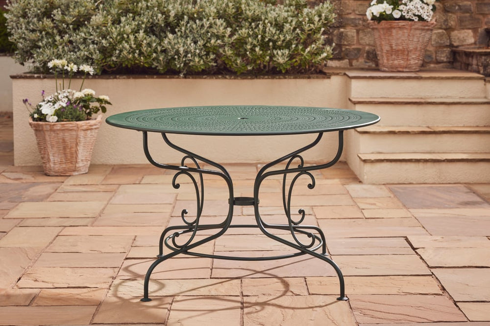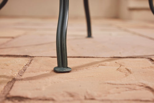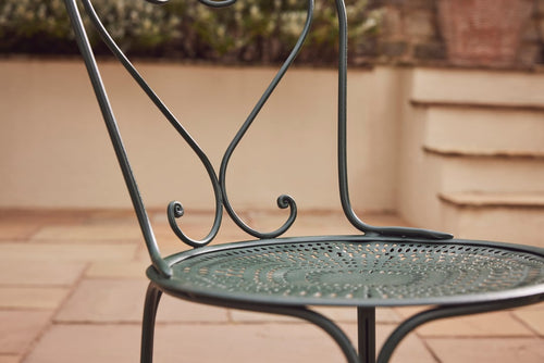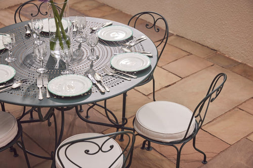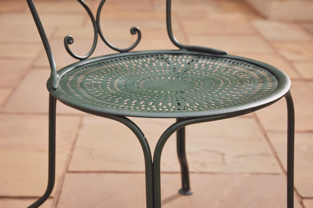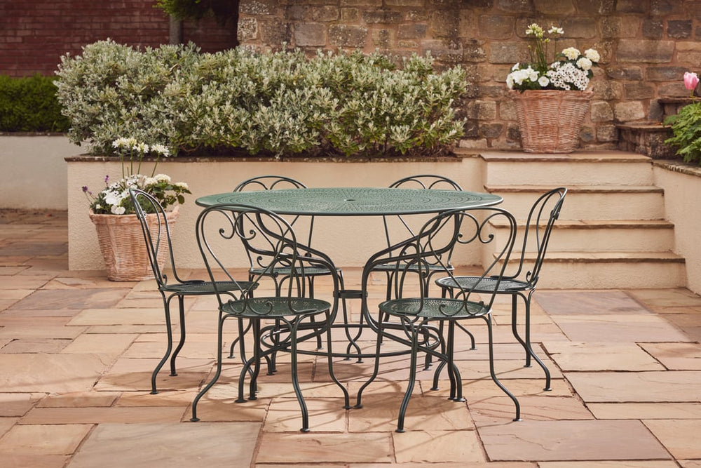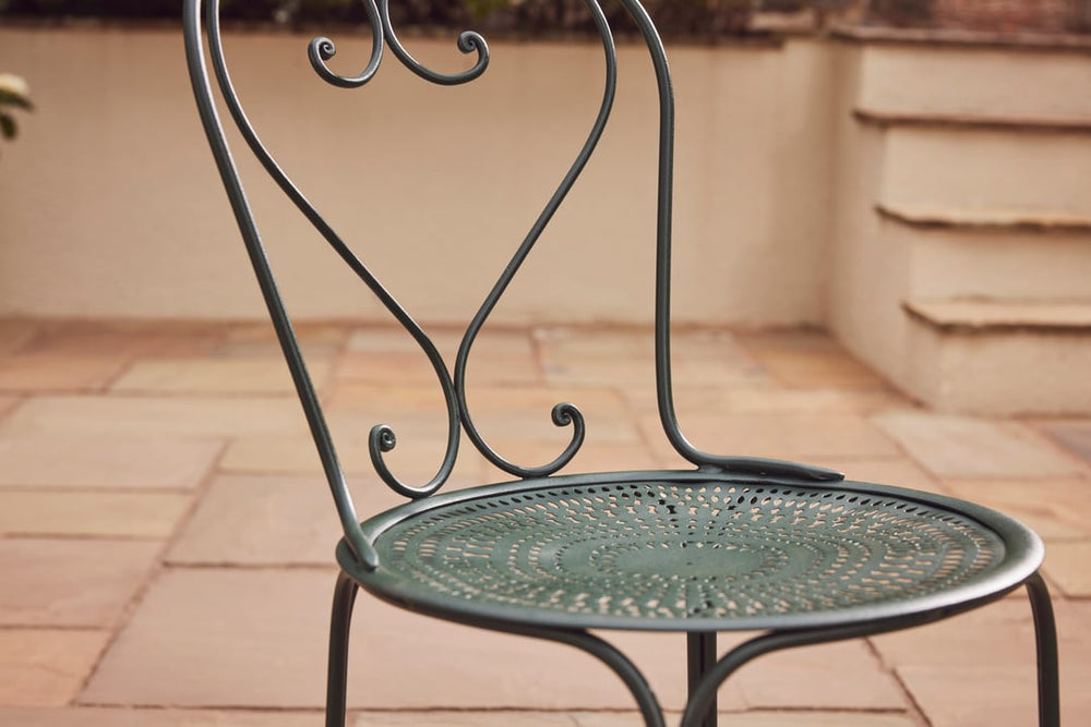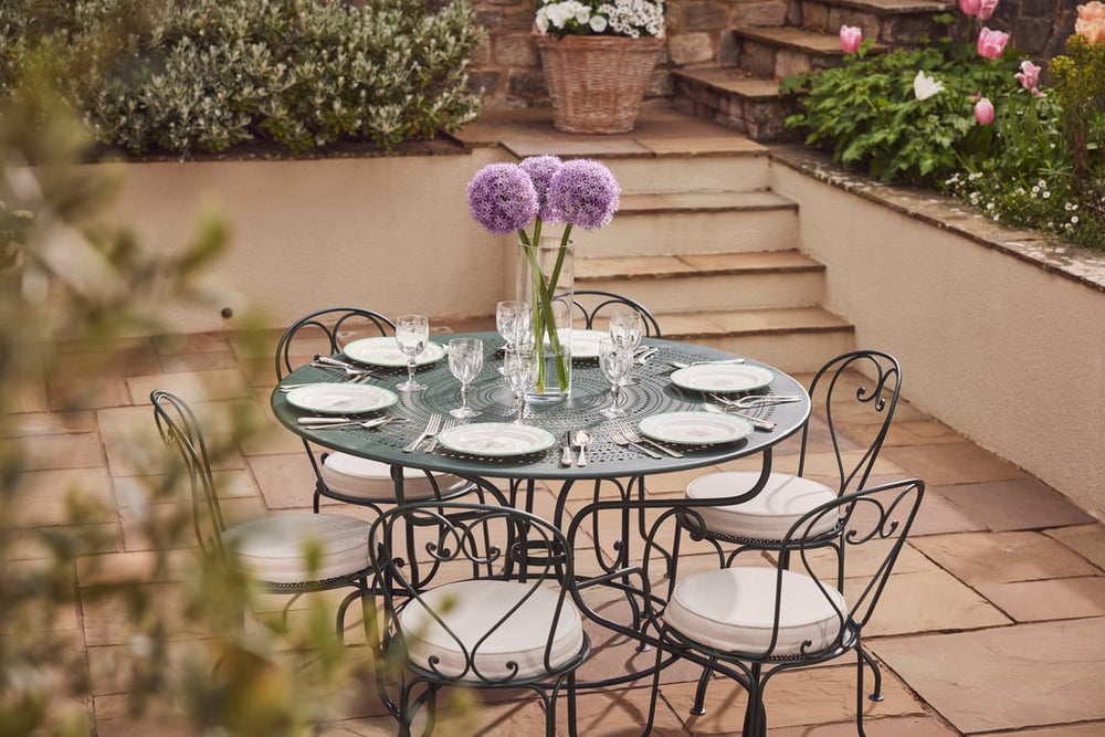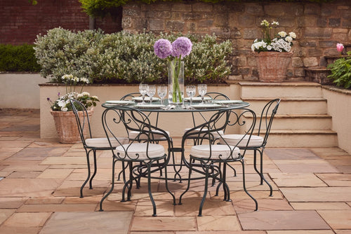 Crafted from wrought iron and powder-coated for durability, it’s a practical yet stylish choice for outdoor dining. Seat cushions are included for added comfort, making it ideal for relaxed gatherings with family and friends