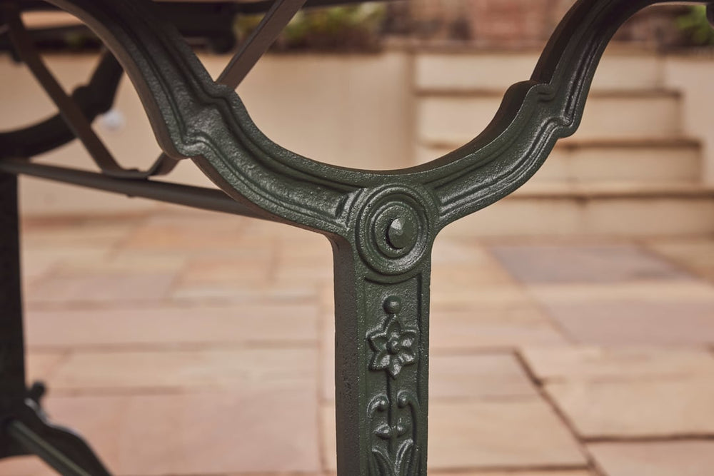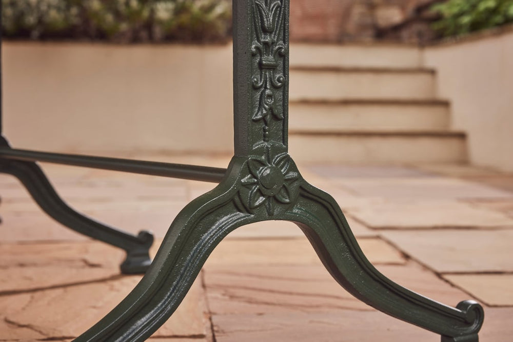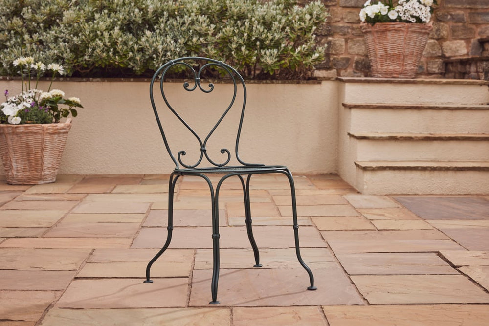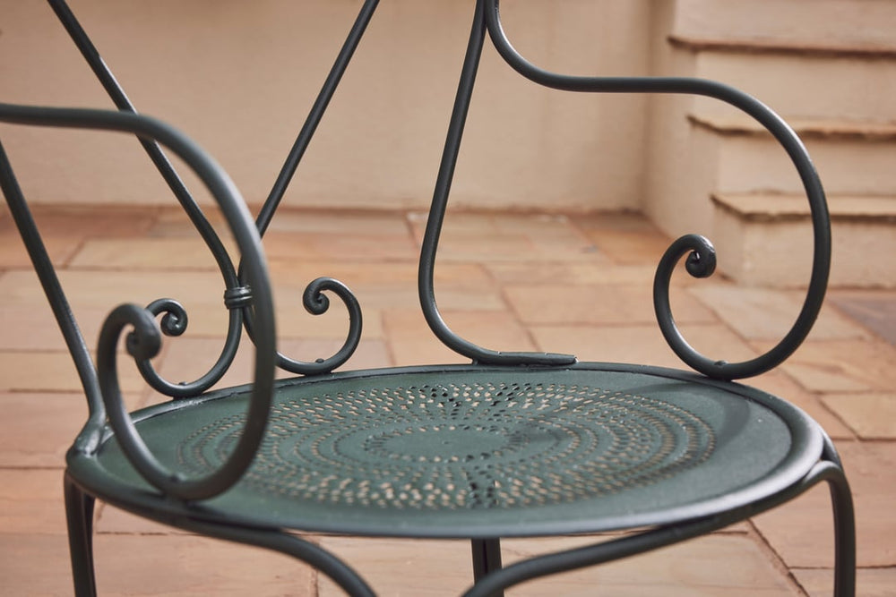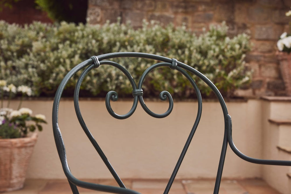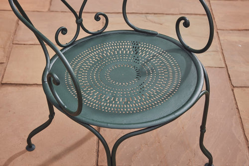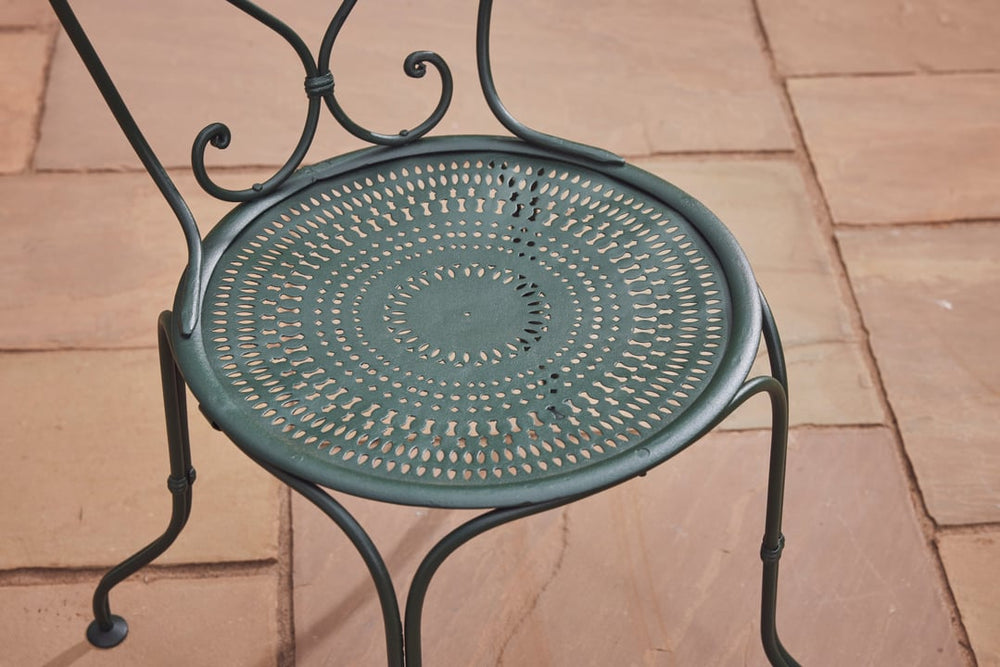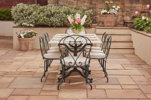 The matching wrought iron chairs have scrolled backs and patterned seats, combining classic design with robust craftsmanship. An ideal choice for long summer evenings dining with family and friends in style