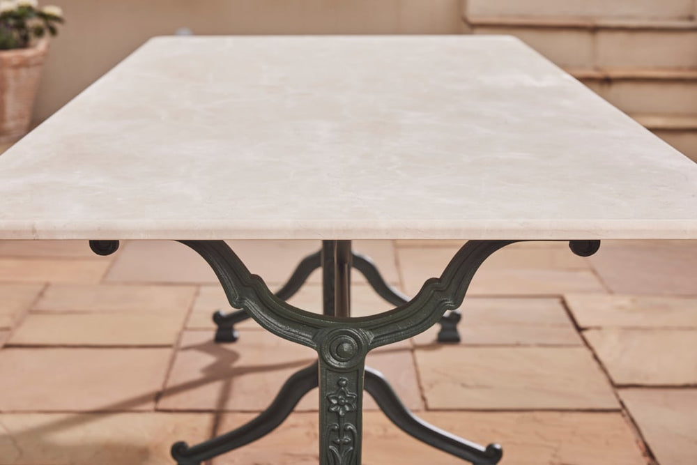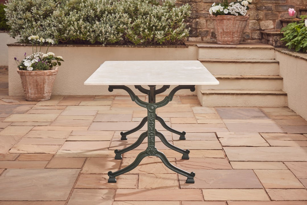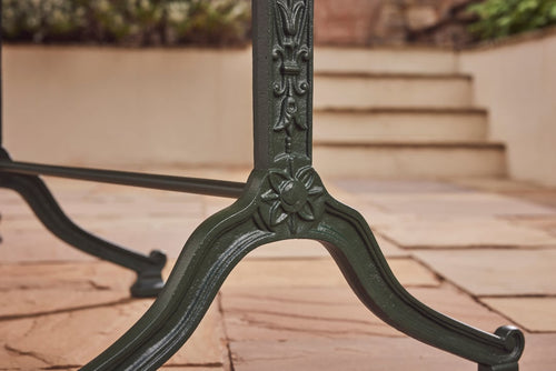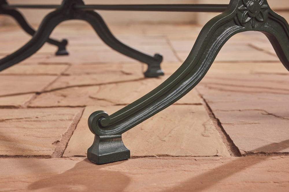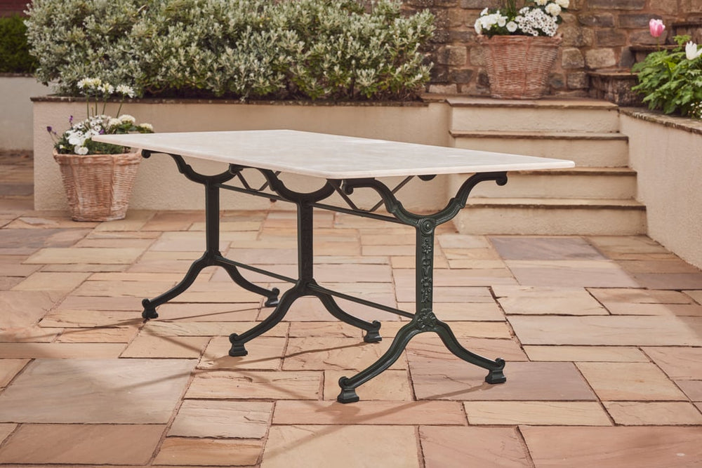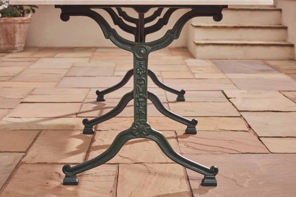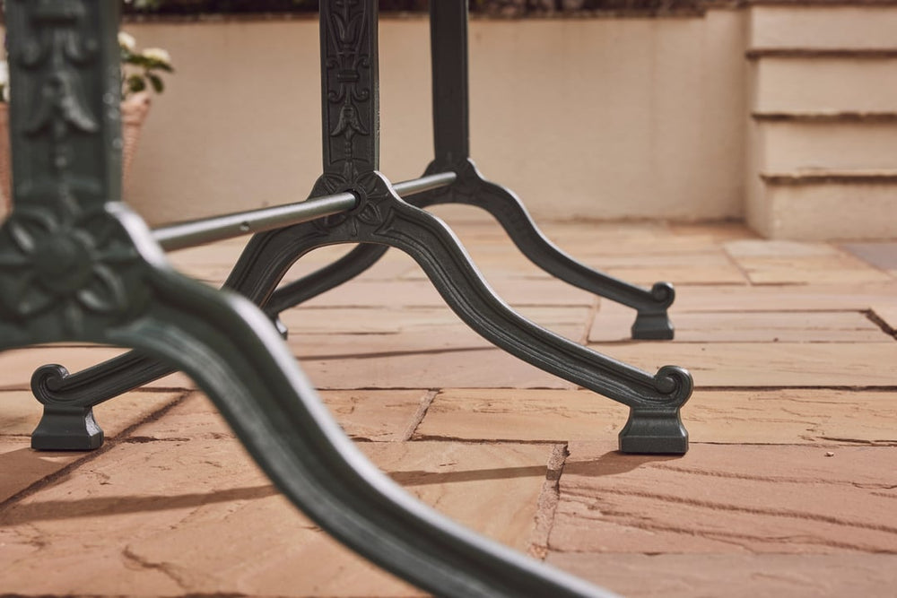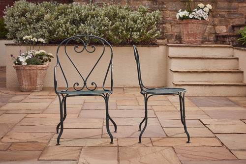 The matching wrought iron chairs have scrolled backs and patterned seats, combining classic design with robust craftsmanship. An ideal choice for long summer evenings dining with family and friends in style