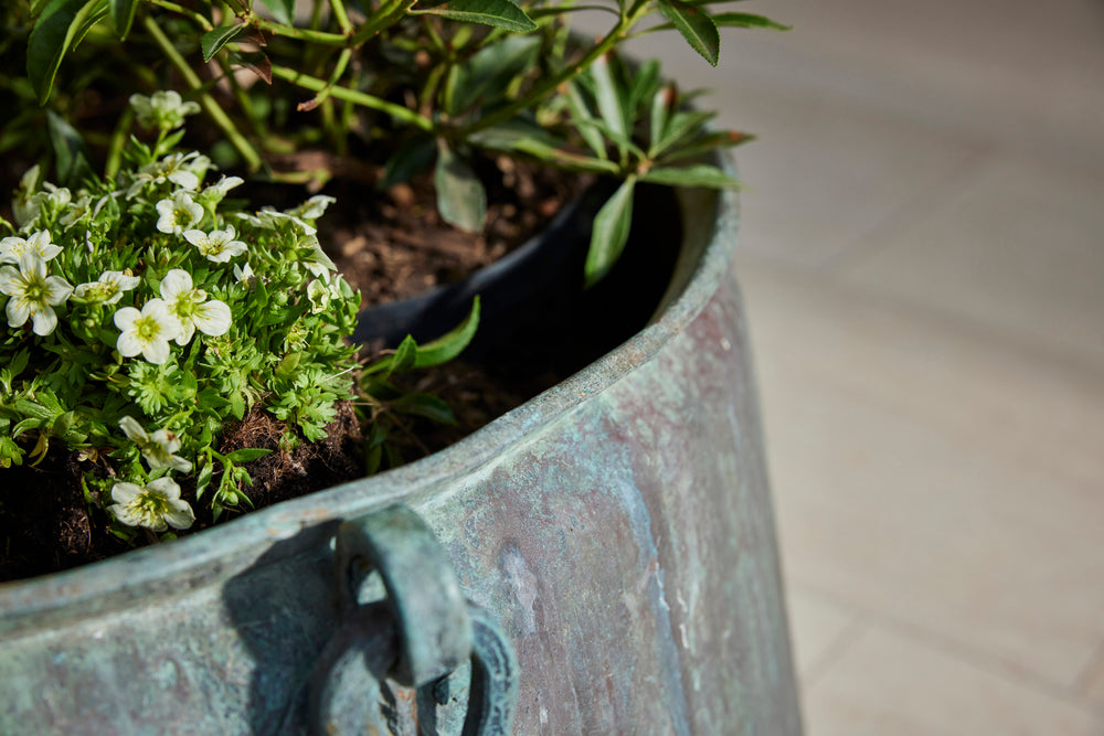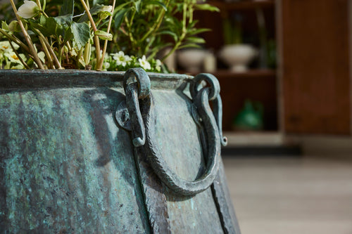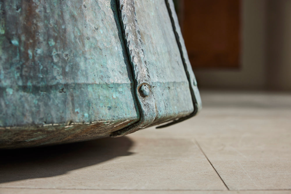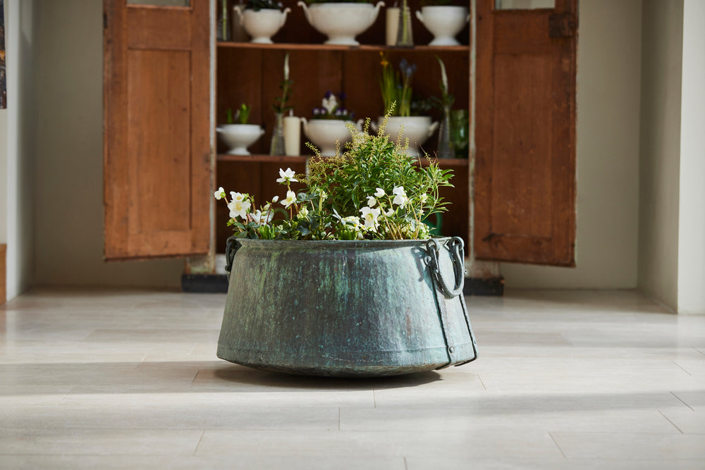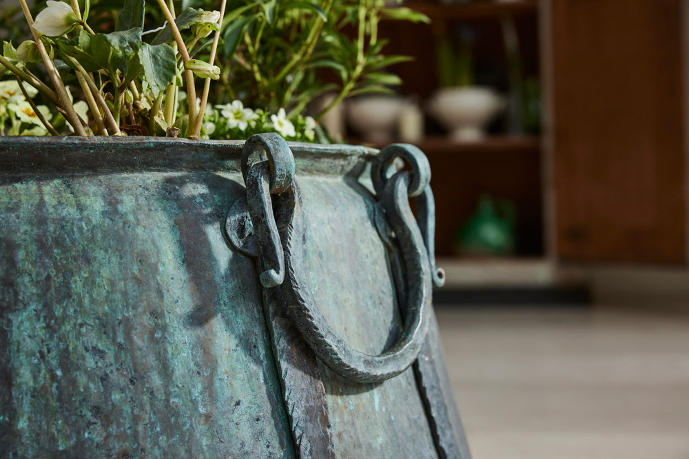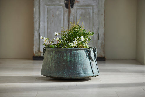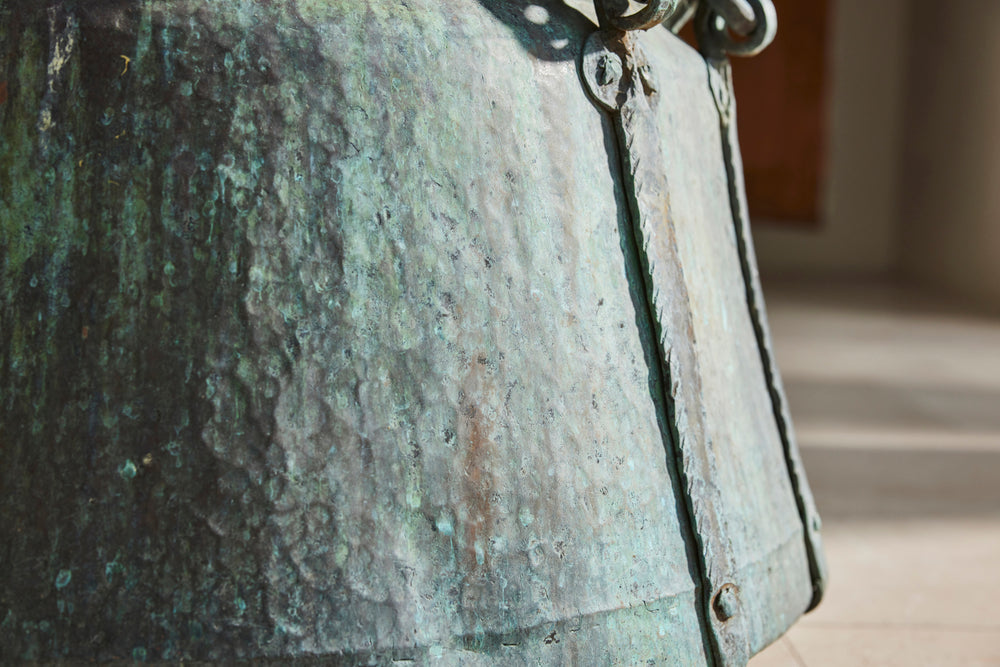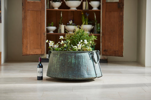 This late 19th-century pot was initially used for mixing nougat. Nougat is a Provencal speciality which originated in Marseille in the 17th century. This pot was found at a brocante in Montelimar in the South of France, and we bought it with the view that it could be repurposed as a large and handy garden planter. In very good condition, made from a copper alloy-hence the hint of green in the patina-with a cast iron handle, it would be a character piece in any garden.