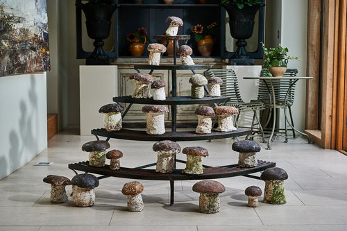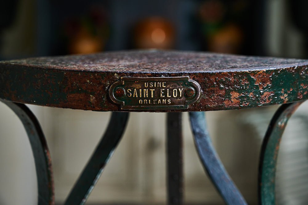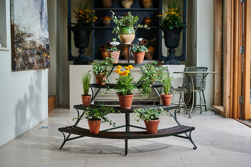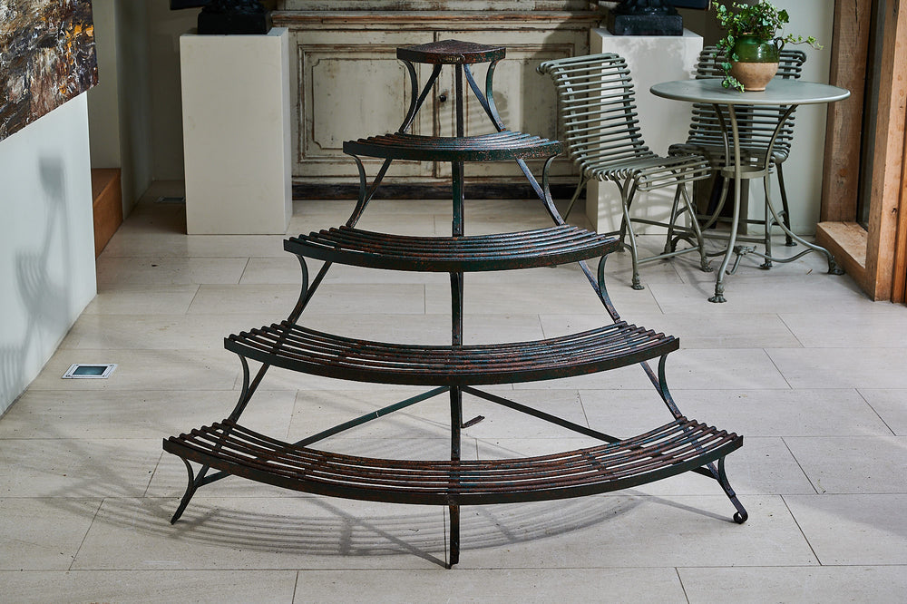 A really lovely five-tier plant stand. Made from wrought iron it retains traces of its original paint and is in very good condition considering its age and use. Made by the foundry Saint Eloy of Orleans in France this tiered quarter round stand could be used to create plant displays both inside and out throughout the year.