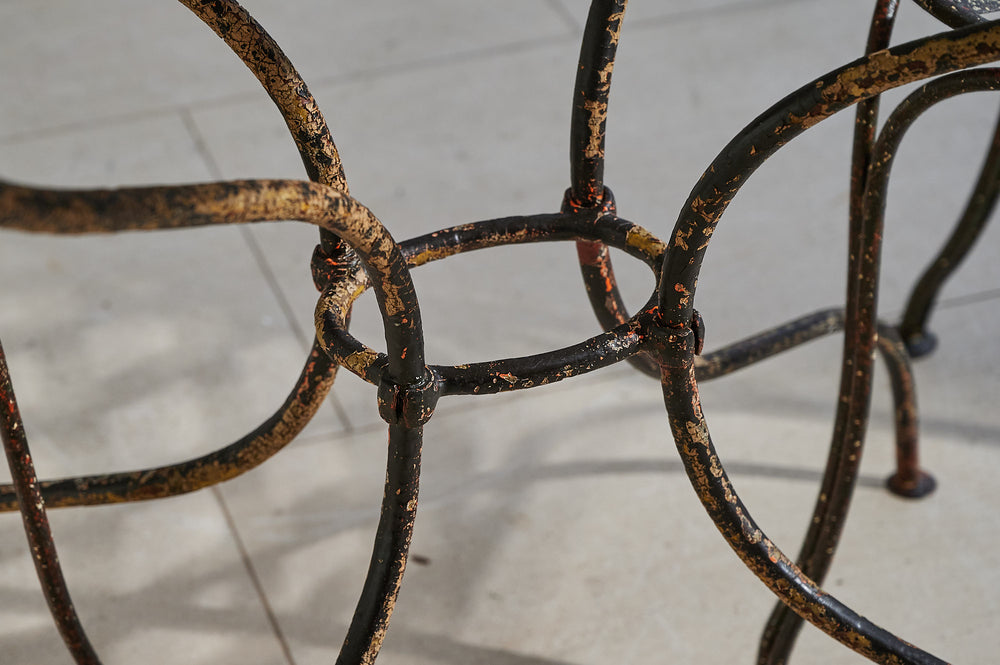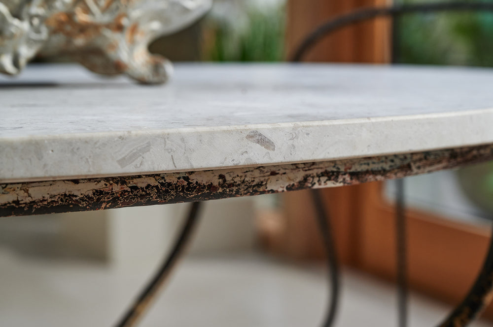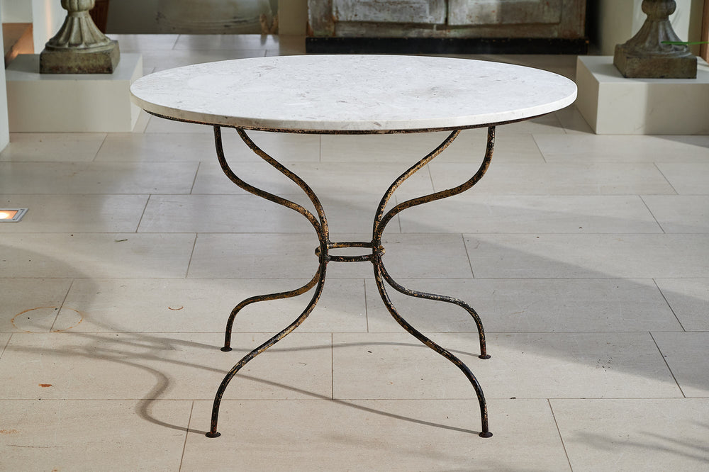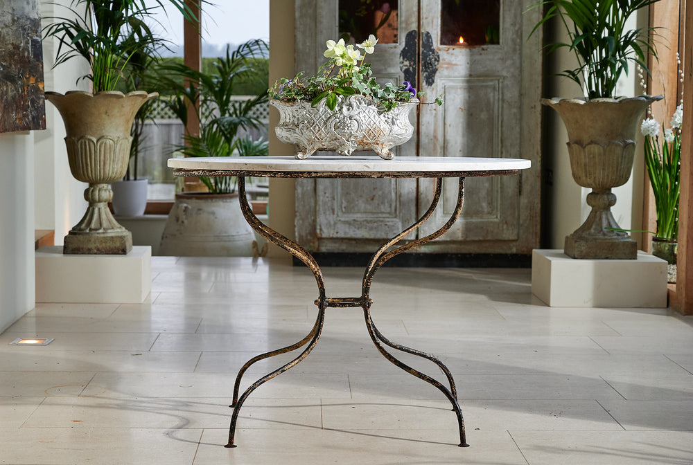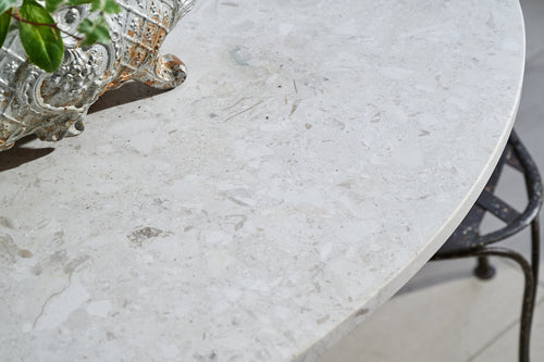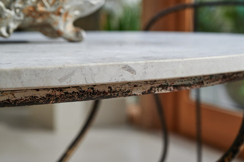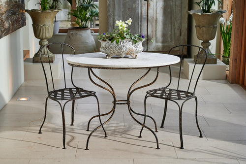 A lovely 19th-century bistro set. The oval table has attractive curved legs with a new marble top with plenty of character. Both the table and the chairs are in very good condition and retain traces of their original paint. Perfect for 'un dîner romantique à deux'