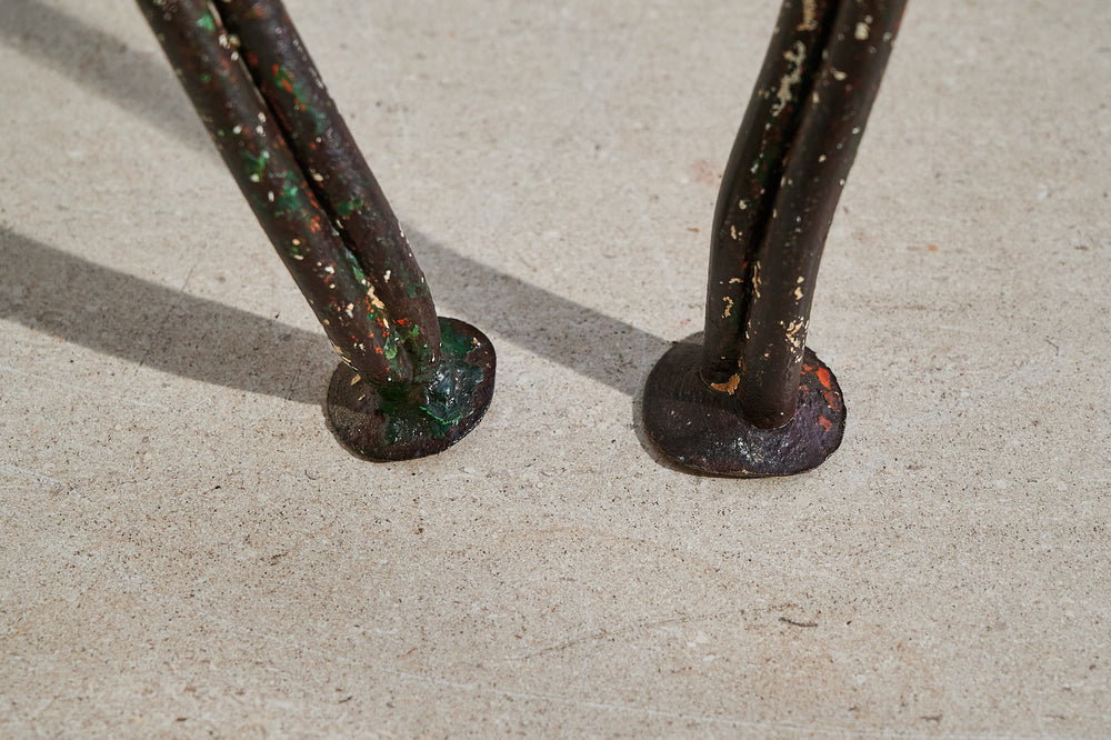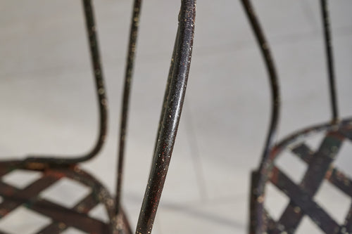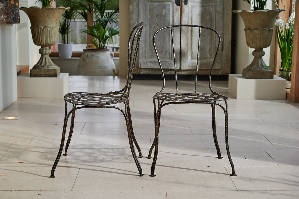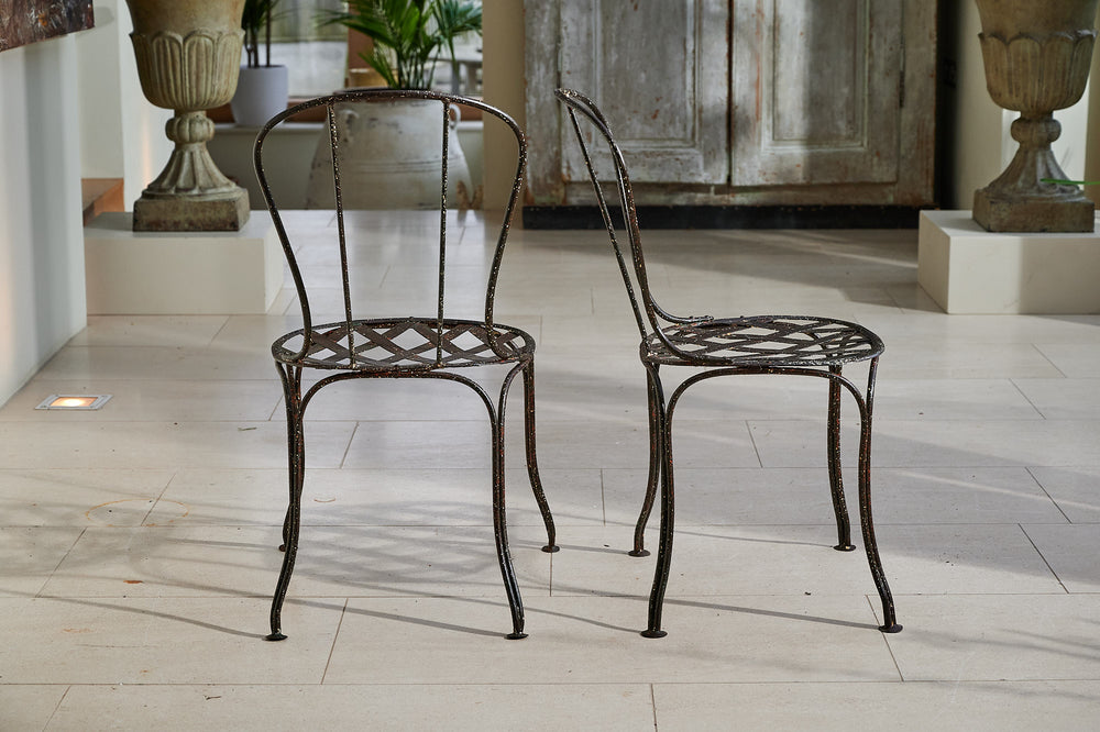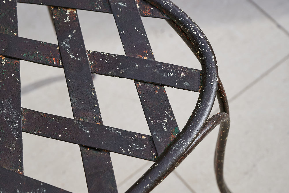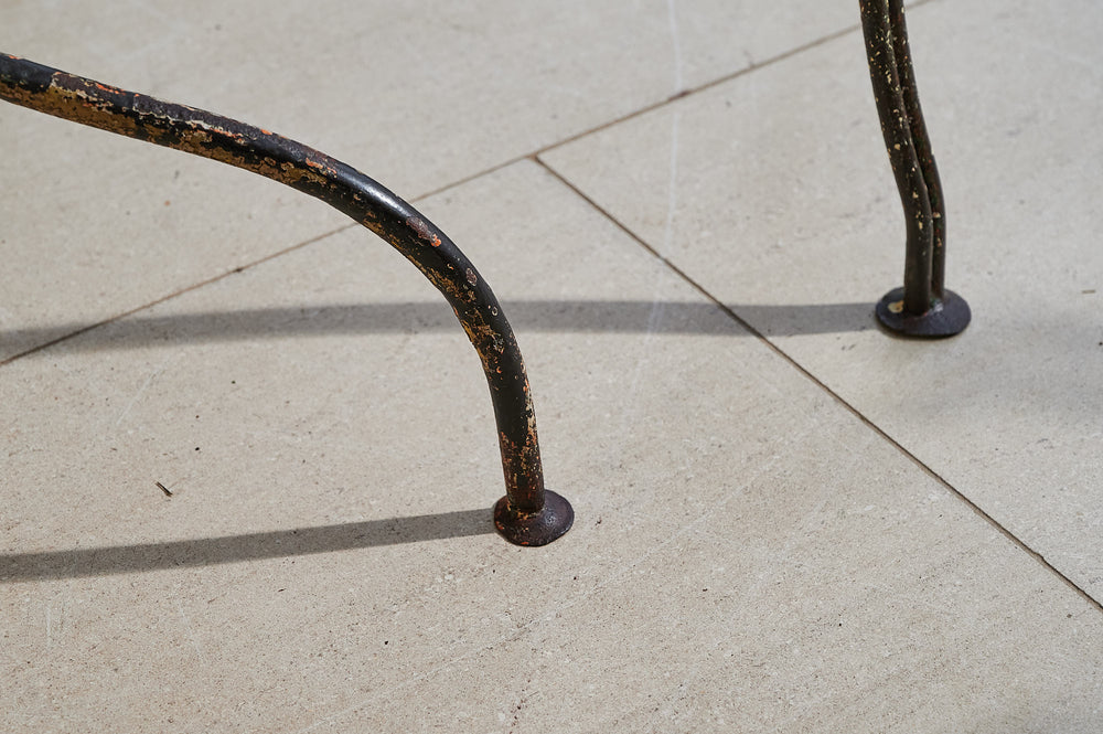 A lovely 19th-century bistro set. The oval table has attractive curved legs with a new marble top with plenty of character. Both the table and the chairs are in very good condition and retain traces of their original paint. Perfect for 'un dîner romantique à deux'