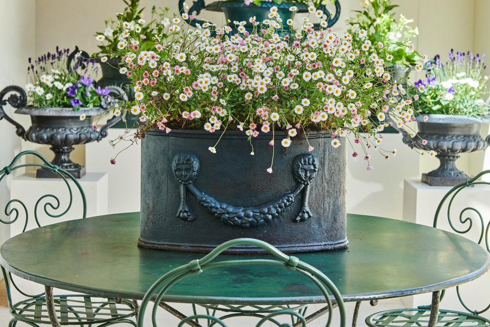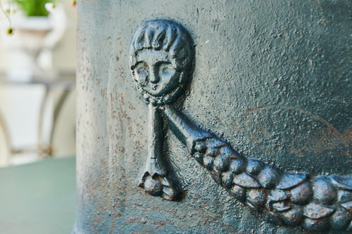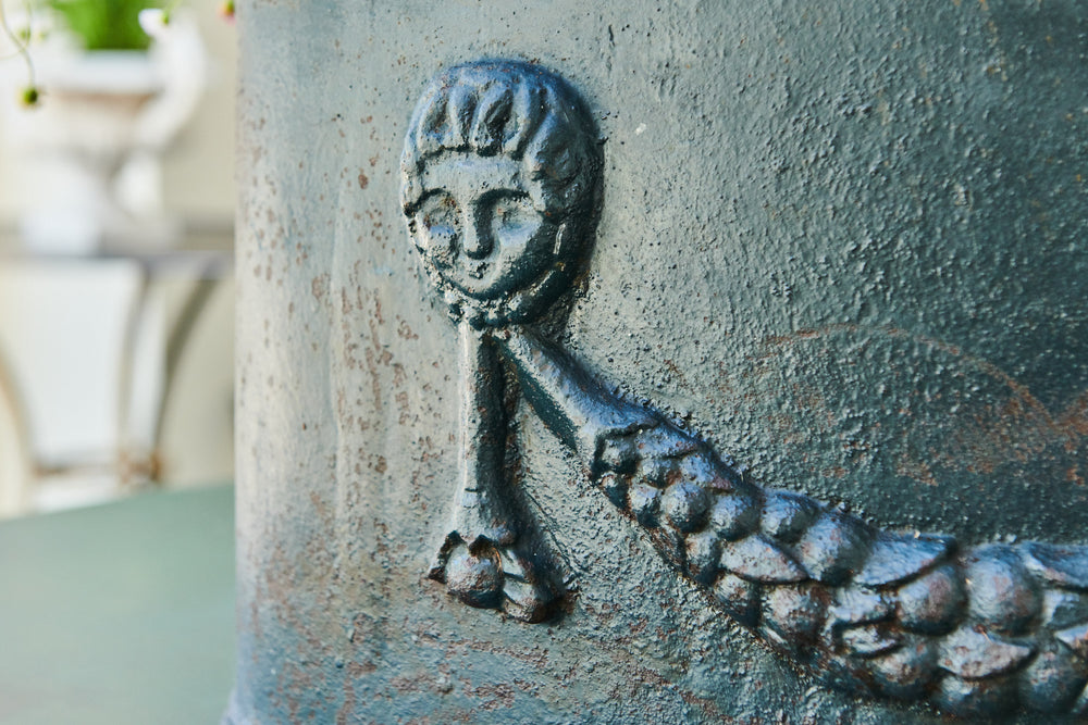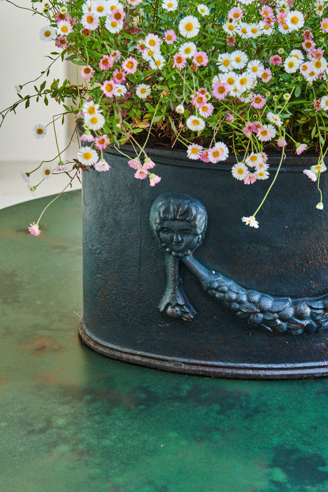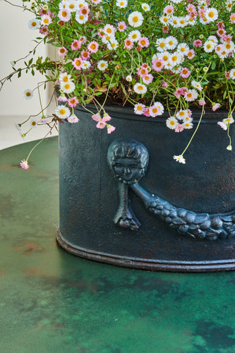 Oval planters are really quite rare and this one is a beauty! It has an unusual design on both sides of a little face and what looks like a swag of flowers and fruits. Perfect for indoor or outdoor use.