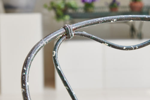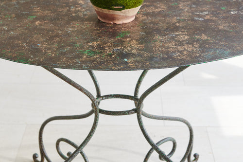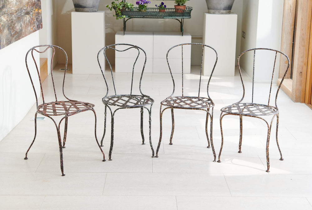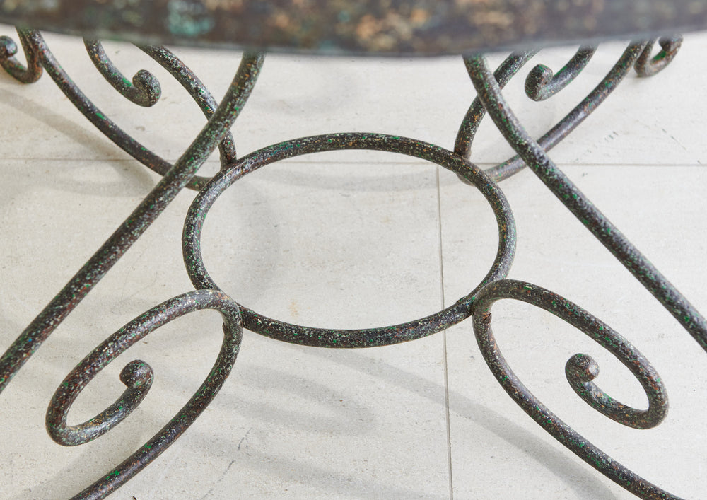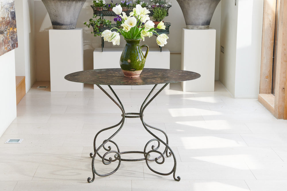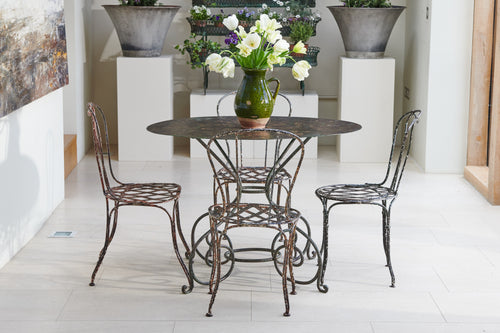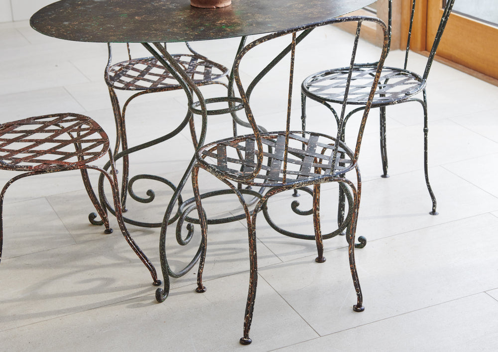 Oval tables are very rare, this one is a beauty!! Lovely weathered patina top sitting on elegant curved wrought iron legs. The four chairs have slatted seats, two chairs have a curved design back while the other two are straight, the slight mismatch design adds to the character.