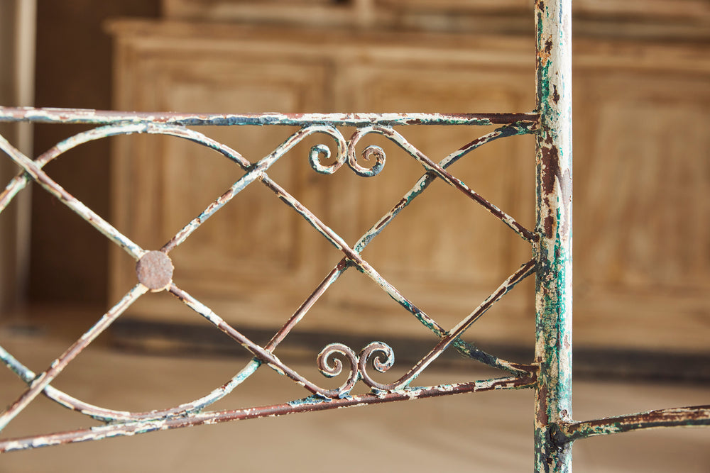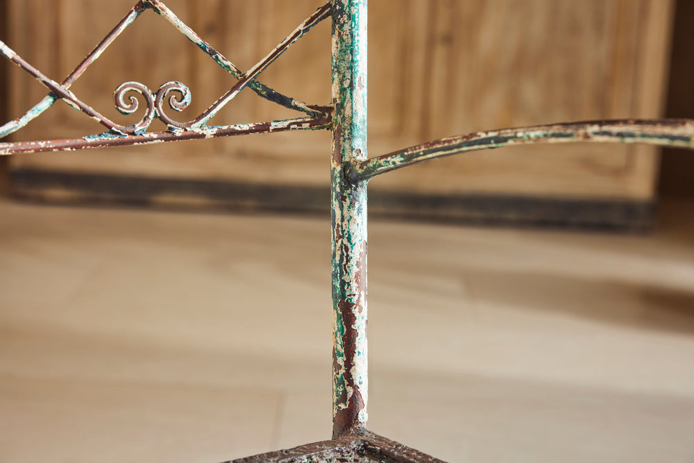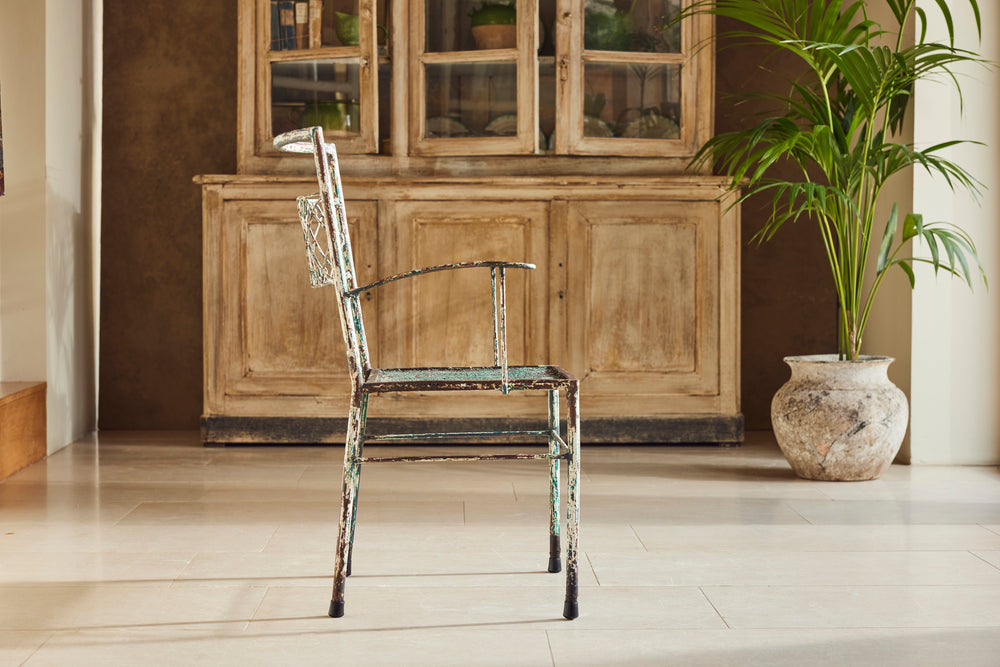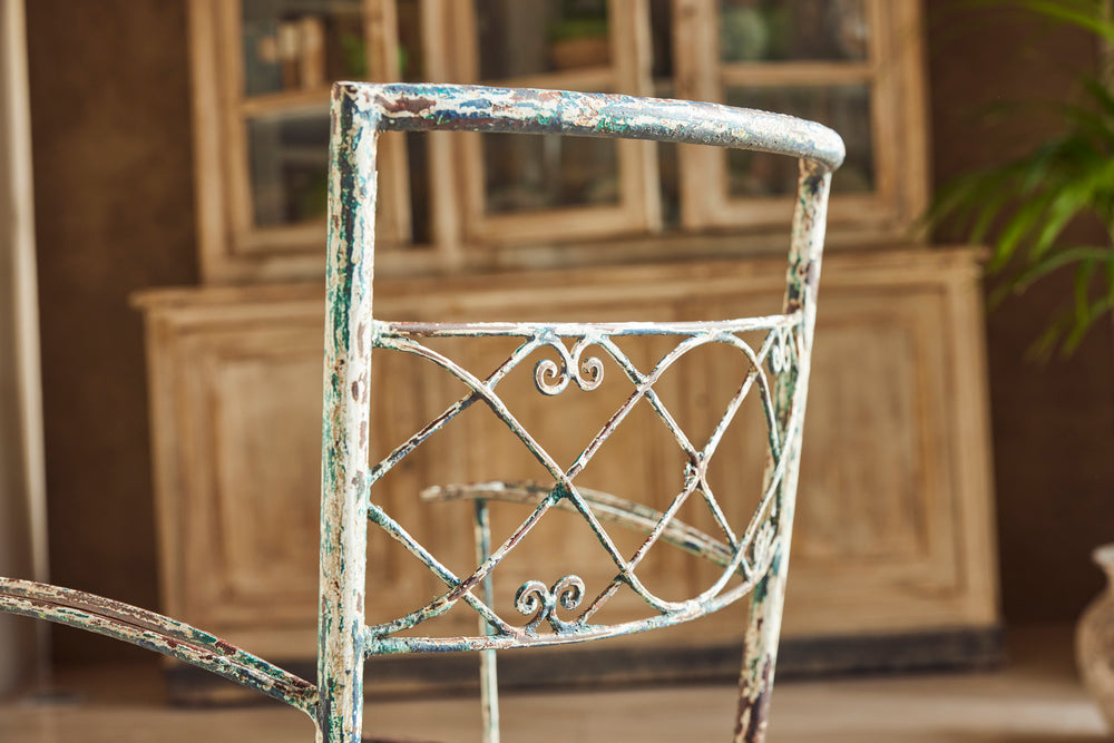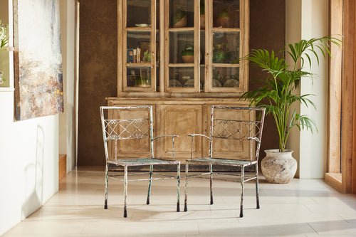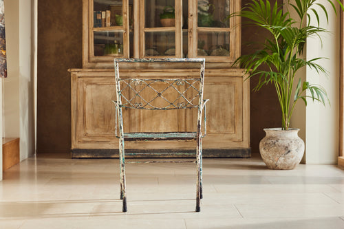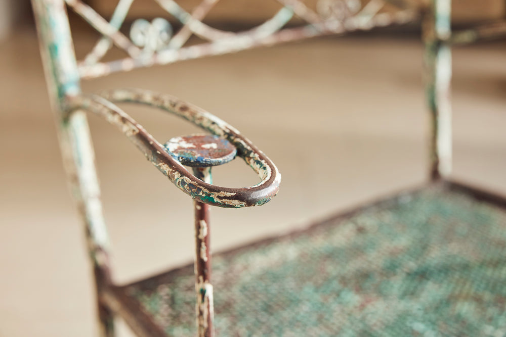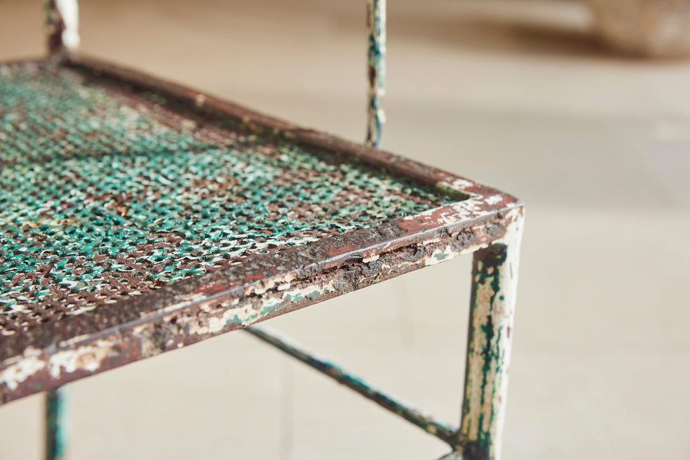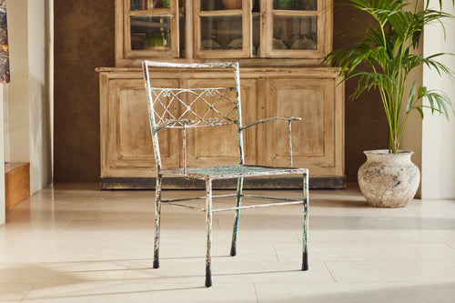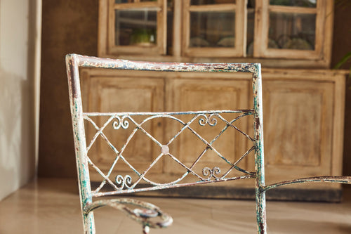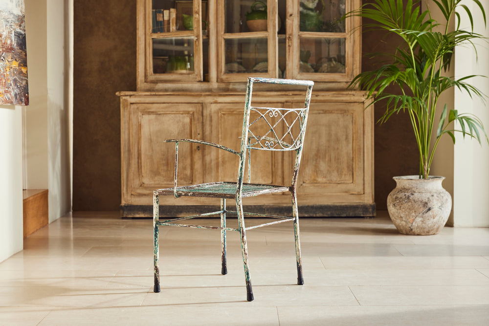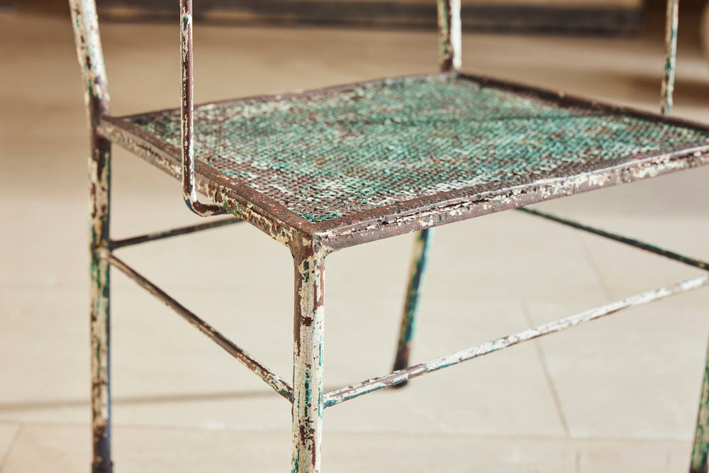 A really beautiful pair of bespoke hand forged French garden chairs in completely original condition. Through time they have developed a truly lovely patina and would have many uses both practical and decorative in the home or garden. The frame is made of tubular steel with scrolled fretwork backs and arms and mesh seats.They are in very good condition.