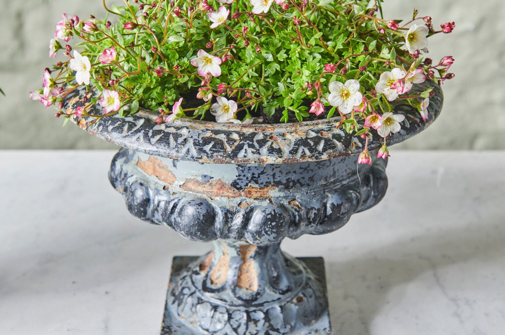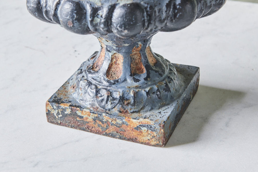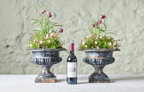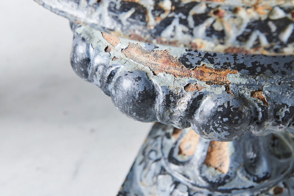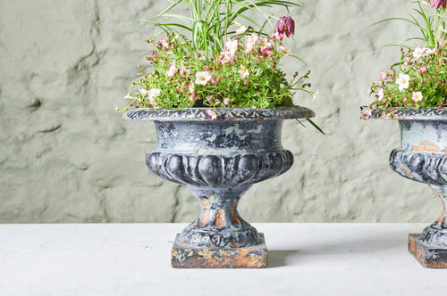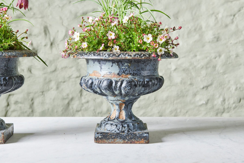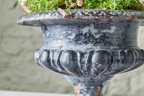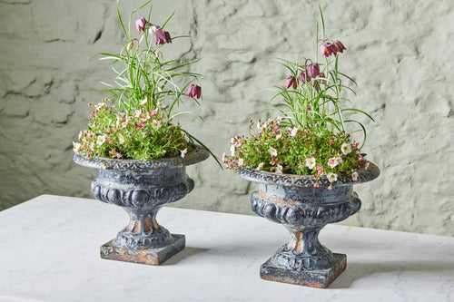 A beautiful pair of 19th century cast iron Tazza Urns. They are attractively decorated on the rim and the body and have developed a subtle blue patina. They are small enough to look great on the sideboard but deep enough for planting in the garden.