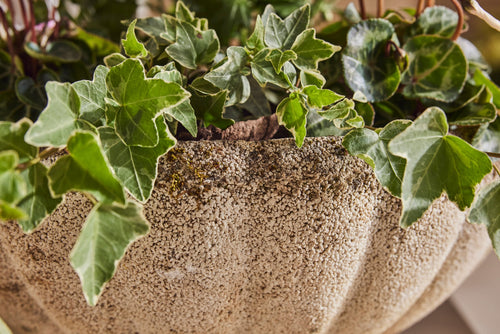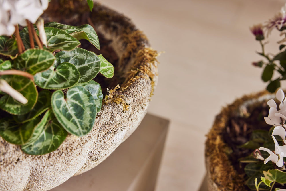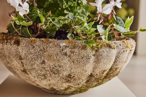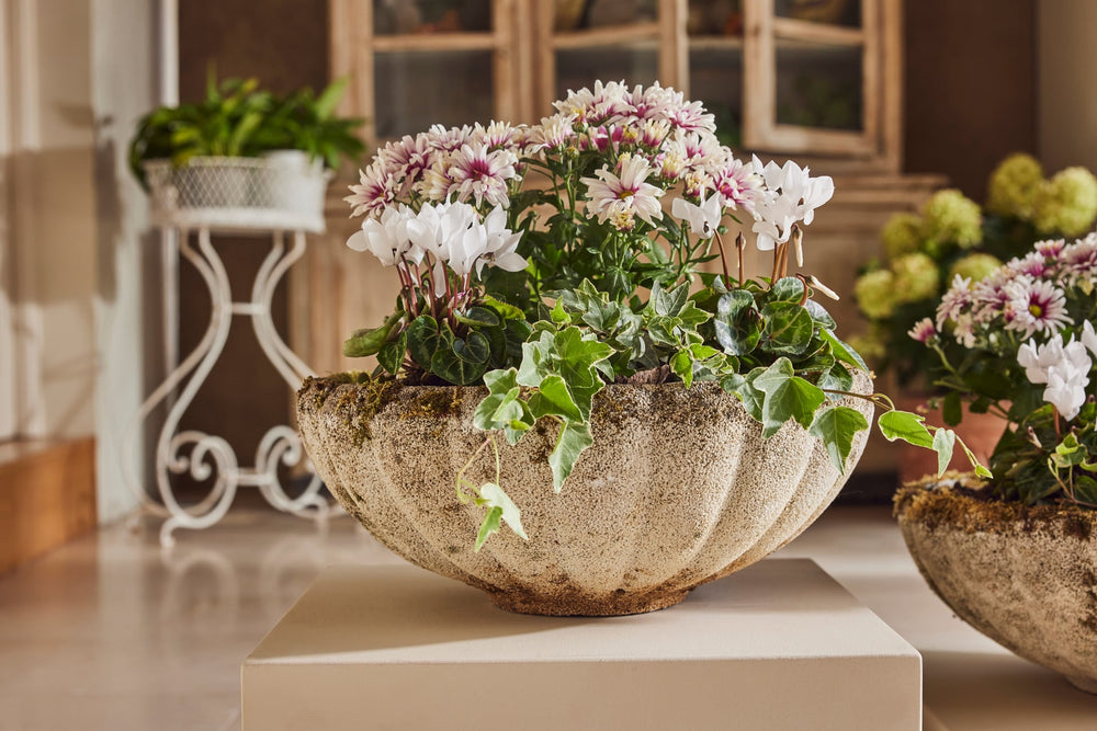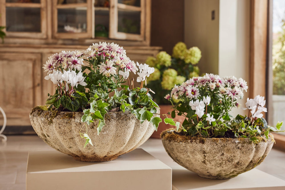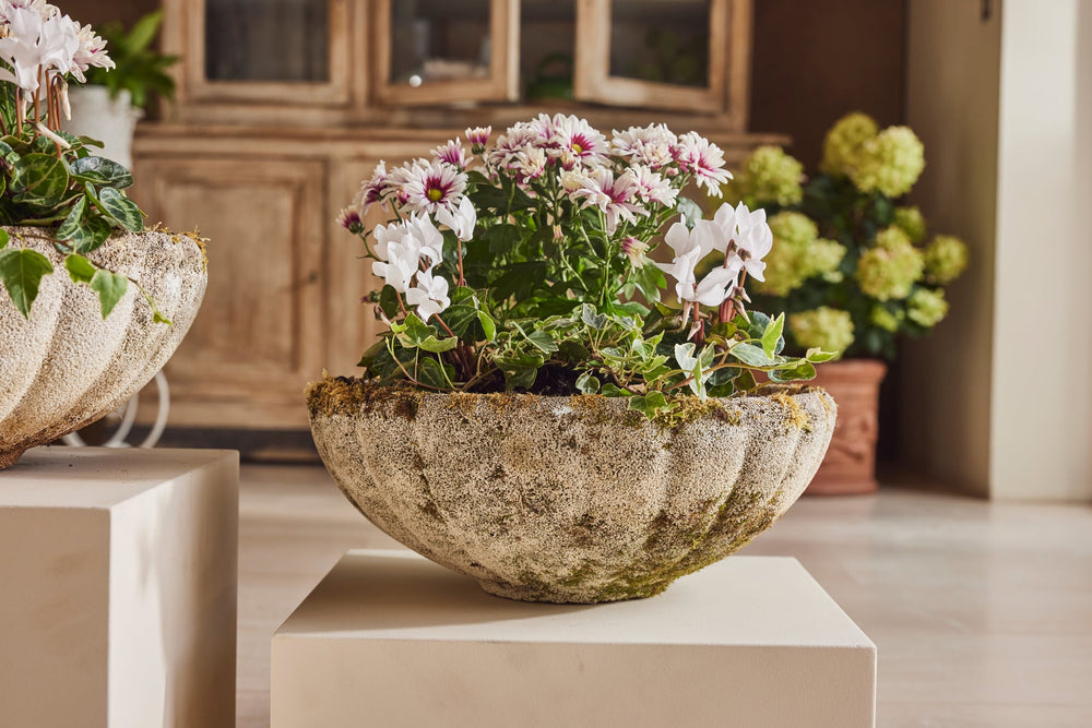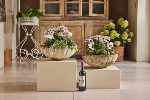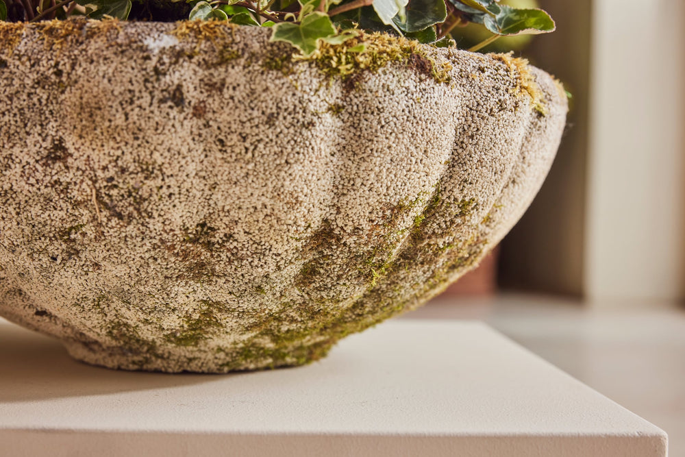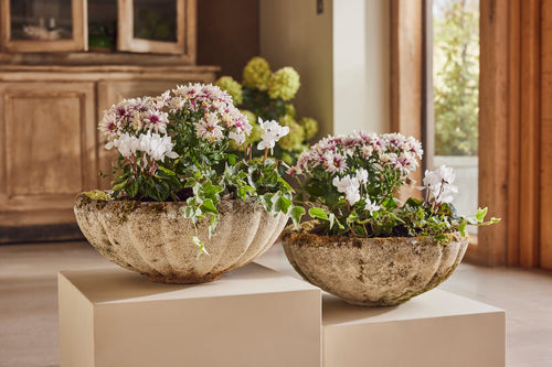 A charming pair of bowl planters with a gently weathered finish and scalloped bodies that blend seamlessly into a mature garden setting. Simple yet elegant, they are perfect for seasonal planting and remain in very good condition.