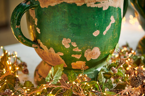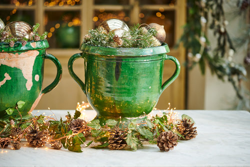 A pair of small Castelnauudry urns one with green glazed finish in a good condition and one with a slightly worn finish. They would have originally been used to store food in the 19th century and whilst very decorative in their own right and look excellent filled with house plants.