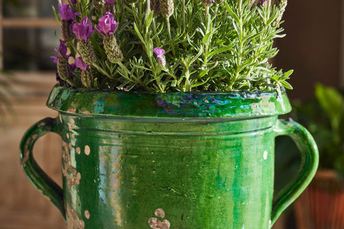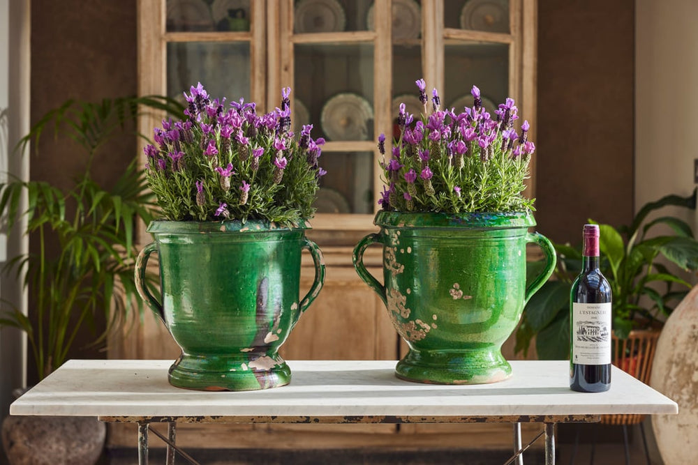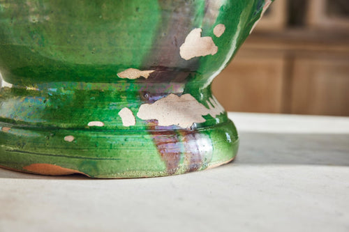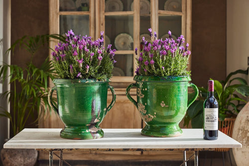 A lovely near pair of green-glazed terracotta urns, handcrafted in the early 20th century in the charming village of Castelnaudary, South of France. With their rich, glossy finish and timeless elegance, these urns are a true celebration of French artisan tradition. Whether brimming with fresh blooms or lush houseplants, they promise to bring a touch of rustic sophistication and old-world charm to any space.