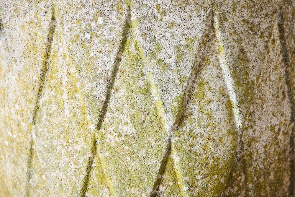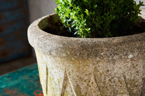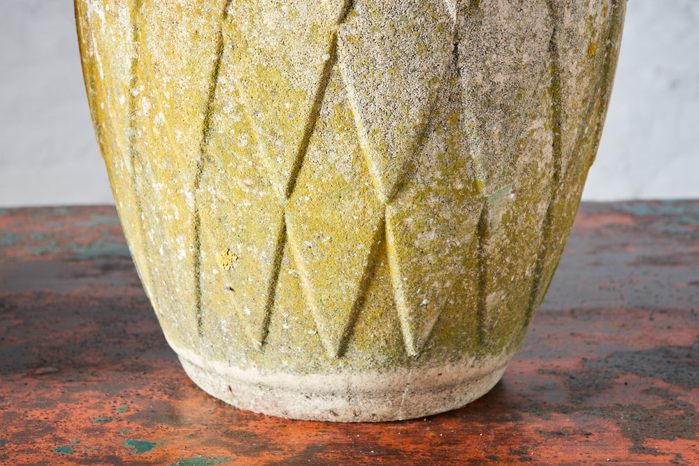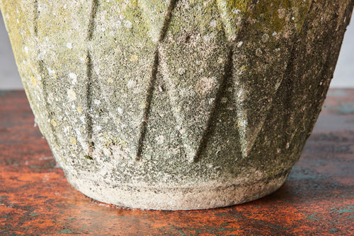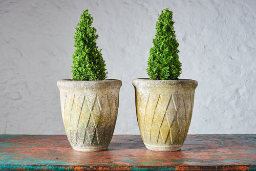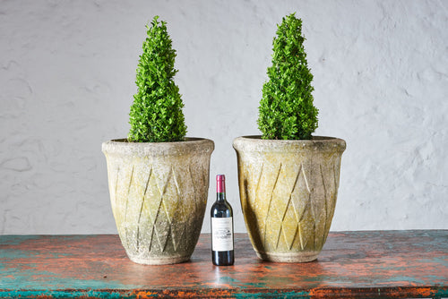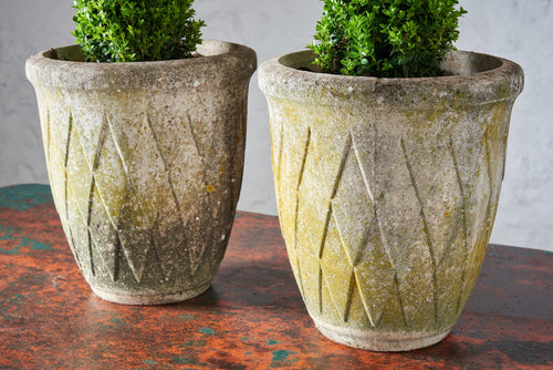 An attractive pair of composite stone planters in good condition. We bought them because we loved the way the diamond pattern contrasted so well with the mossy patina.