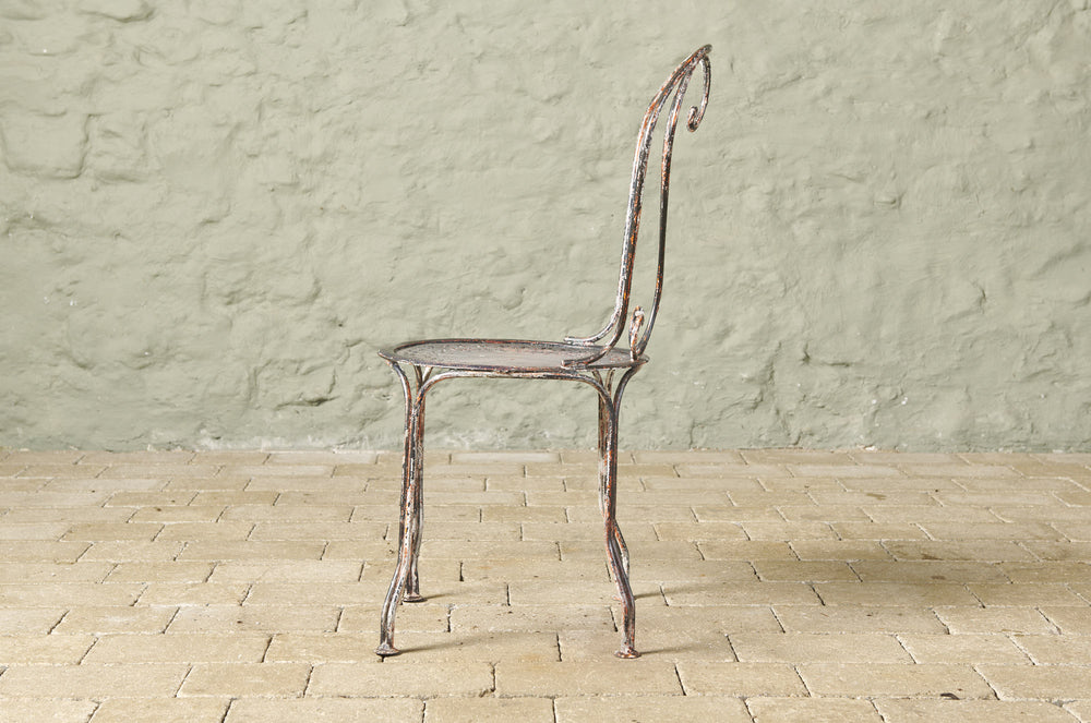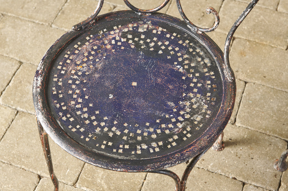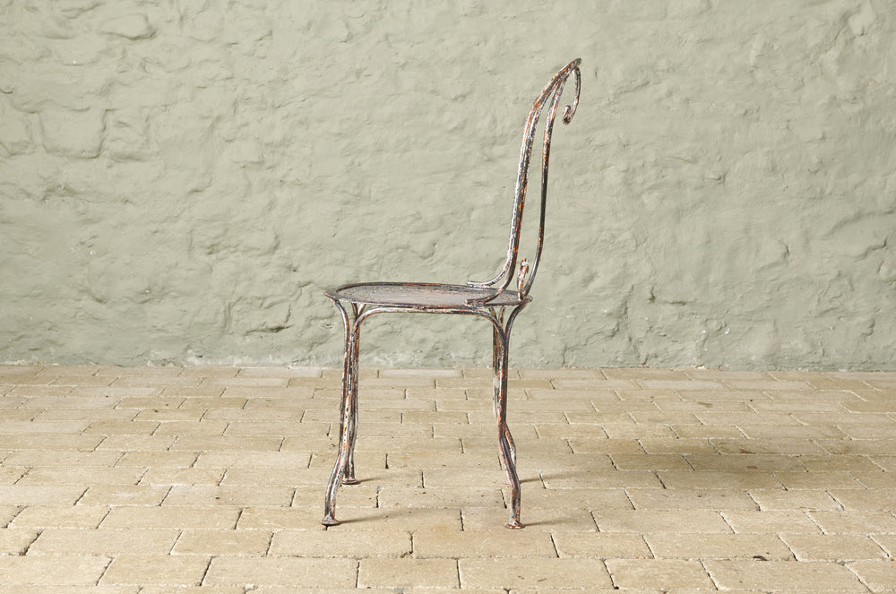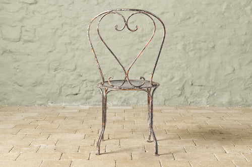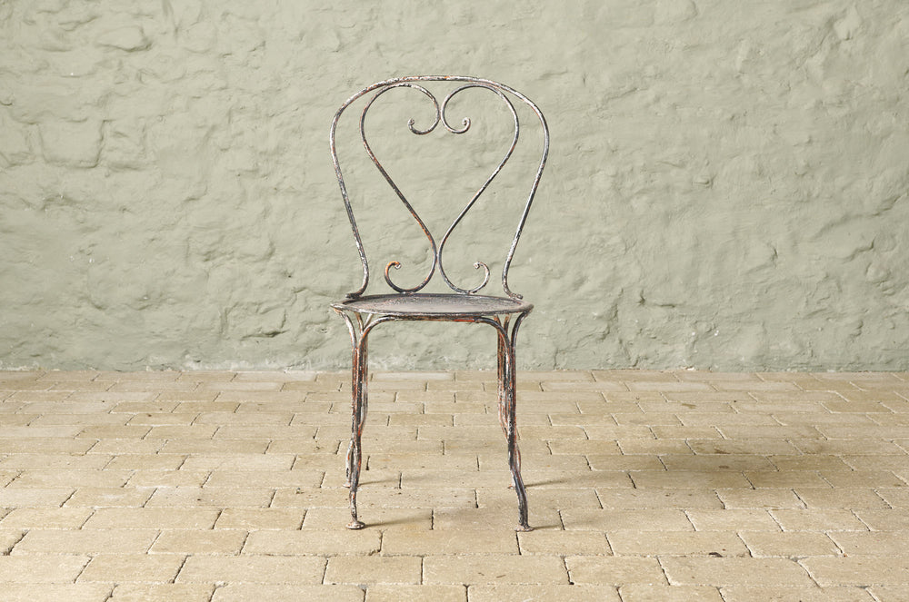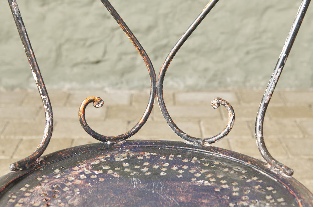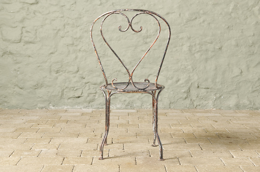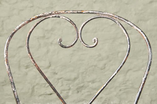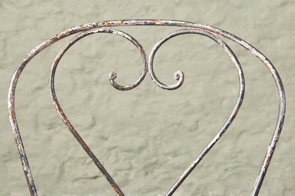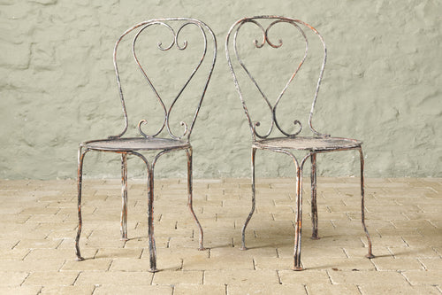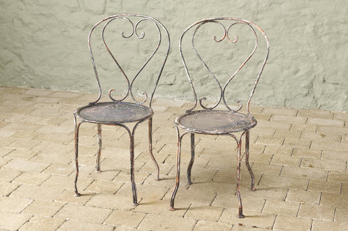 An elegant pair of hand-forged wrought iron chairs with heart-shaped backs, stamped metal seats and penny feet. In completely original condition they could be used inside, on the balcony or in the garden.