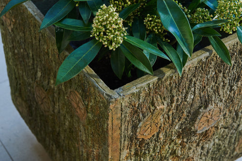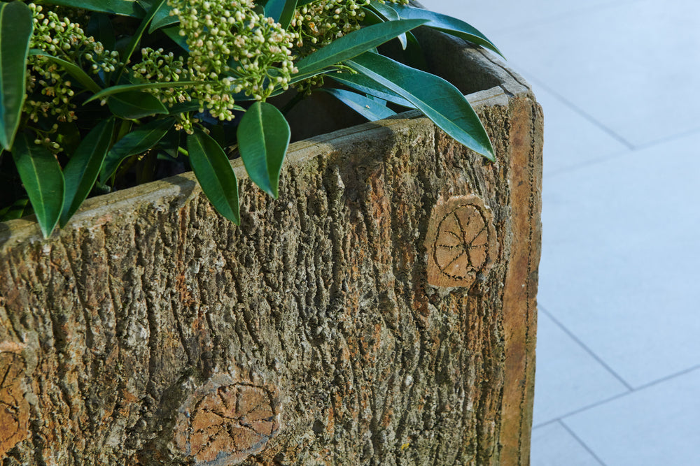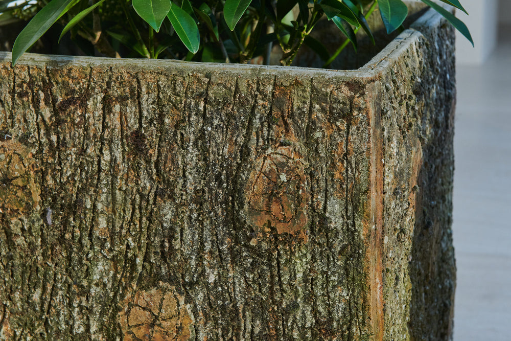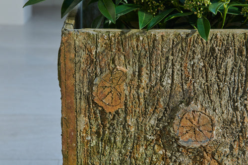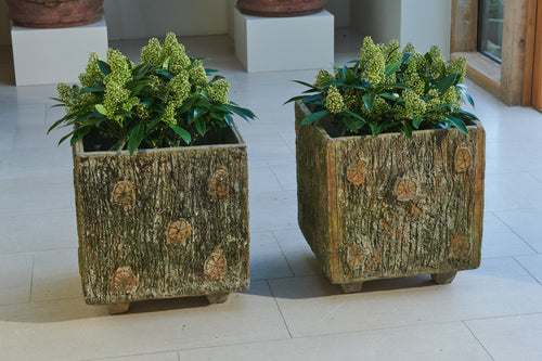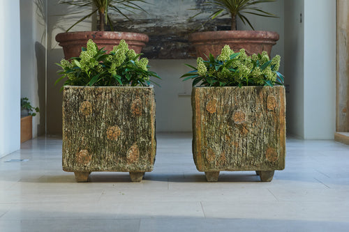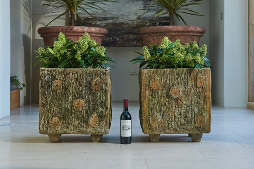 A particularly well made and realistic pair of faux bois planters. Made of cement and crafted to look like wood they are deep enough to allow the planting of a small tree. They would look great on either side of a front door or entranceway. They sit on small feet and have drainage holes.