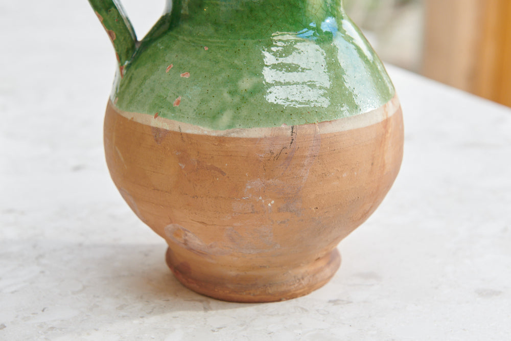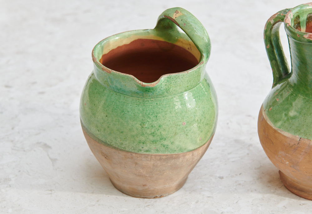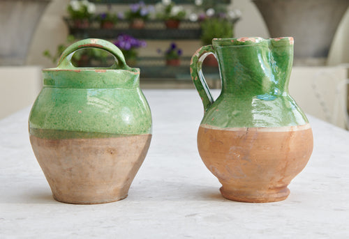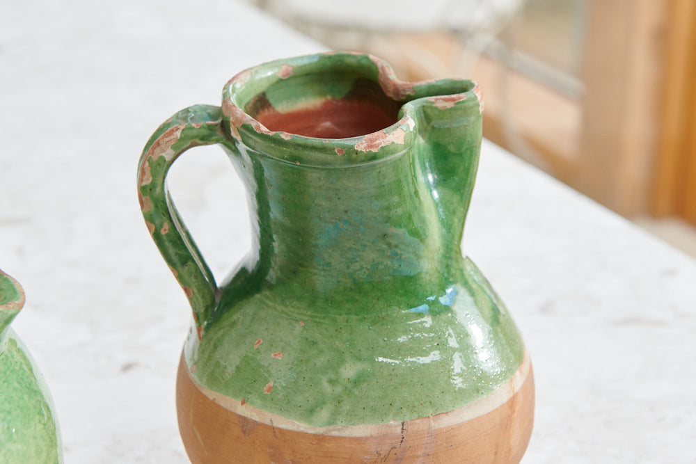 A lovely pair of terracotta 19th-century milk jugs with a matching green glaze. They now make a particularly attractive and unusual decorative duo.