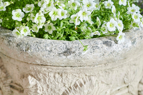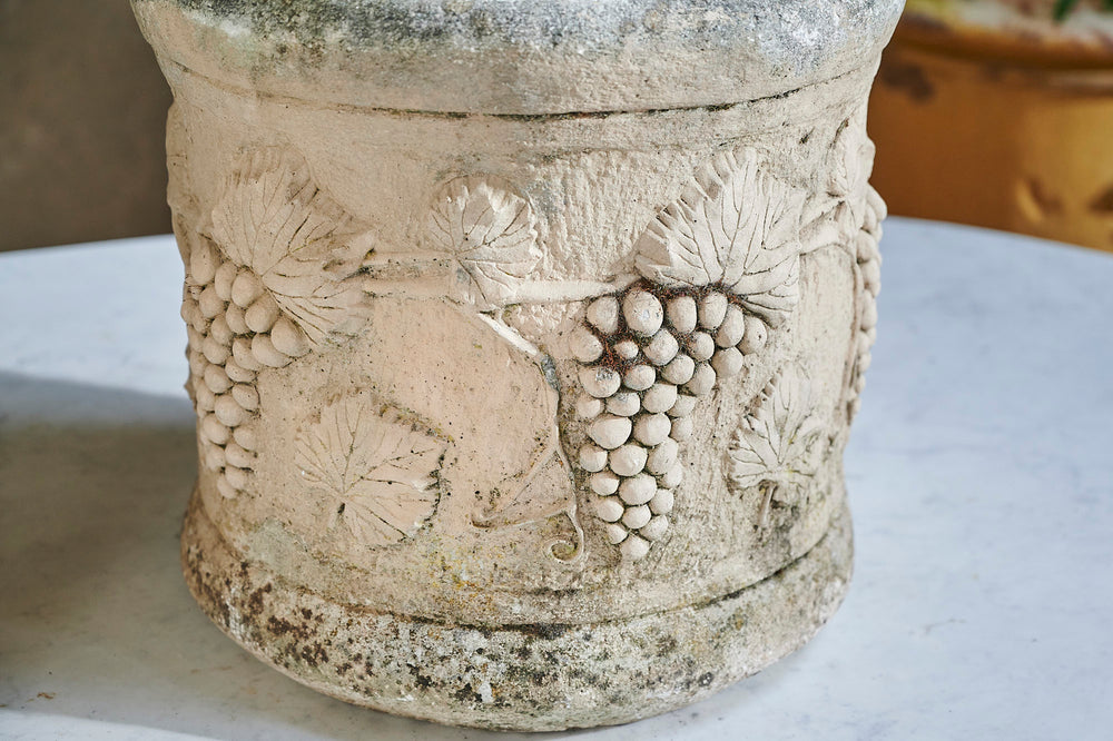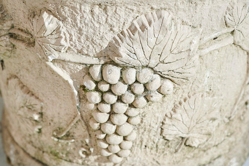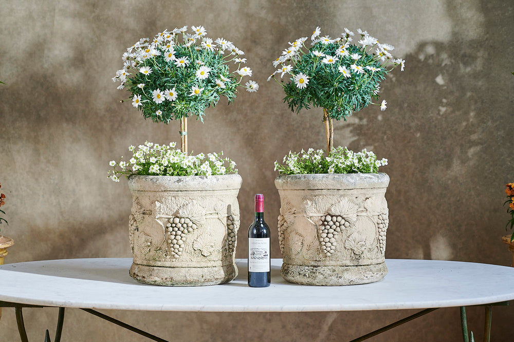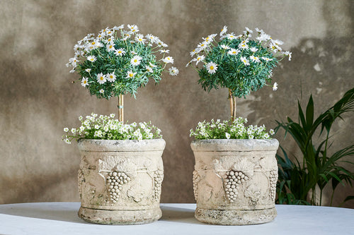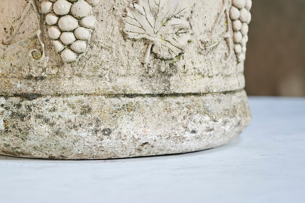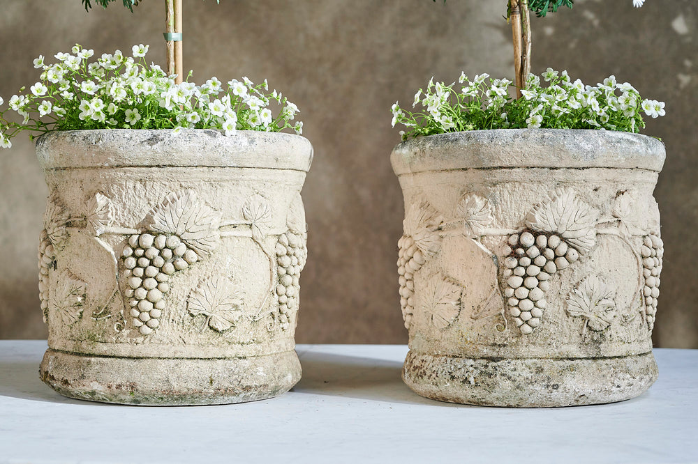 A lovely pair of composite stone garden planters. They are very well cast and feature a distinctive grape and vine design. These planters would fit seamlessly into any mature garden and whilst being deep enough to plant a small shrub they are also large enough to create an attractive display.
