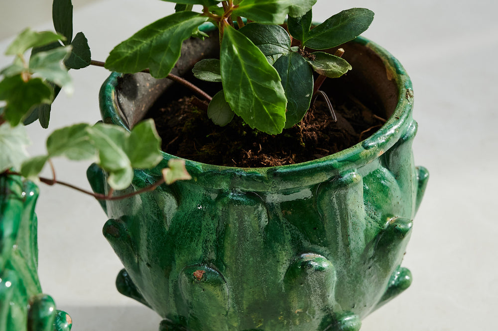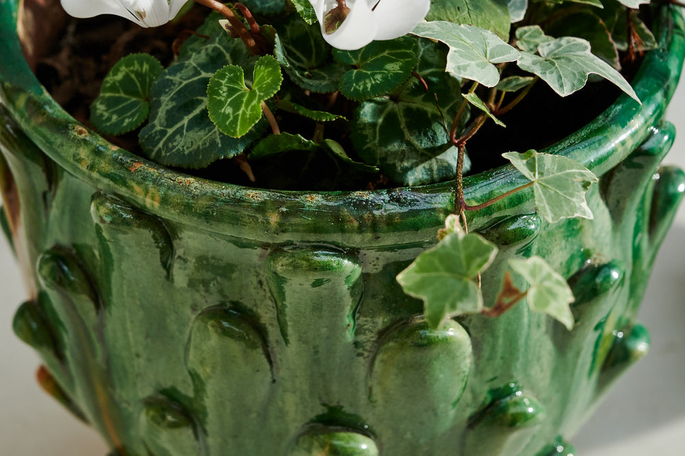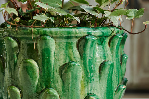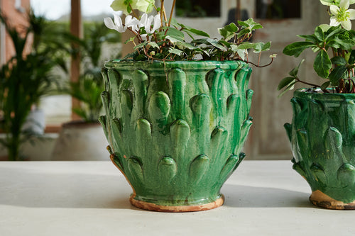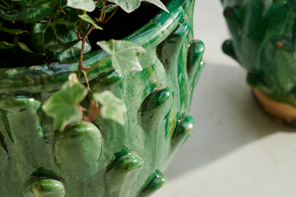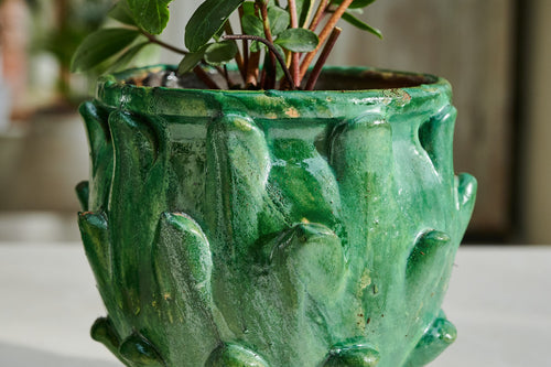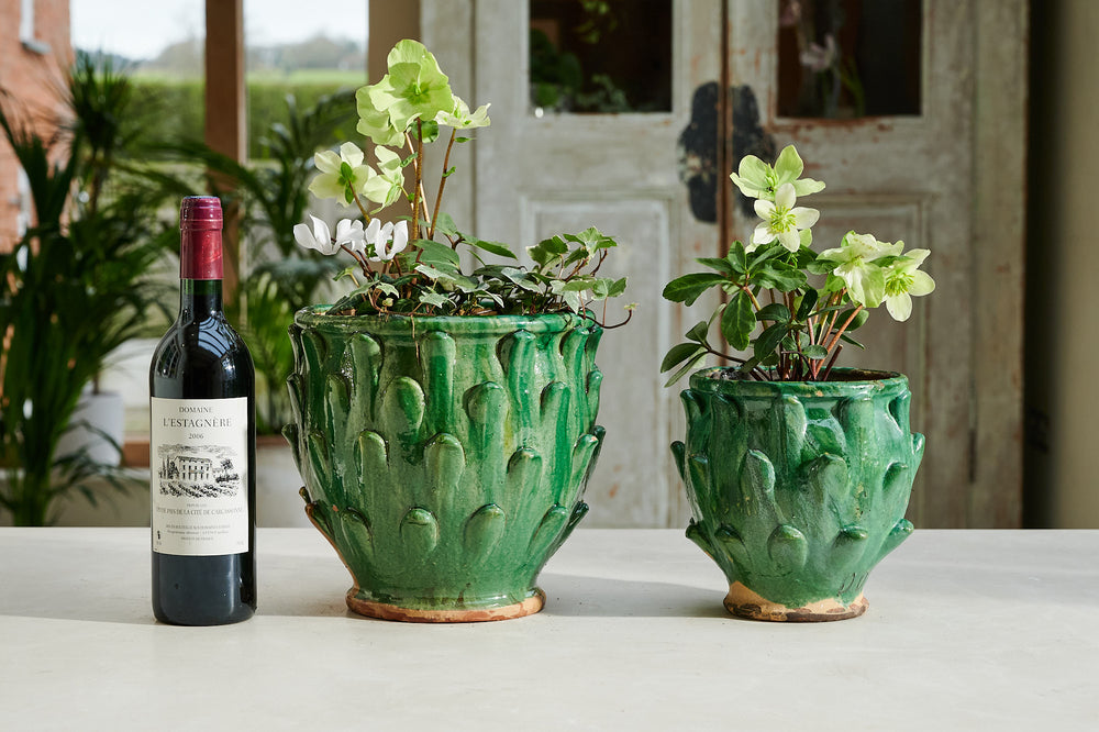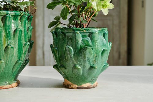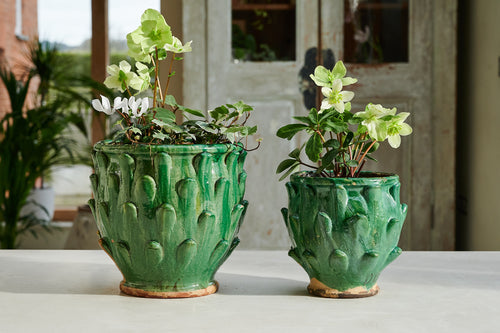 We found 5 dusty boxes of this Italian pottery in a market in Northern Italy and whilst they don't have a lot of age we could not resist these lovely decorative planters designed to mimic and artichoke. This little and large set is the last pair of green ones we have in stock.