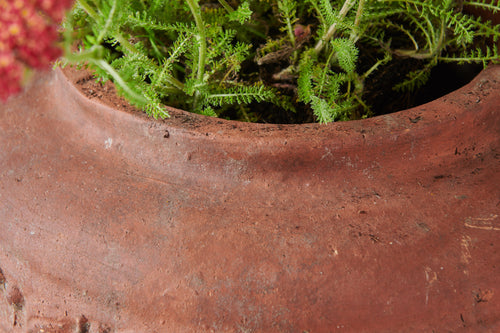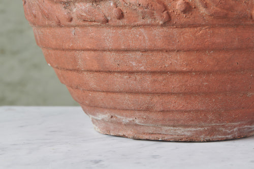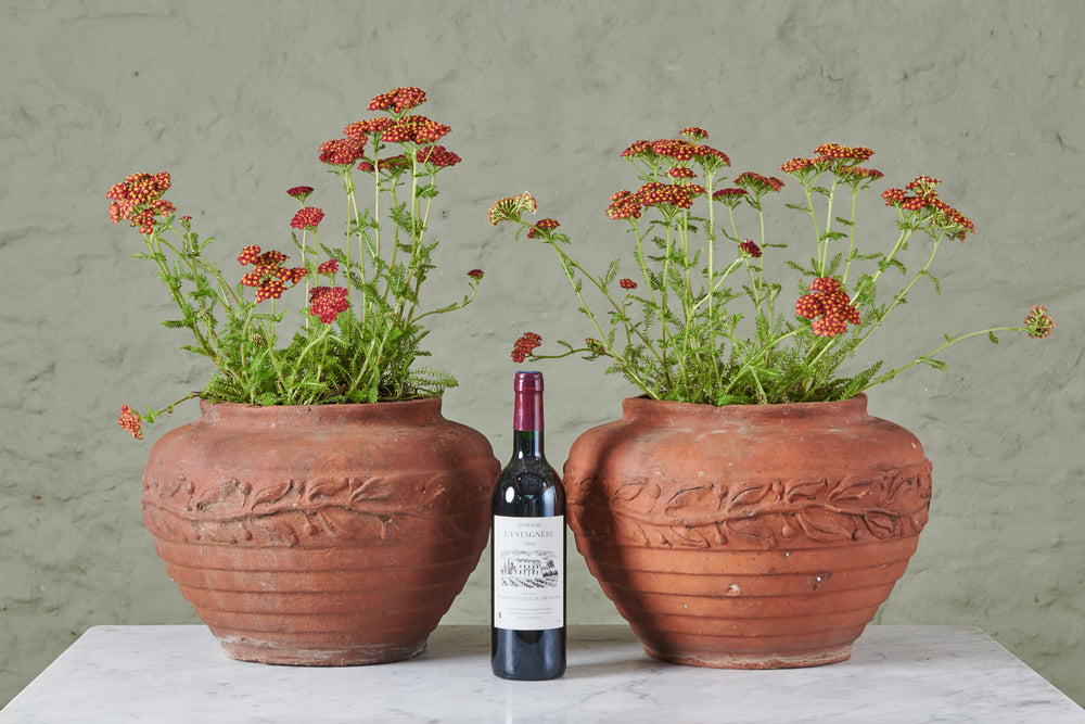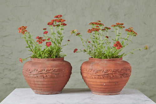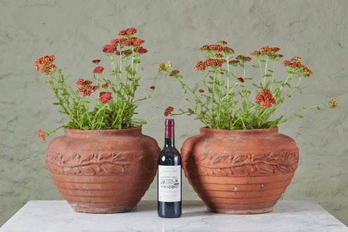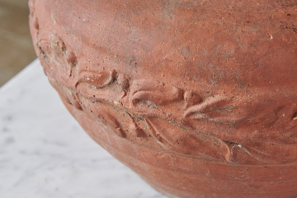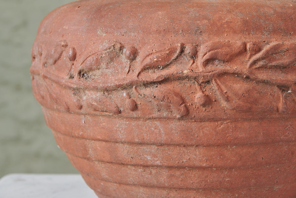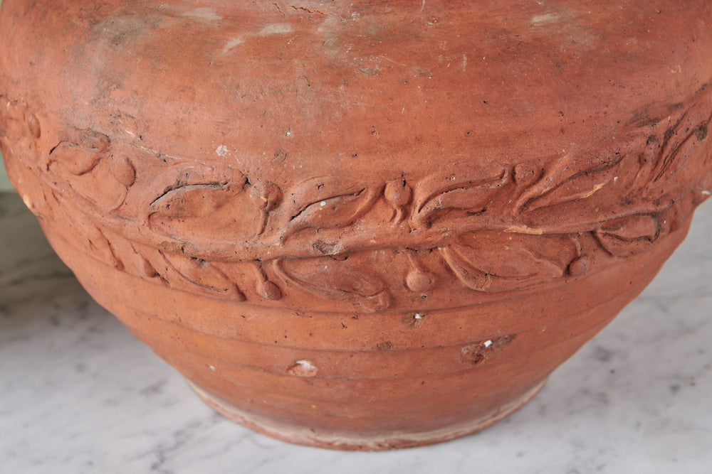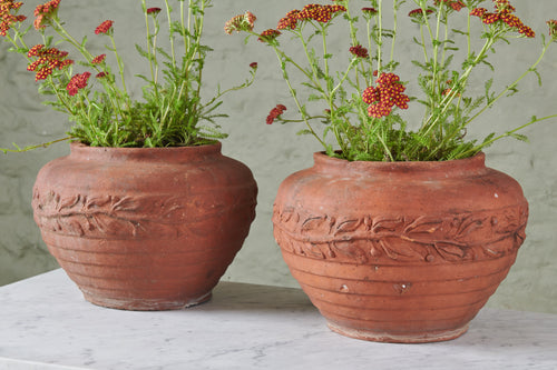 A pair of handmade 19th-century Italian terracotta planters. They are in good condition and feature a decorative leaf scroll on the main body.