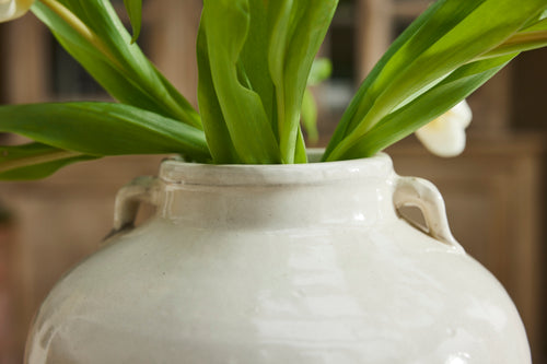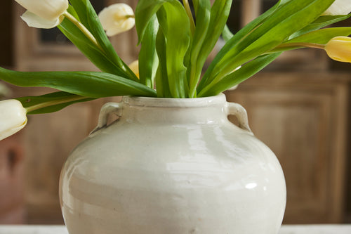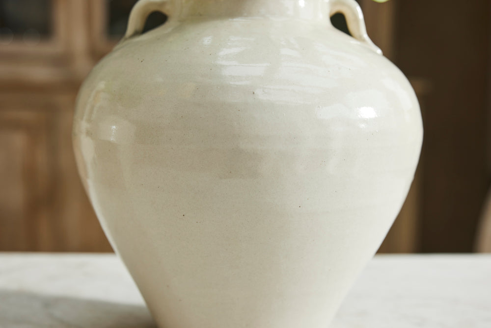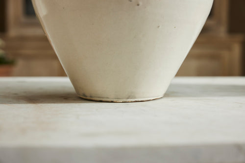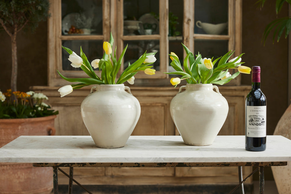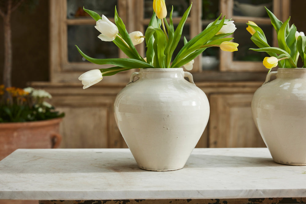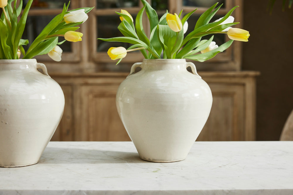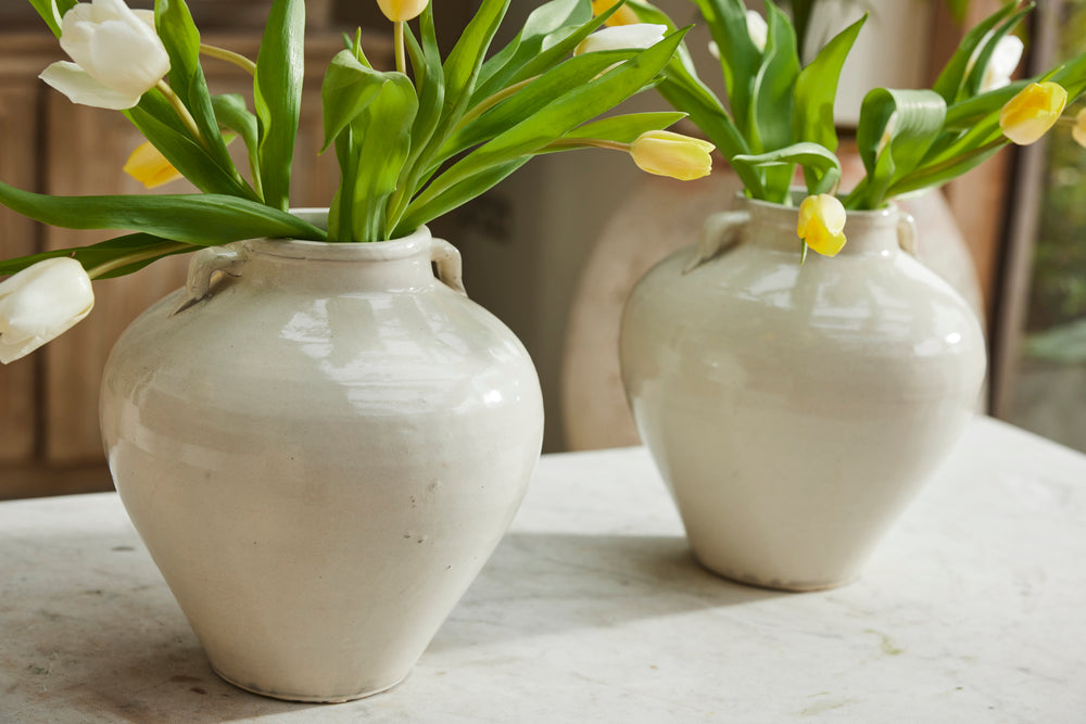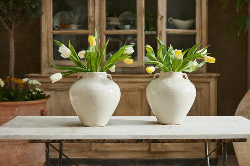 These beautiful Italian vases are in very good condition considering their age and use with only a minor chips here or there. We bought them because we loved the shape and therefore thought with the attractive white glaze that they would make a highly decorative addition to any home further enhanced with small plant or flowers.