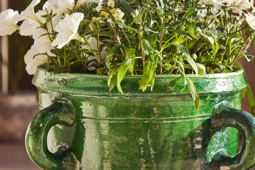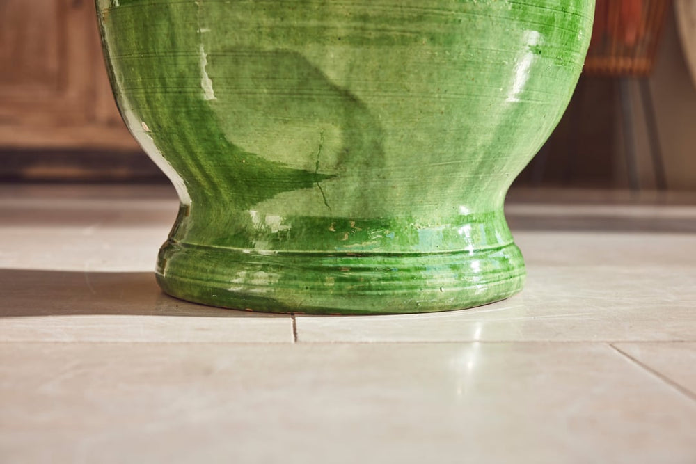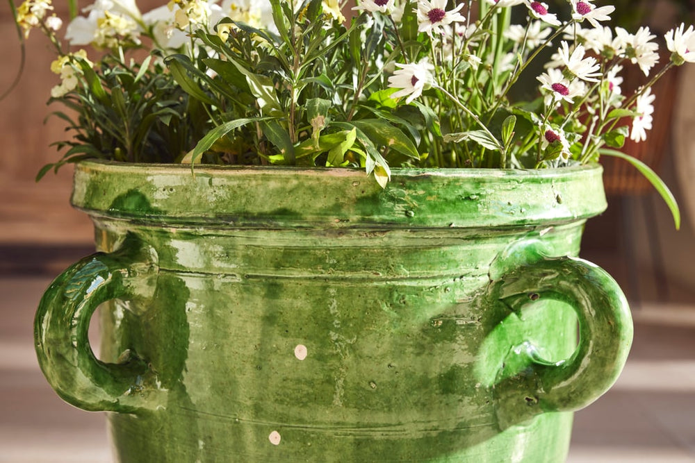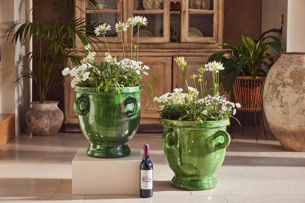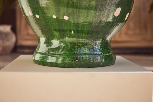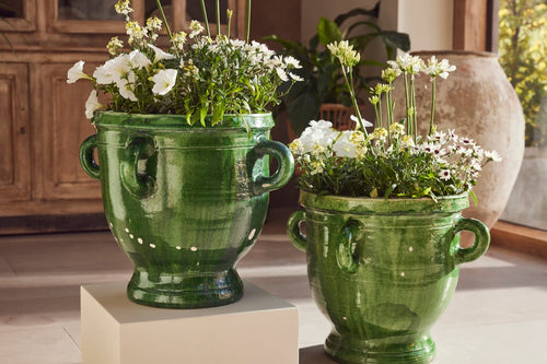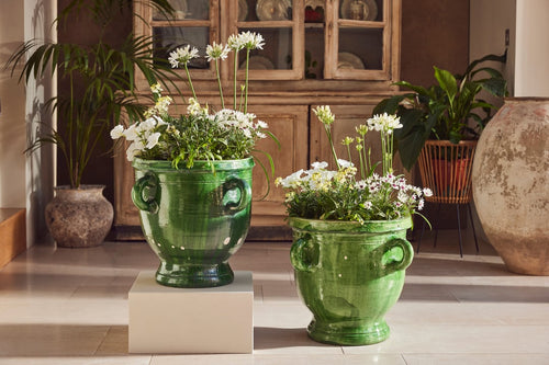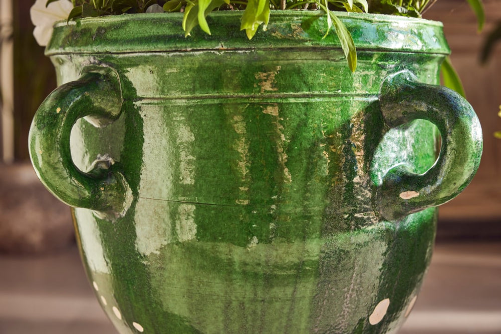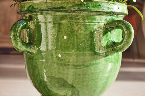 This beautiful pair of terracotta urns hail from Castelnaudary, a village in the South of France known for its fine pottery traditions. Originally used for storing dry goods such as seeds or flour they are hand-thrown and finished with a stunning green glaze that has aged gracefully over time—rich, glossy, and full of depth.