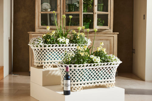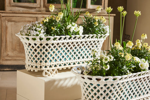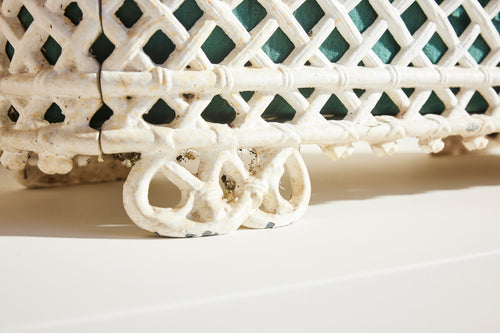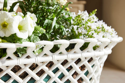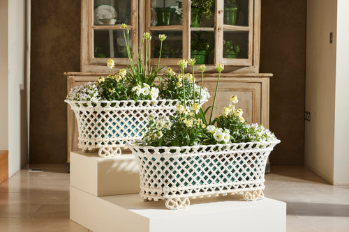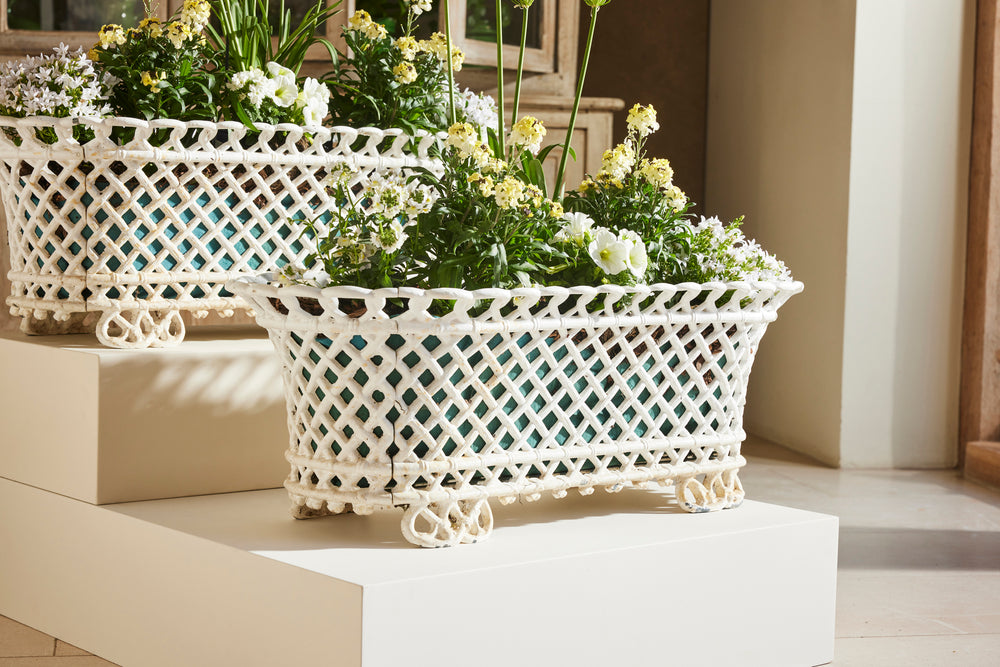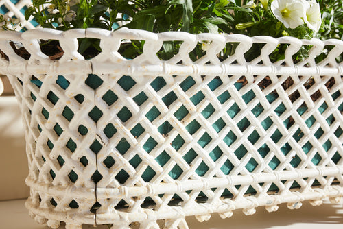 An attractive pair of latticework planters from the 1960s. Inspired by an original cast iron design from the19th century these aluminium versions are equally as attractive and provide a very similar decorative impact. In very good condition they would suit a modern or traditional garden and are perfect for seasonal planting.