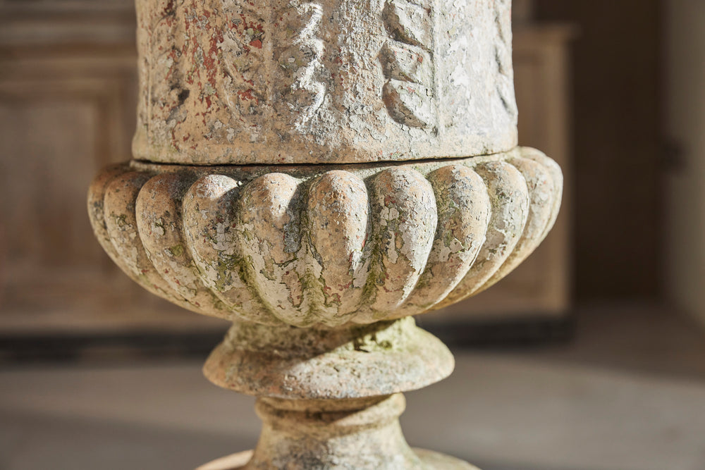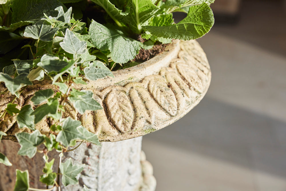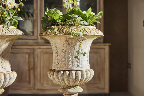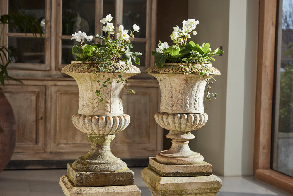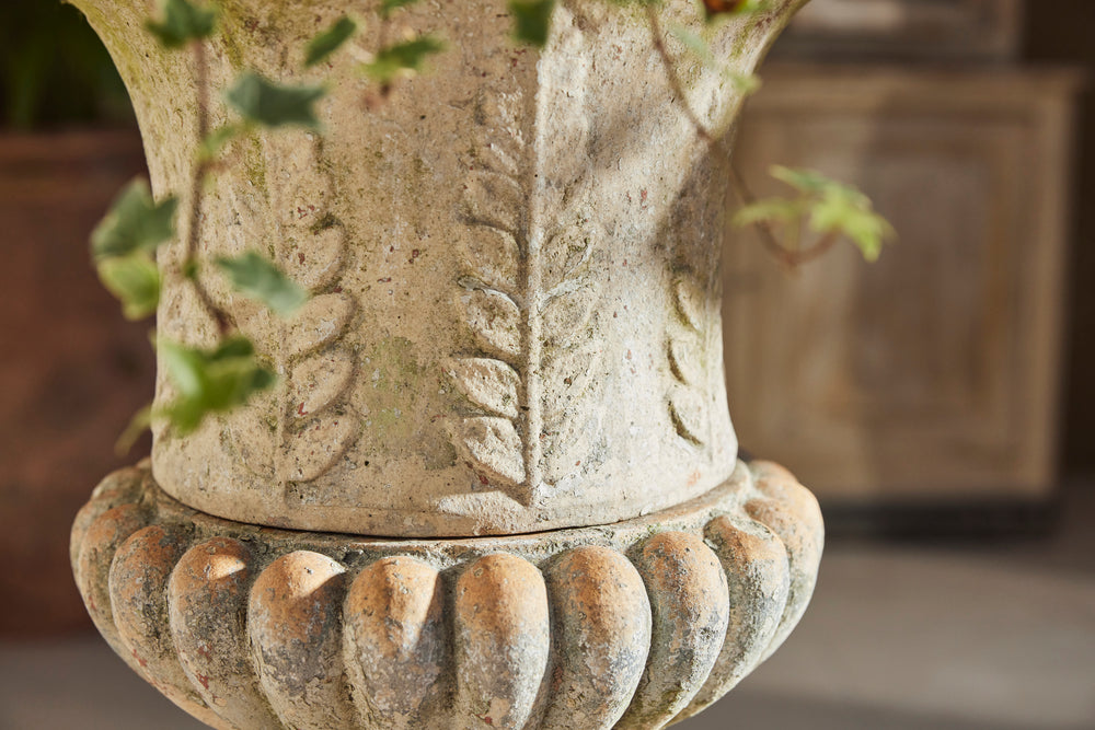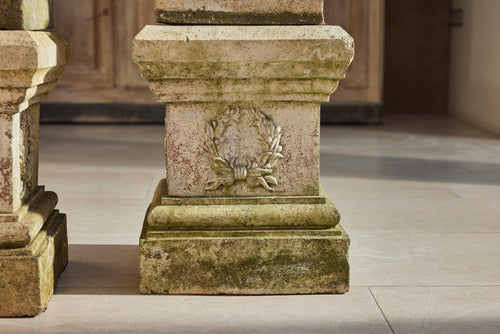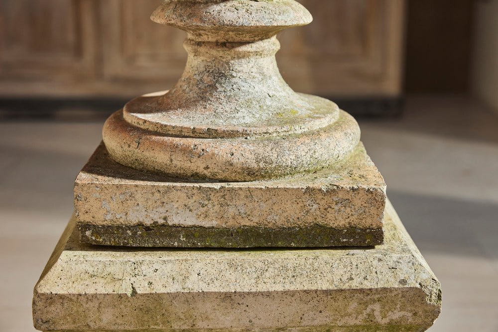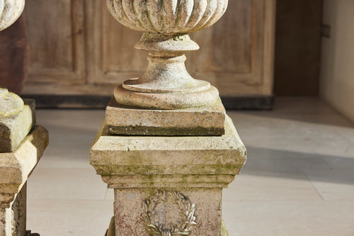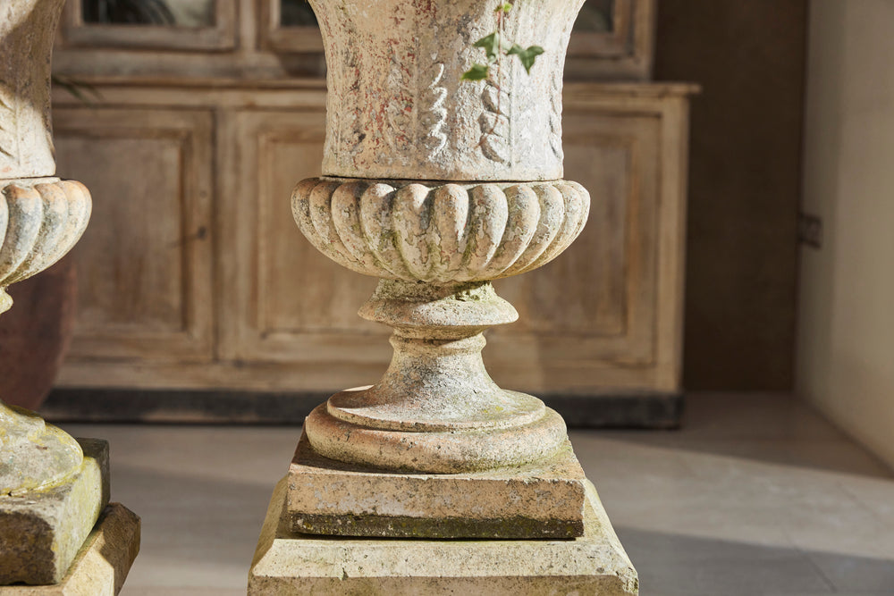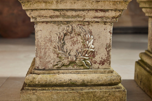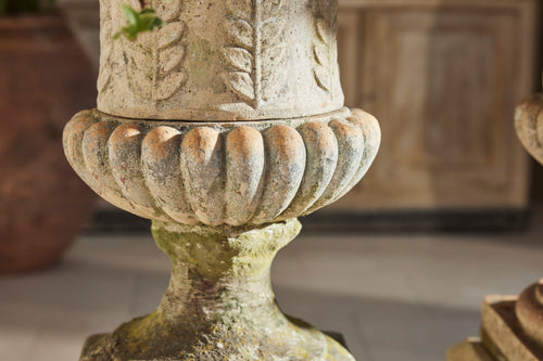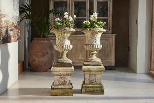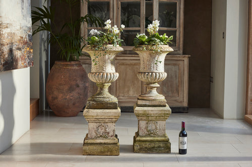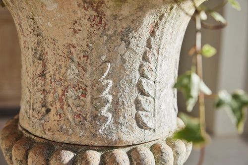 A stunning pair of early 20th-century glazed stoneware urns by the Leeds Fire Clay Company Ltd (LEFCO), each consisting of three parts with intricately decorated bodies resting on square plinths. Impressed with the ‘LEFCOWARE’ mark, these urns are original examples of the company’s fine craftsmanship.