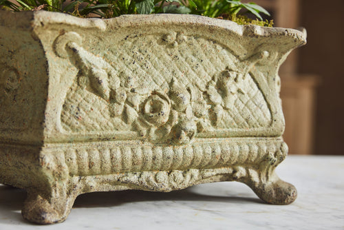Small cast iron jardinieres with a cross-hatched body, finished with a floral garland motif on both sides.They stand on raised feet to allow effective drainage.