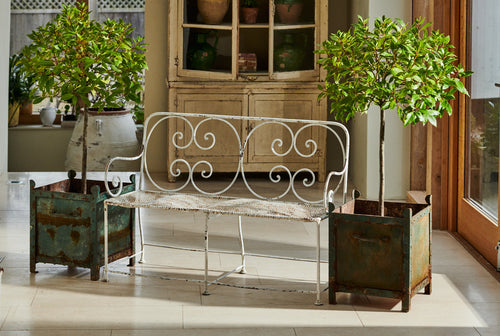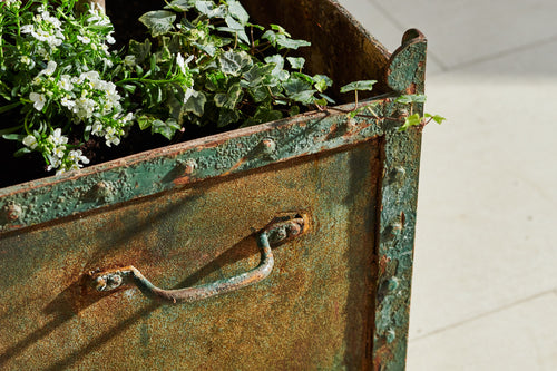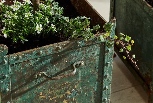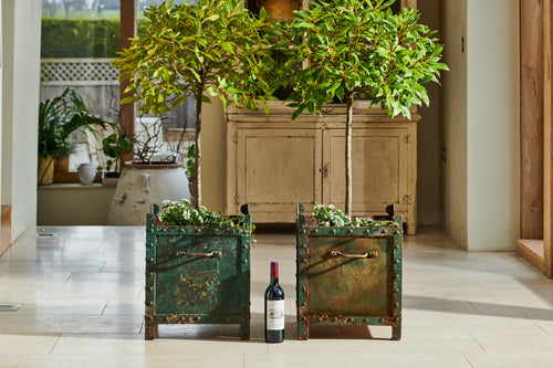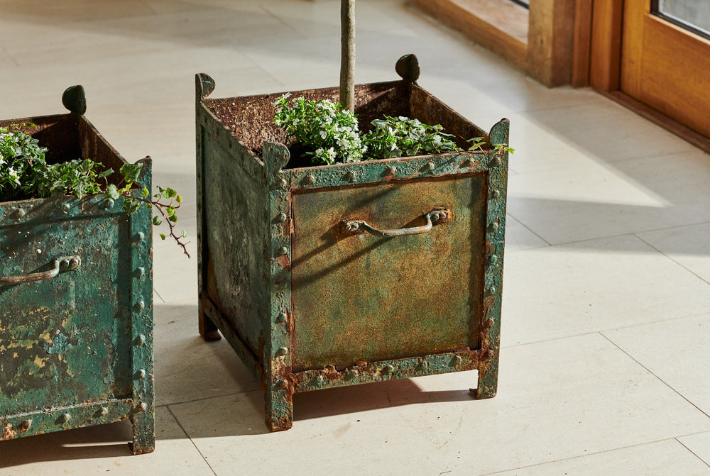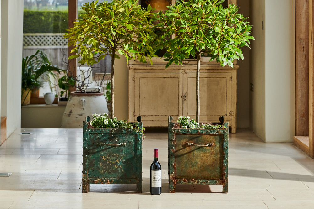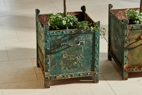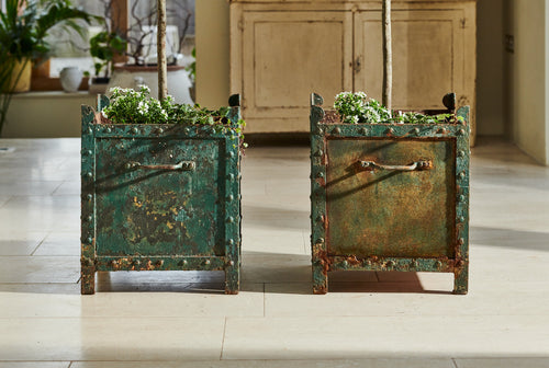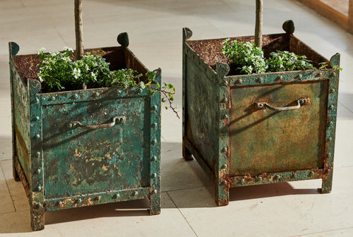 A pair of very substantial 19th-century planters that would have originally been used in an orangery. Made of metal with a handle on either side they are riveted together on a solid wrought iron frame. they have developed an attractive green patina over the years and would look very good on either side of a front door planted with a small tall tree.