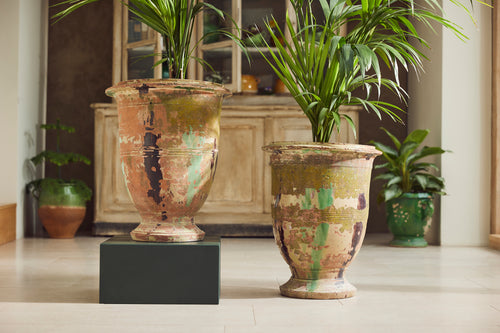 These 19th century "Petit Jarre d'Anduze are becoming increasingly difficult to find. They were made in around 1850 by Louis Bourget for Poterie de la Madeleine. Both urns have traces of original glaze and a clear outline of the maker's mark as can be seen in the photos. Anduze, a small village in the foothills of the Cevennes ranges which grew famous as early as the 17th century for its terracotta pots, urns and jarres.
