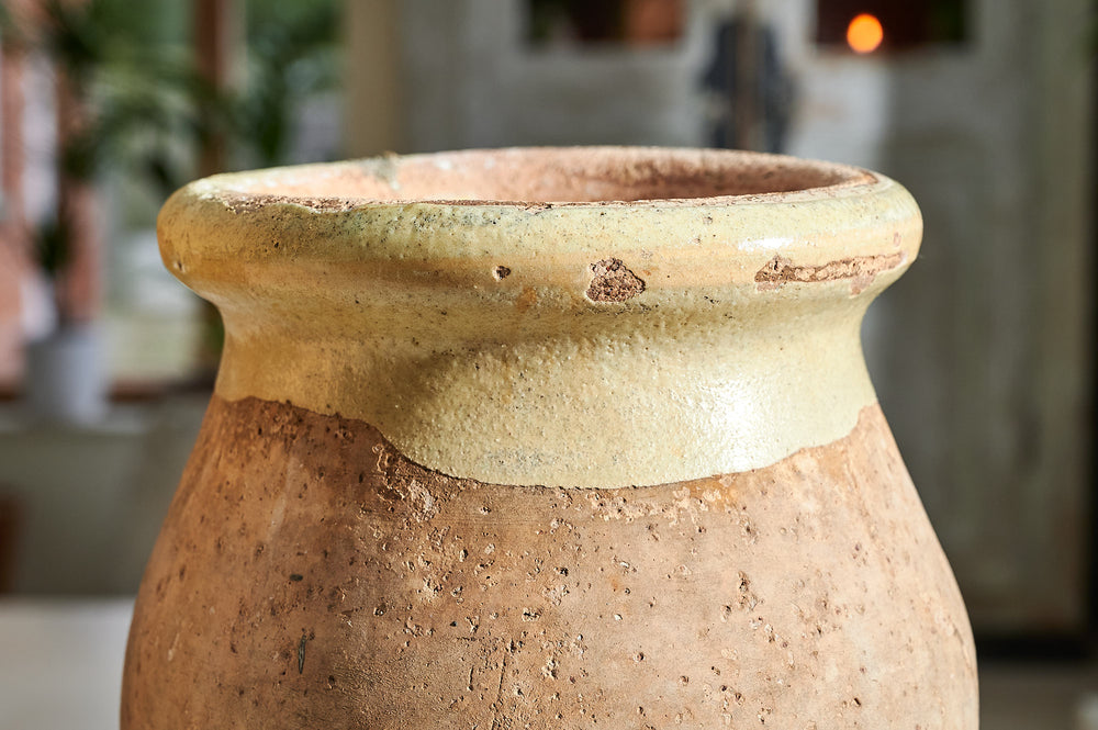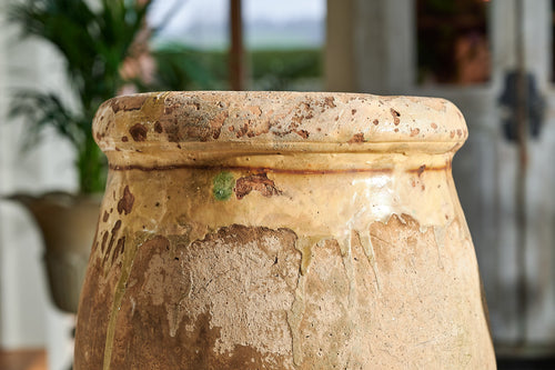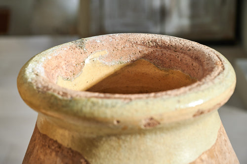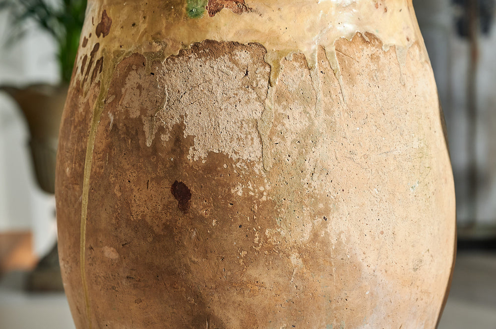 They are distinctive for their shape and also for the drips of glaze tumbling down the sides and around the rim They were used to preserve and transport olives or store flour.