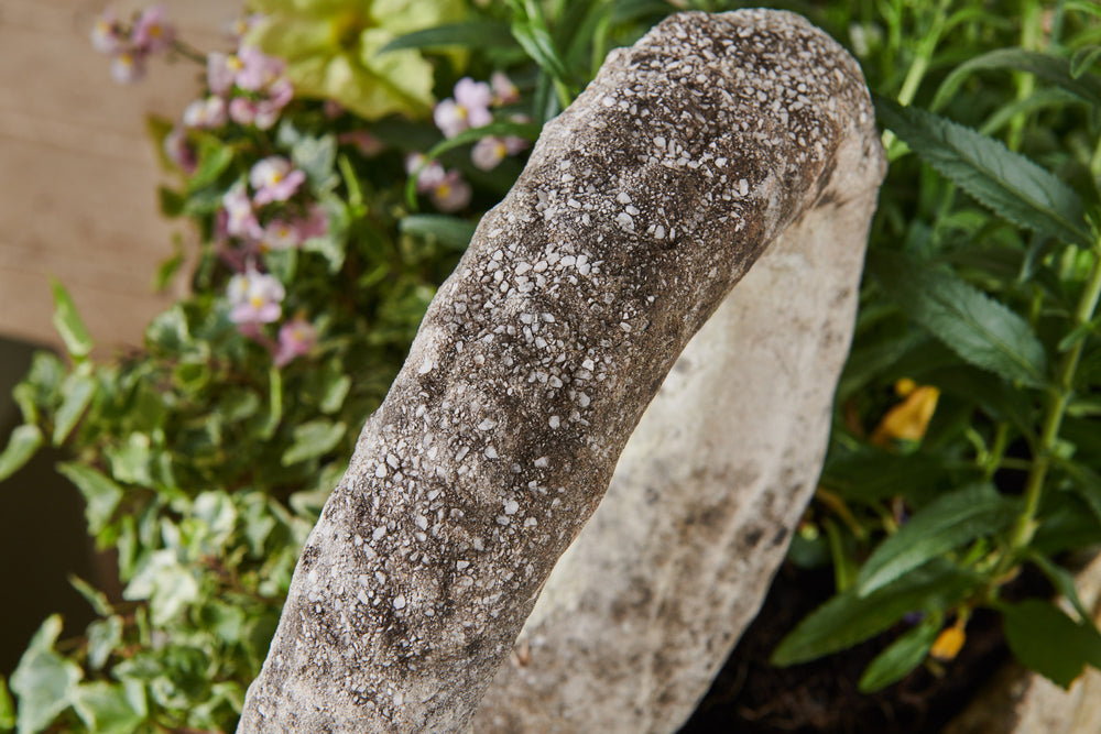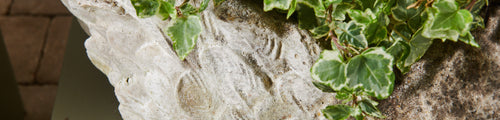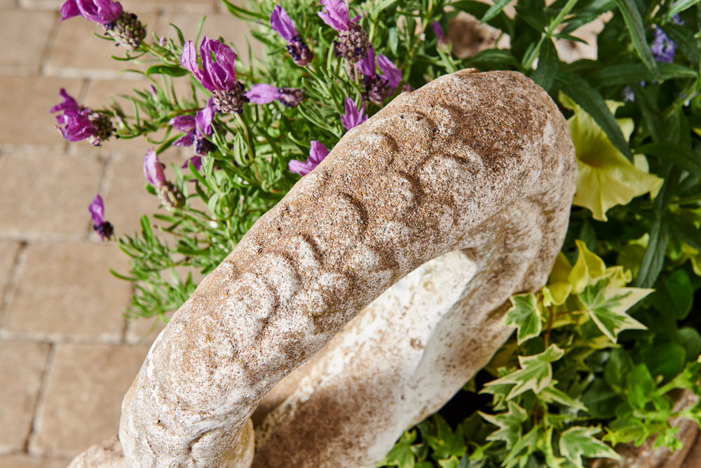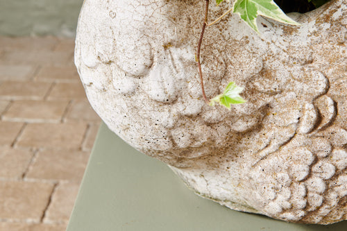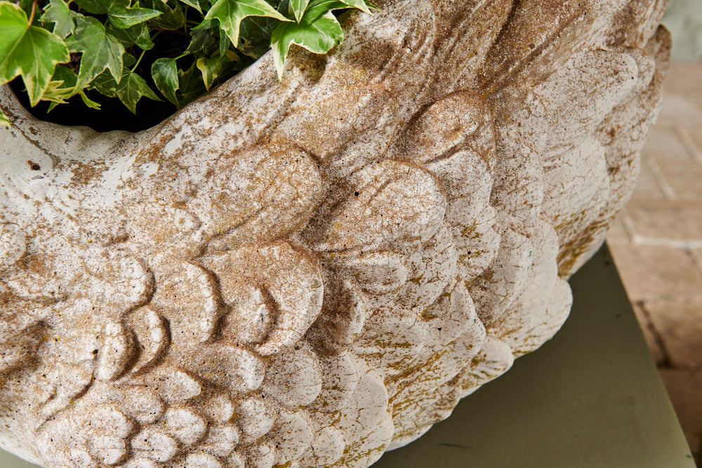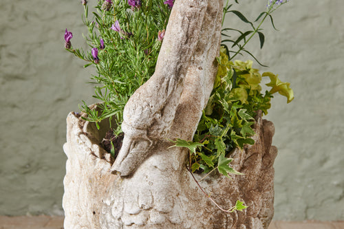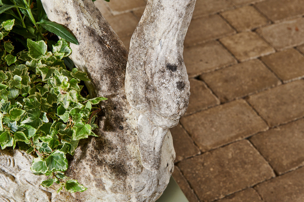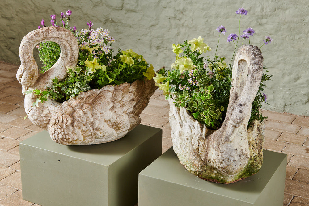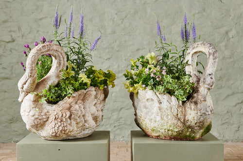A pair of composite stone swan planters from the 1930s which are becoming increasingly rare to find. They have beautifully curved necks and well-defined feather detail in the body. Dappled with a mossy patina they would be perfect for summer planting.