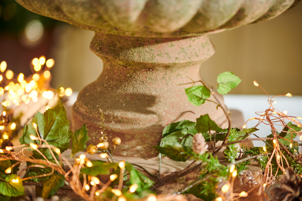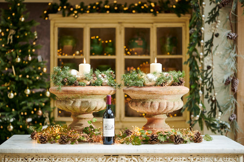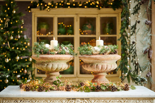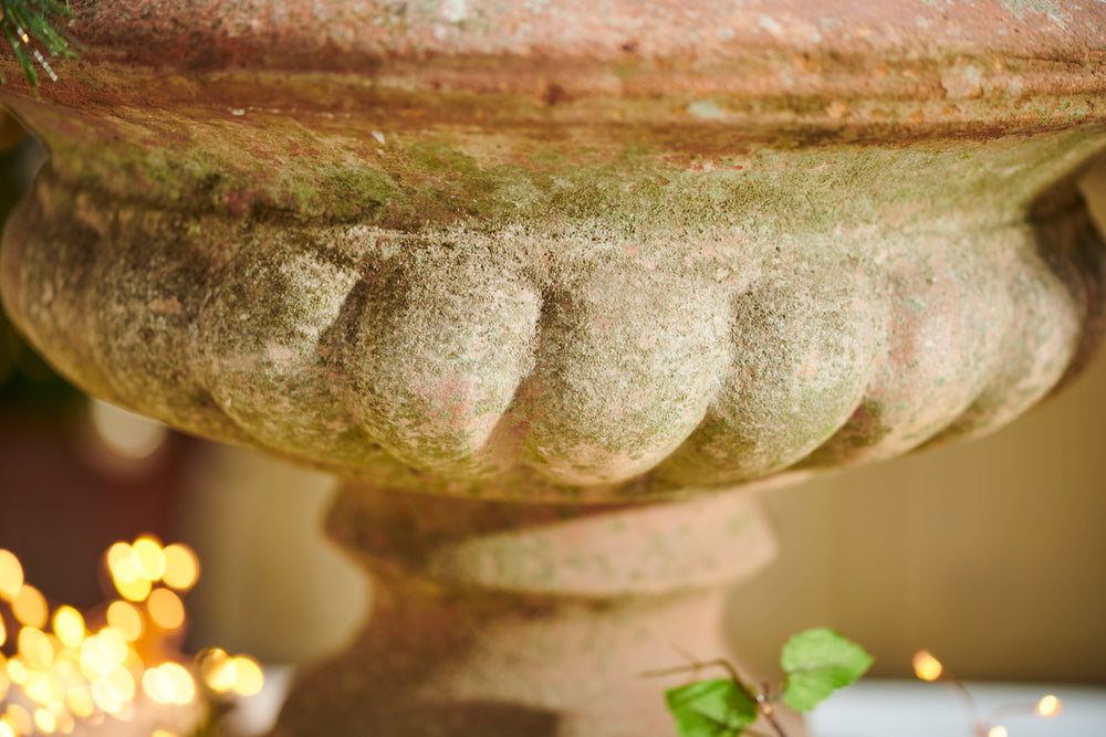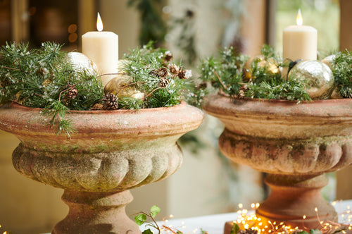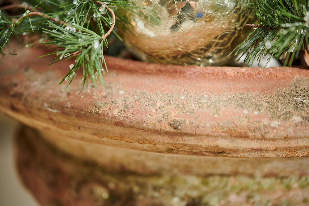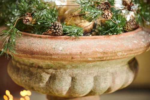 A pair of matching terracotta urns with an attractive and weathered patina. In very good condition we love them styled with baubles and candles. Outside of the festive period, they are course lovely planters for the garden with the size to house a small shrub or seasonal plants.