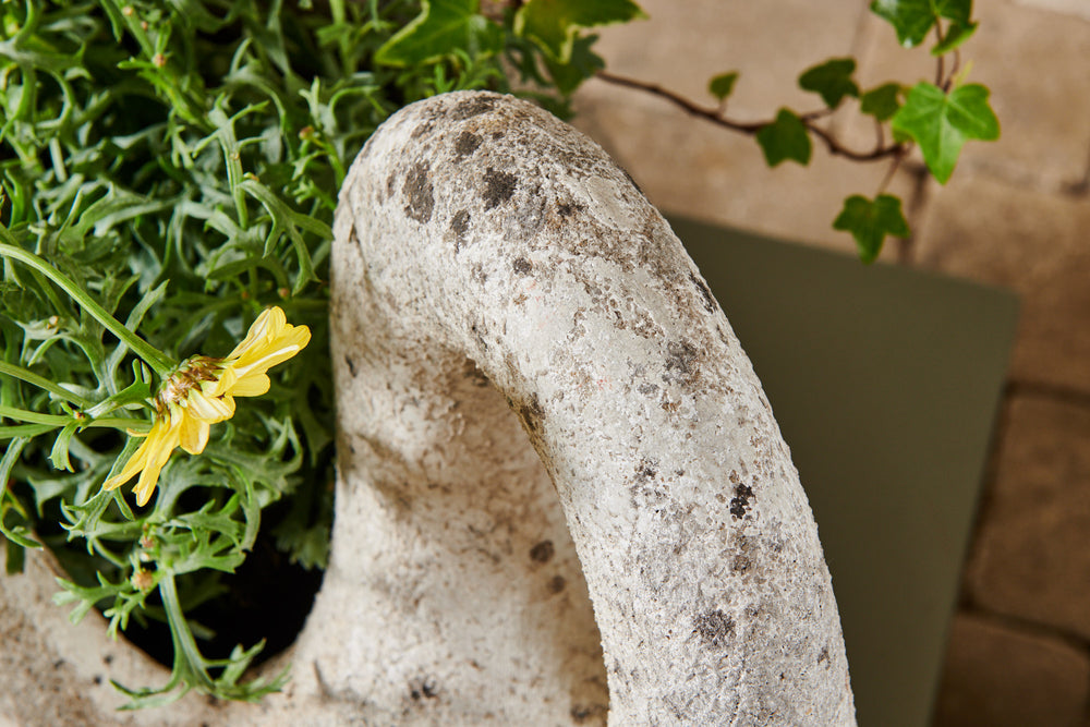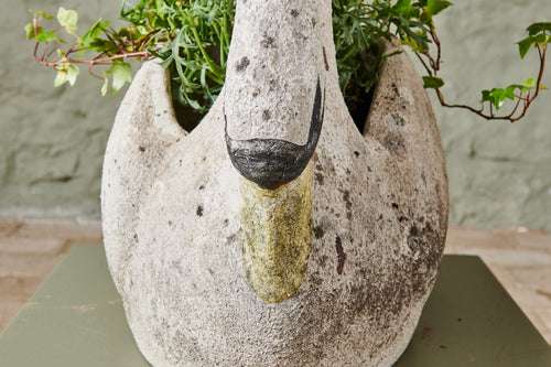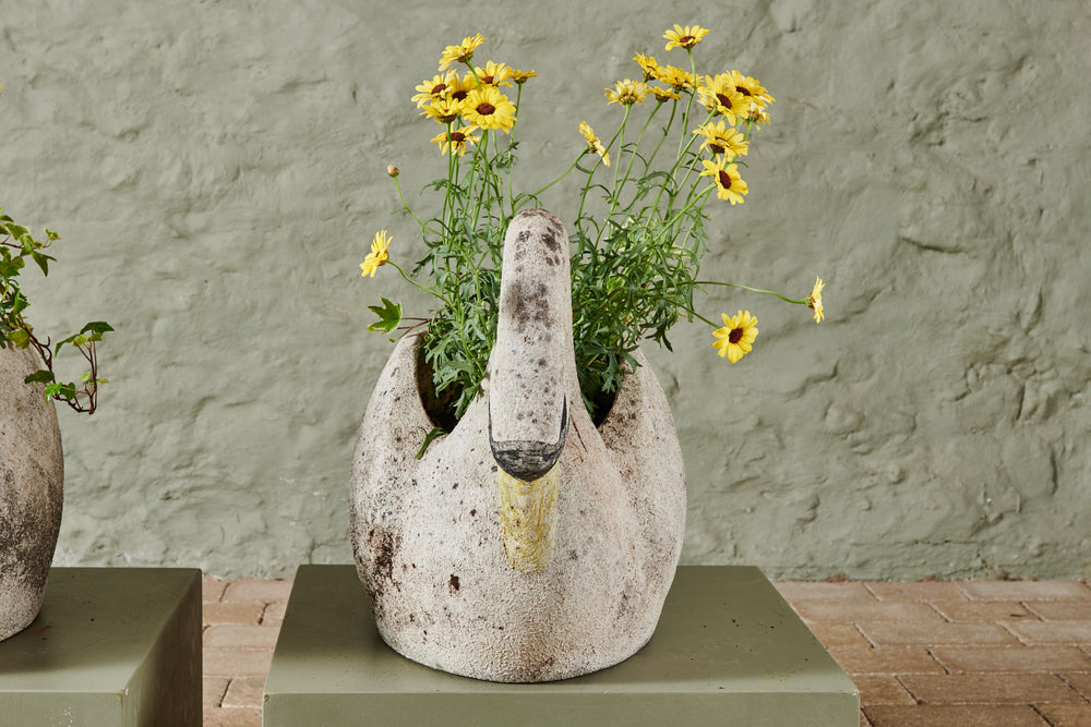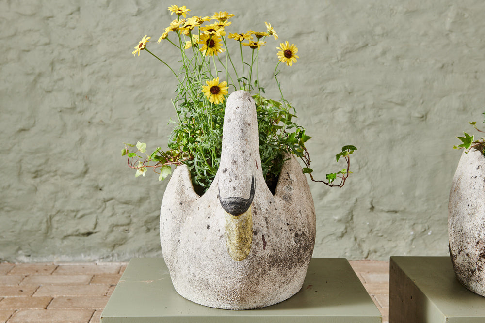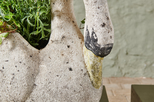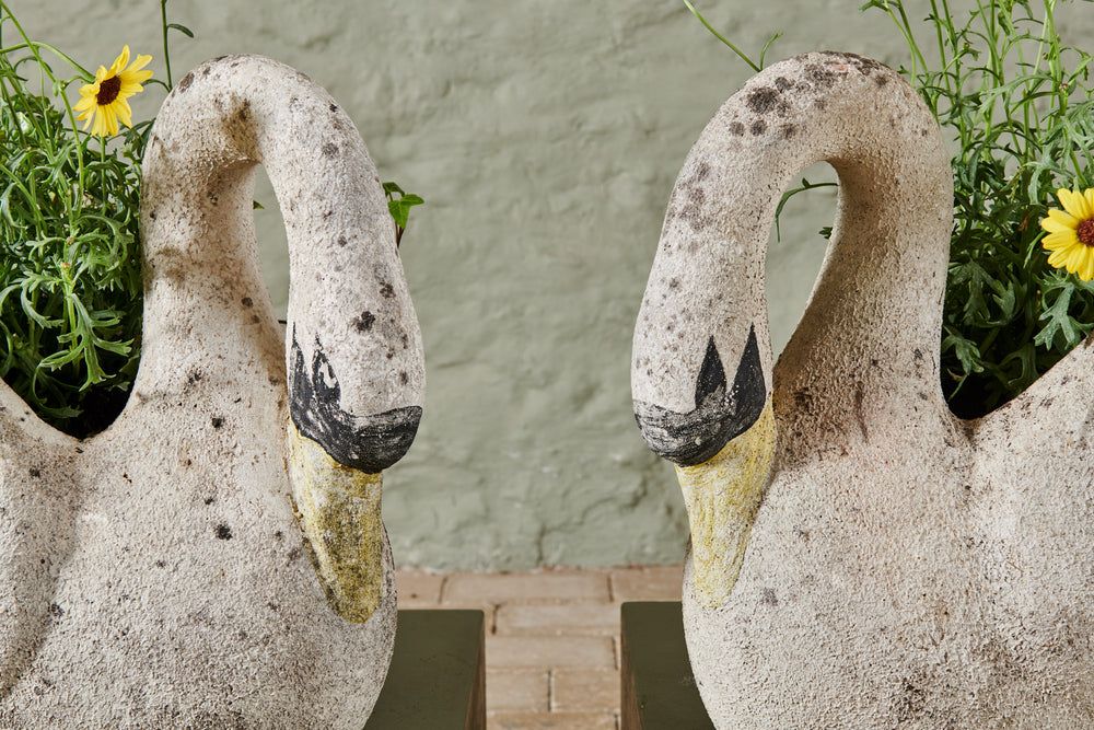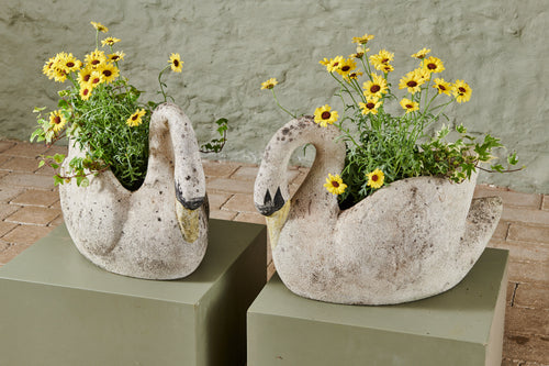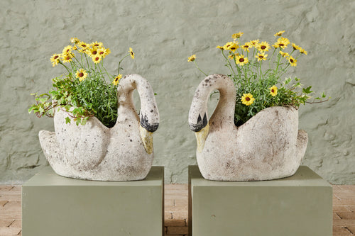 A pair of composite stone swan planters. There is something about the graceful shape of the swan that lends itself perfectly to planters and they look fabulous with a delicate, floral planting scheme. However, they are lovely enough to be stand-alone ornaments without any planting. The patina on this pair of swans gives them a gorgeous, natural finish, and the painting on their faces and bills adds real character