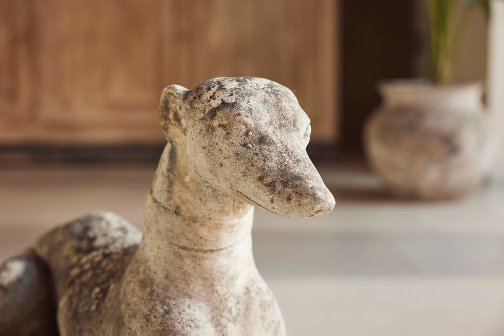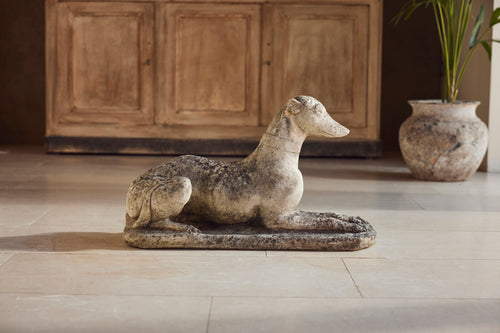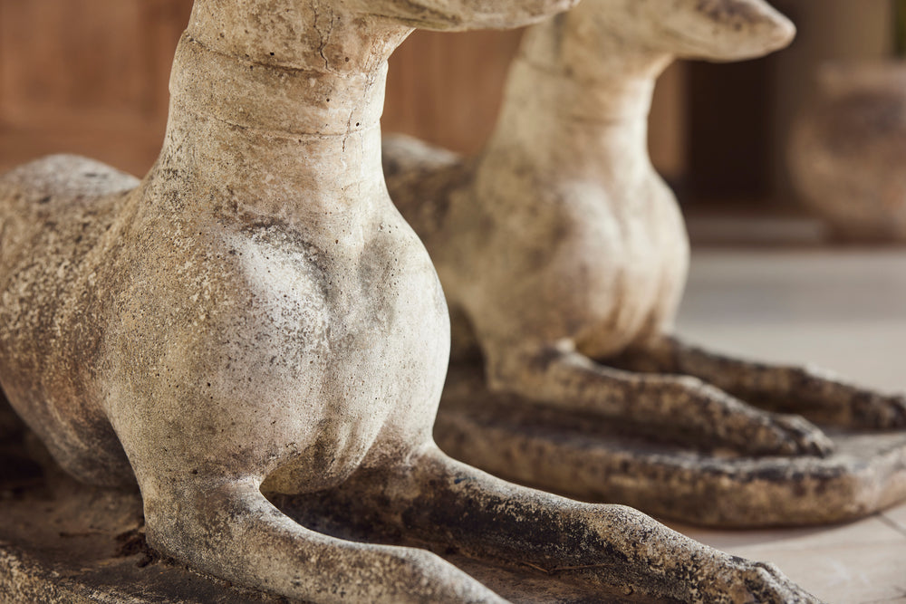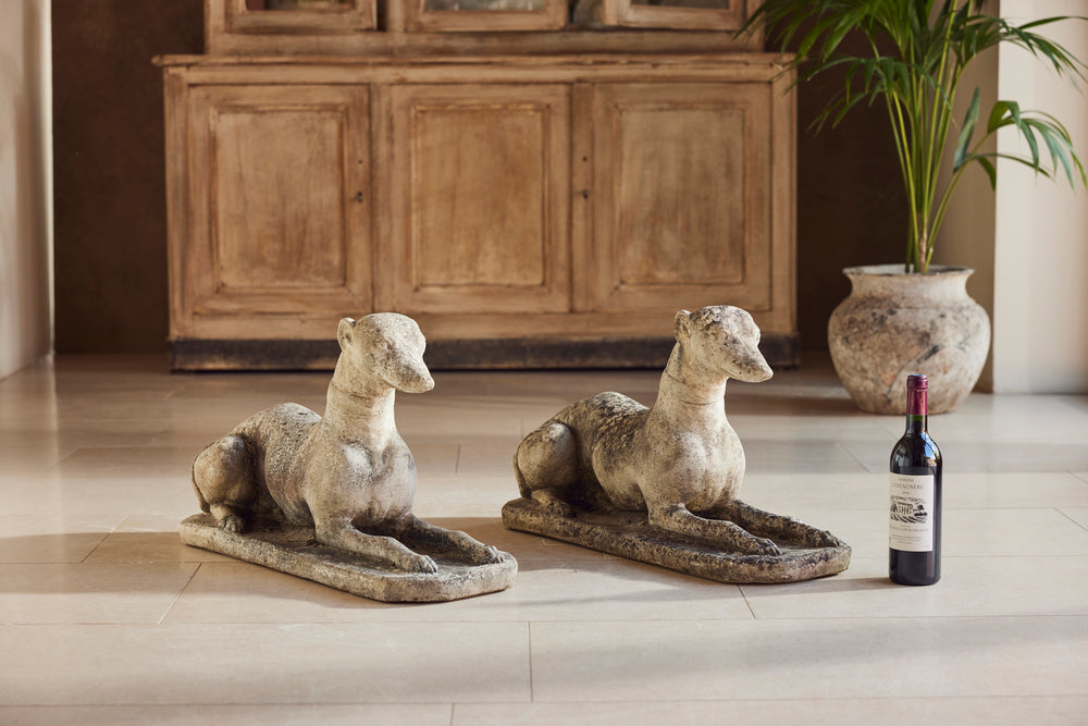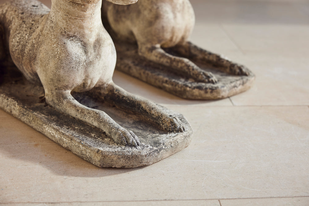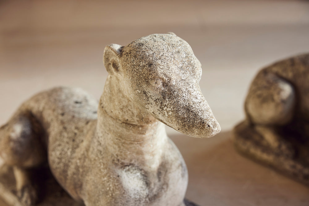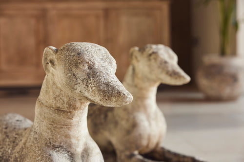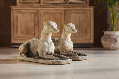 A lovely cast stone pair of garden whippets for the 1960s. This handsome pair which are in very good condition would look superb sat either side of door or pathway. With an attractive moosy patina and intricate detail on the collar, the tail and the feet they would feet they could be a focal point in any garden.