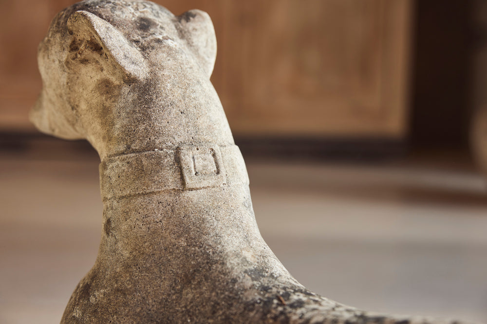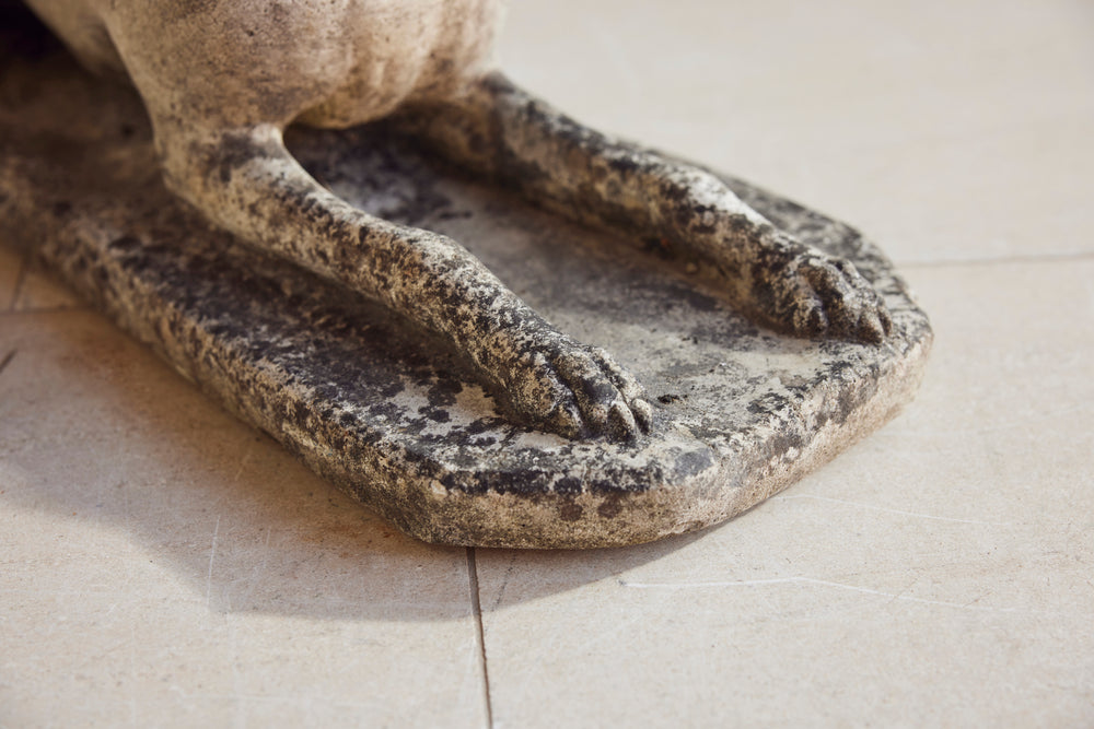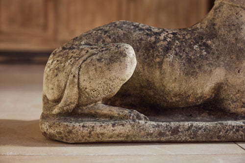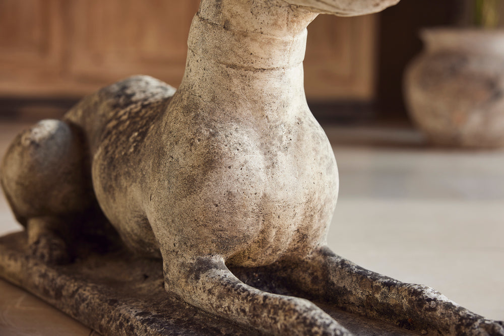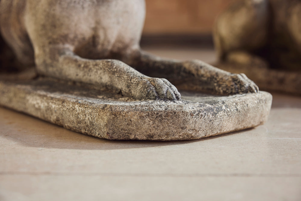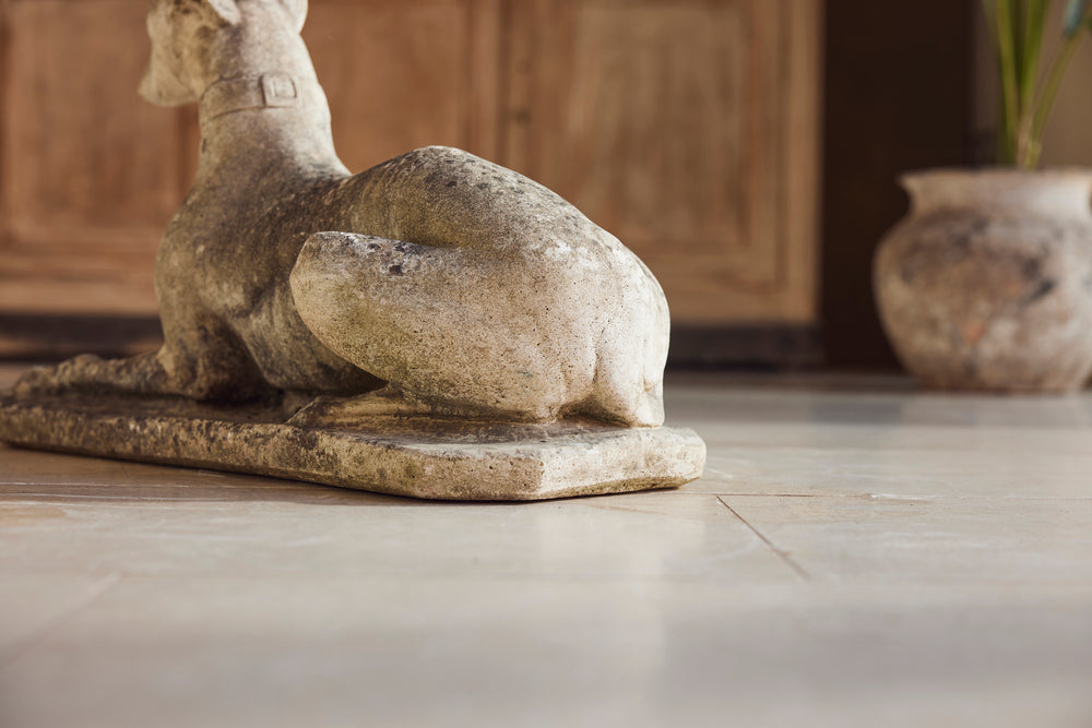 A lovely cast stone pair of garden whippets for the 1960s. This handsome pair which are in very good condition would look superb sat either side of door or pathway. With an attractive moosy patina and intricate detail on the collar, the tail and the feet they would feet they could be a focal point in any garden.
